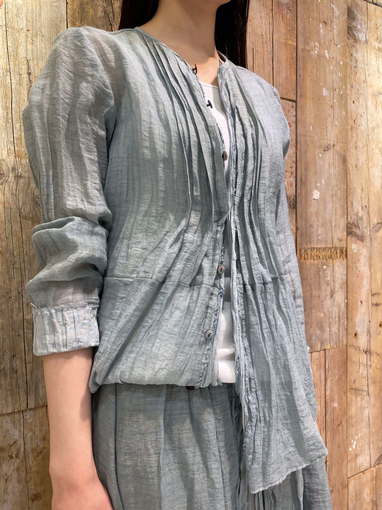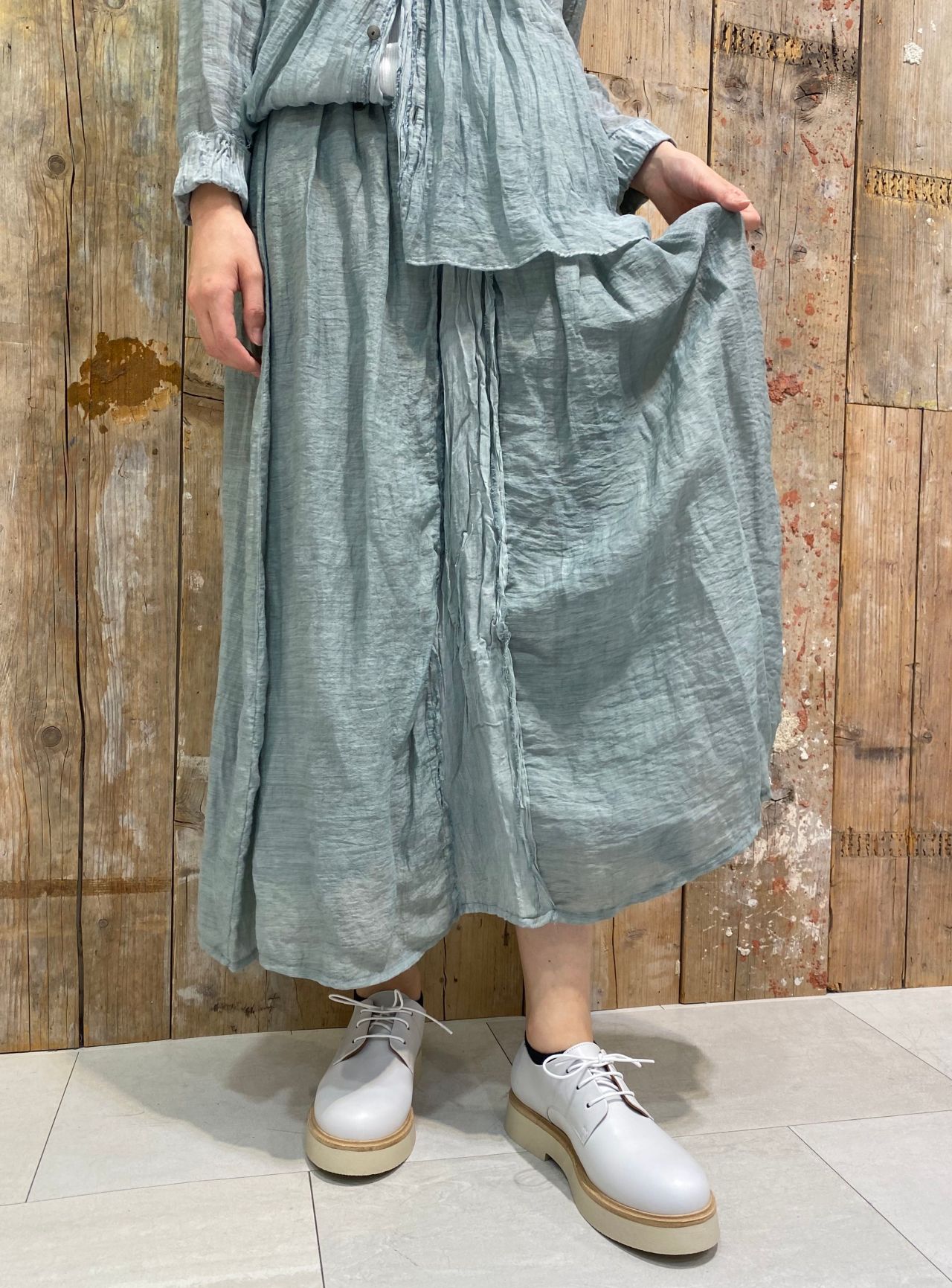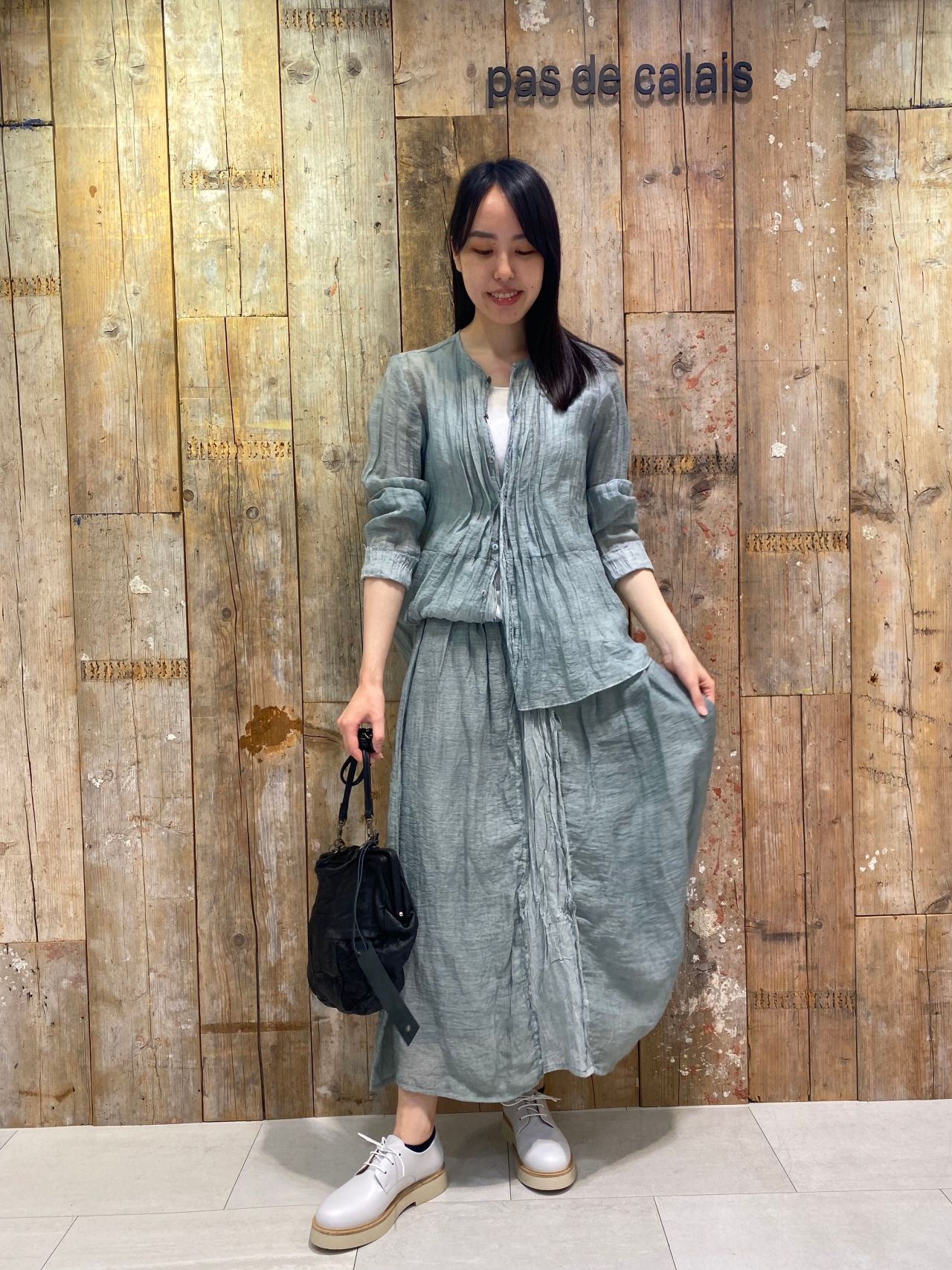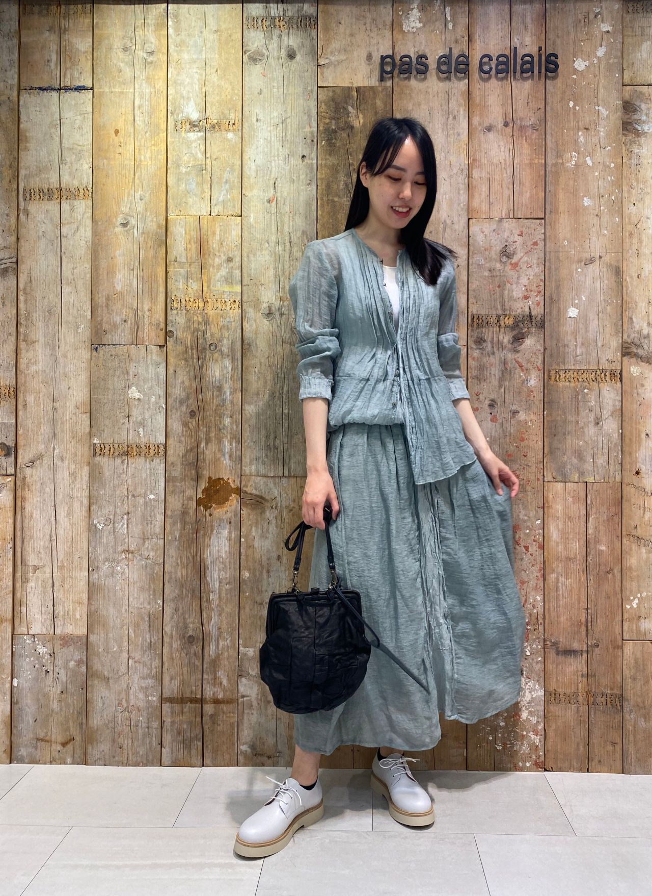 程よい透け感と優しいグリーンが春らしいブラウスとスカート。