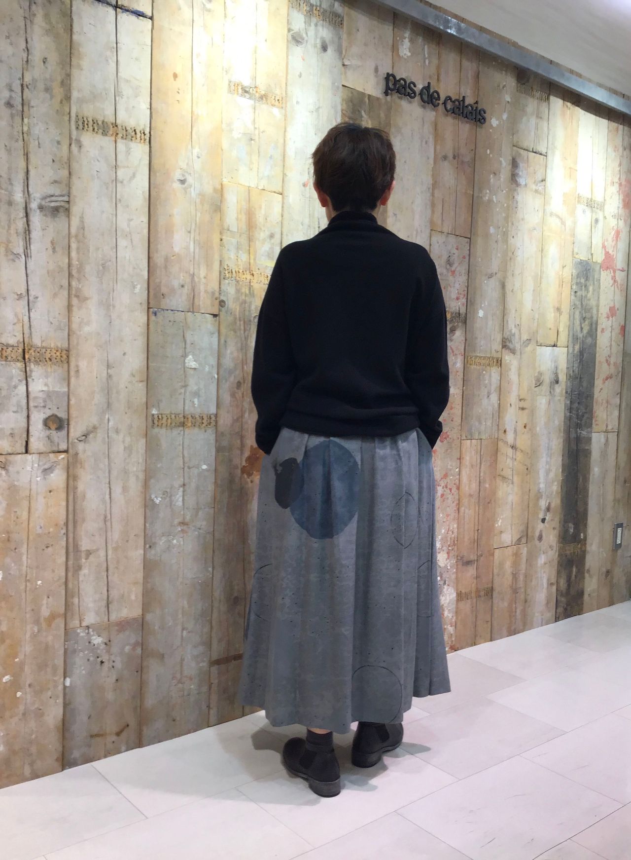 スカートの柄を活かせるように、シンプルなニットと合わせてみました。