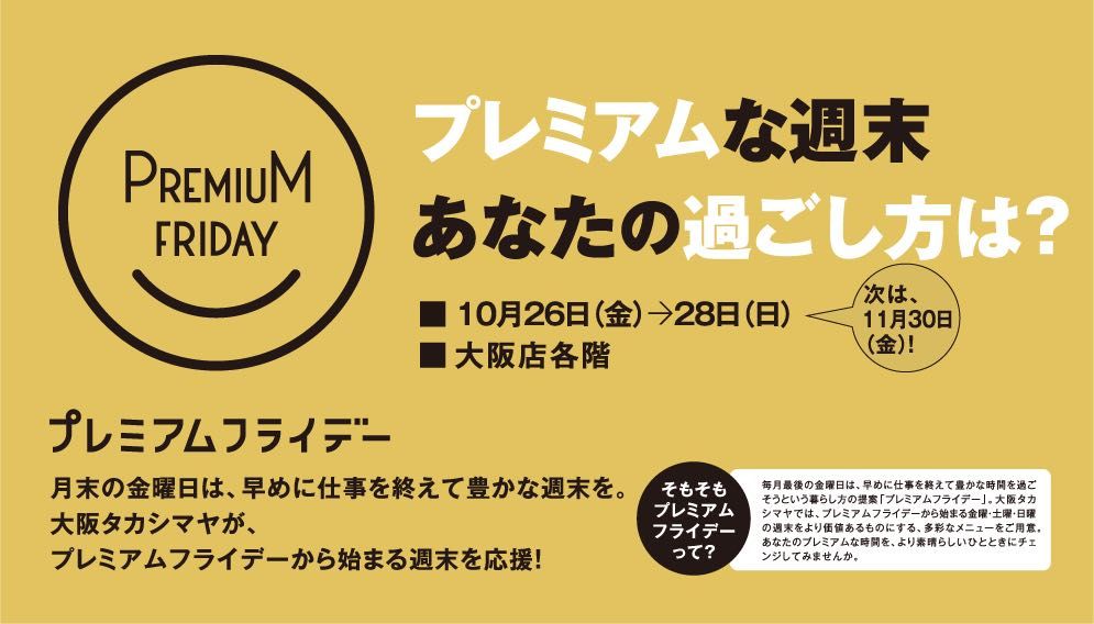10月26(金)〜28日(日)の3日間は各フロアでプレゼントやお得なメニューをご用意してお待ちしております。週末は髙島屋でお買い物やお食事をお楽しみください。