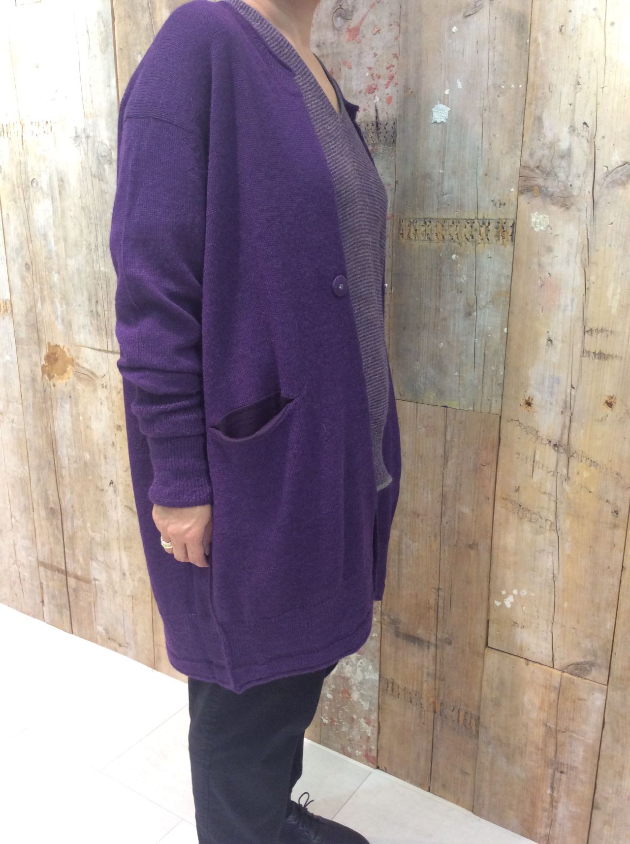 広すぎないVネックで1枚でも、同じアルパカ素材のロングカーディガンとアンサンブルでも着ていただけます。