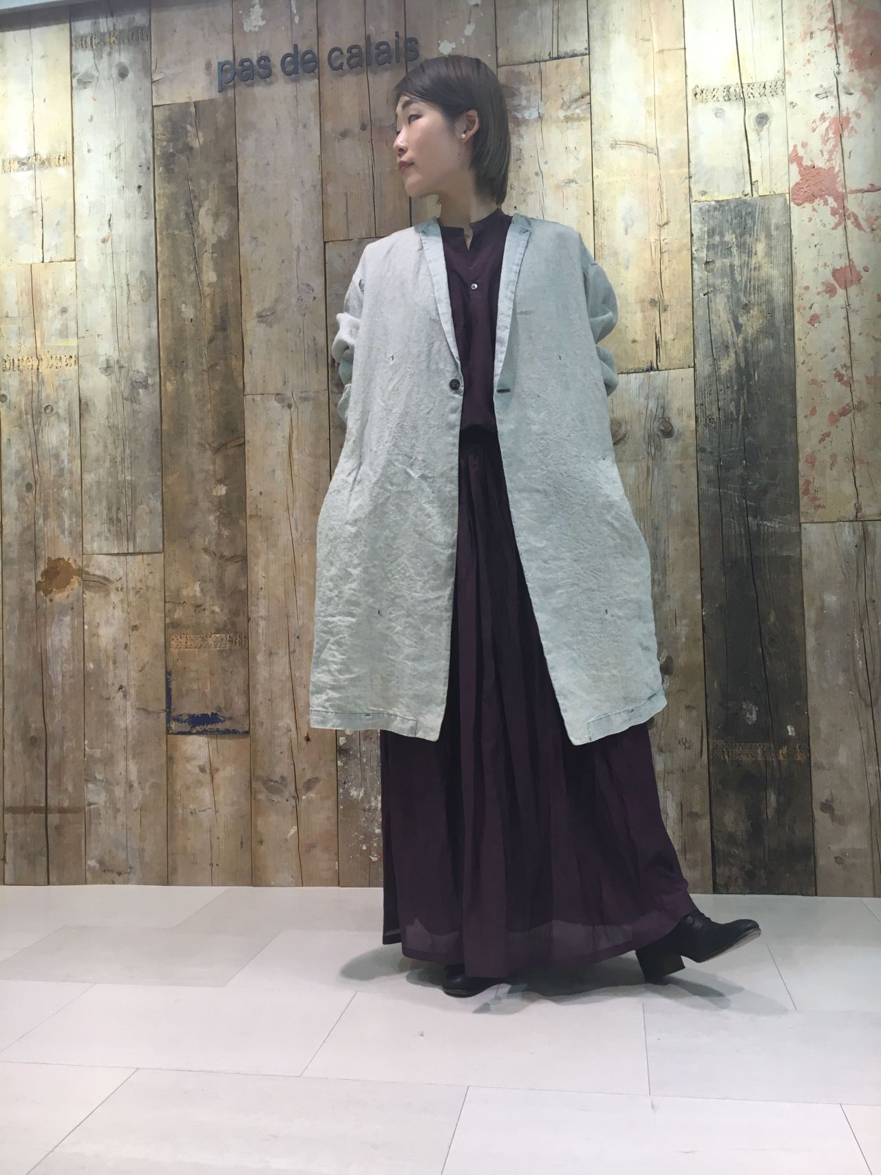 ブラウスとスカートのセットアップをインディゴコートと合わせました。