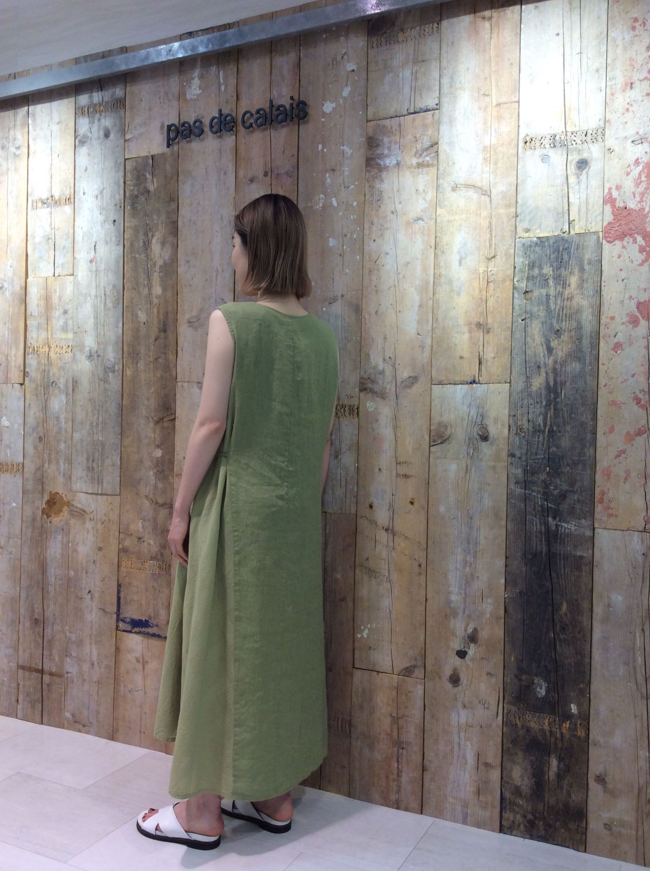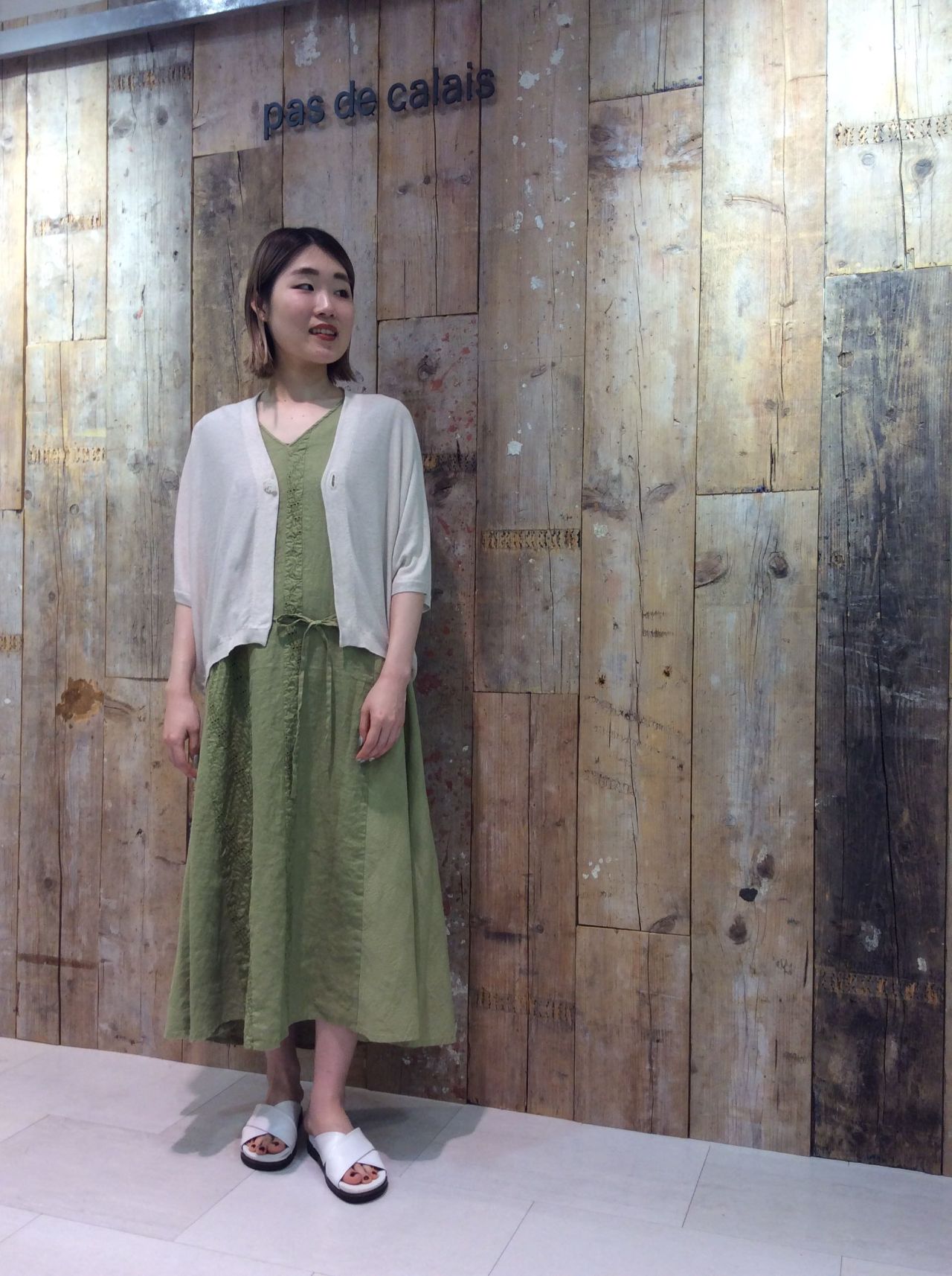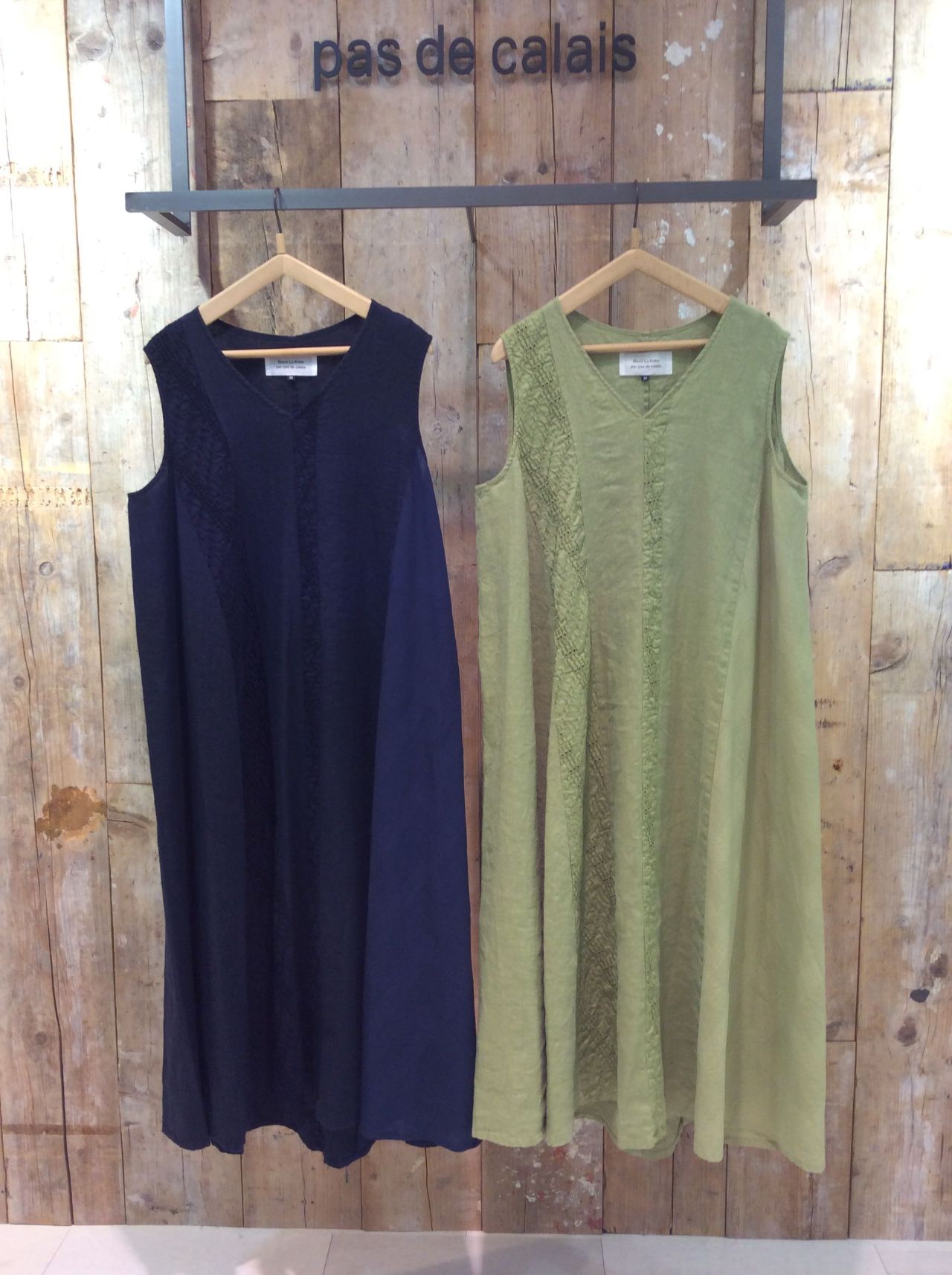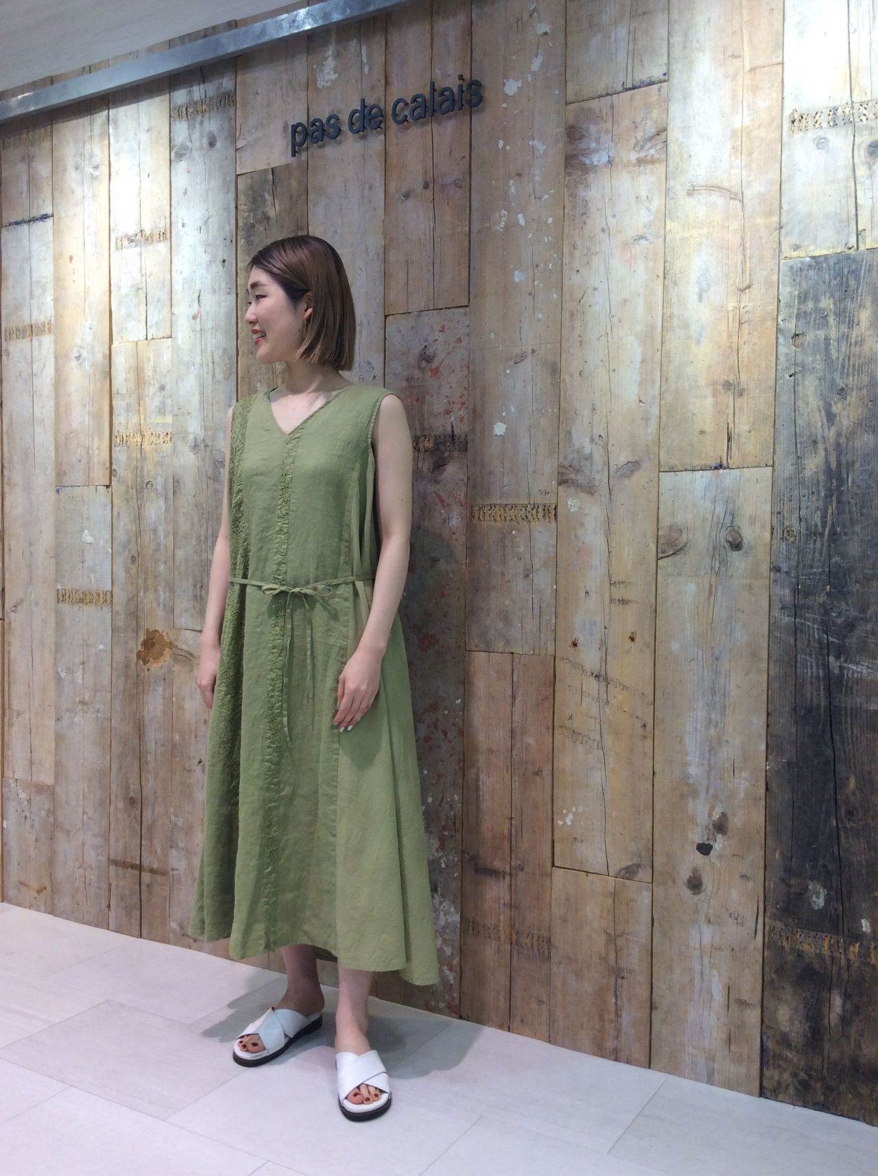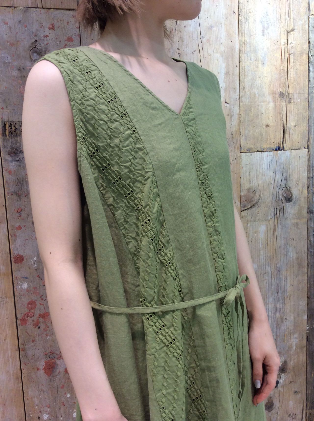 麻素材をメインに、異素材のシュリンクレースとシャドーチェックの2種類をミックスした、ワンピースです。