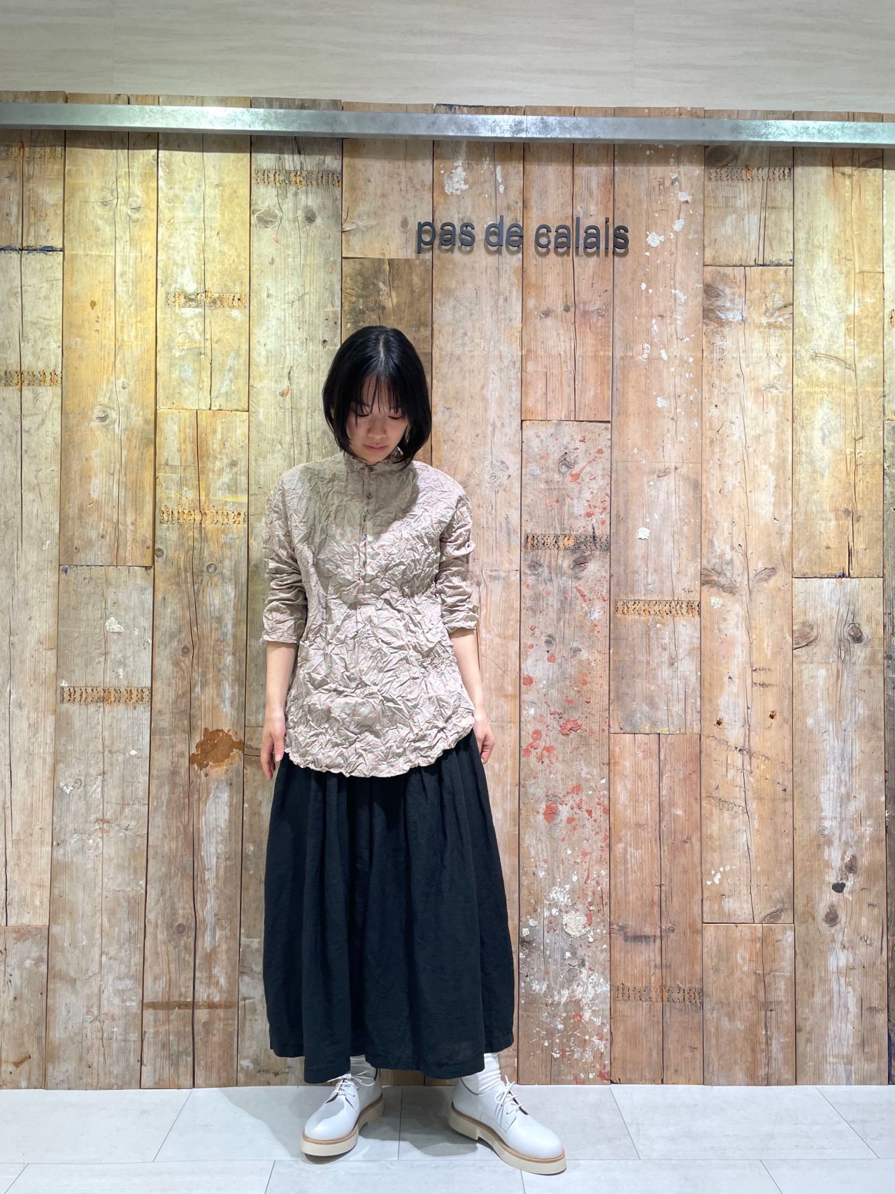 今回はシワ感のあるブラウスと合わせたカジュアルなスタイリングにしました。