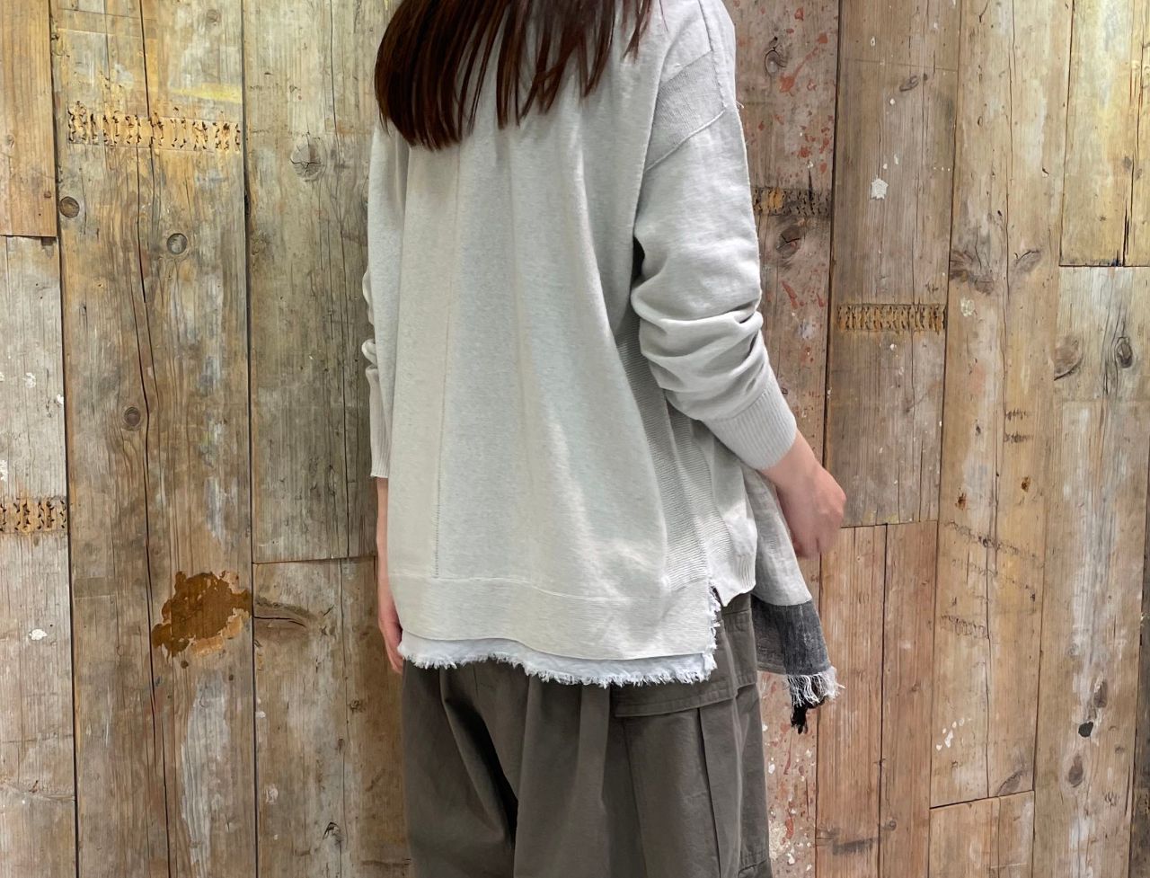 サイドスリットから後ろ裾にかけて布帛生地を部分使いし、デザインのアクセントに。