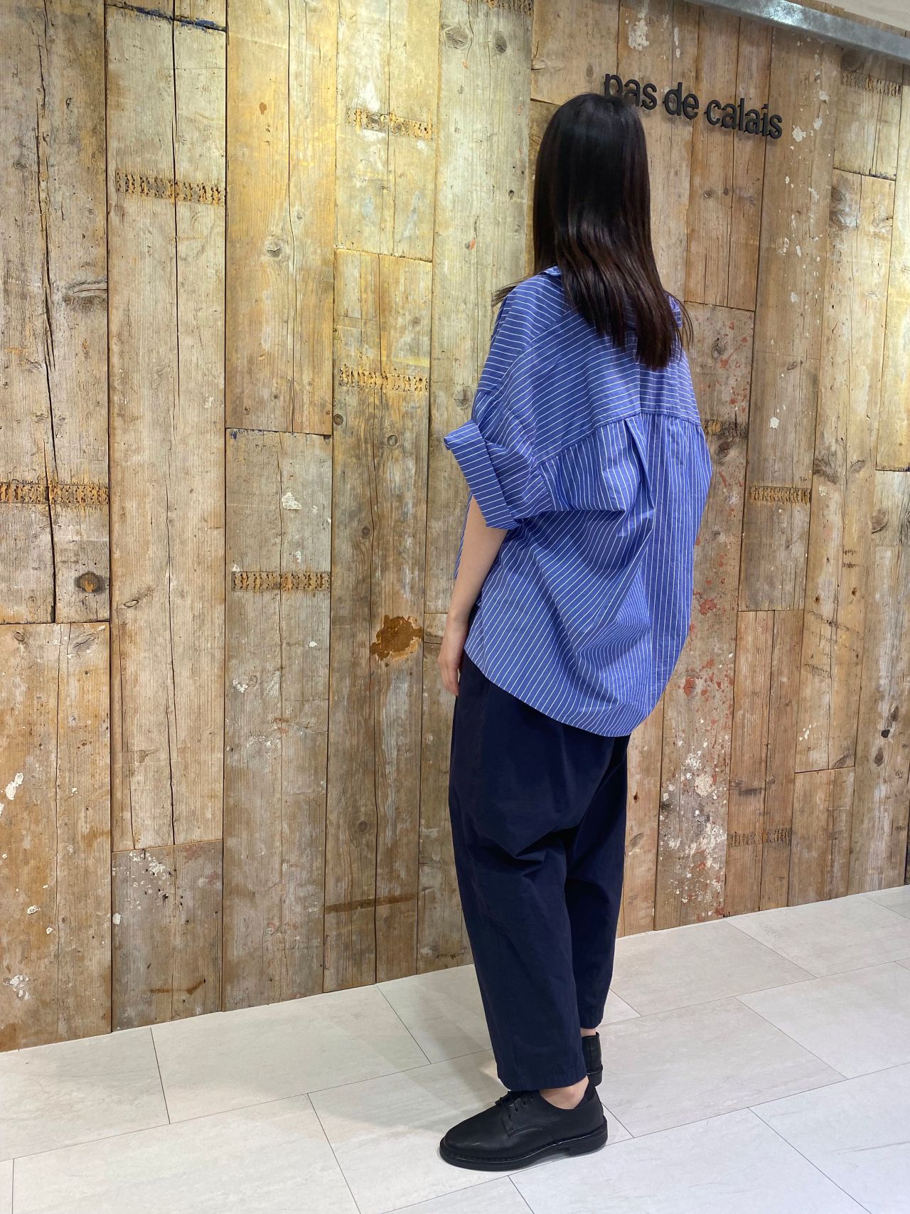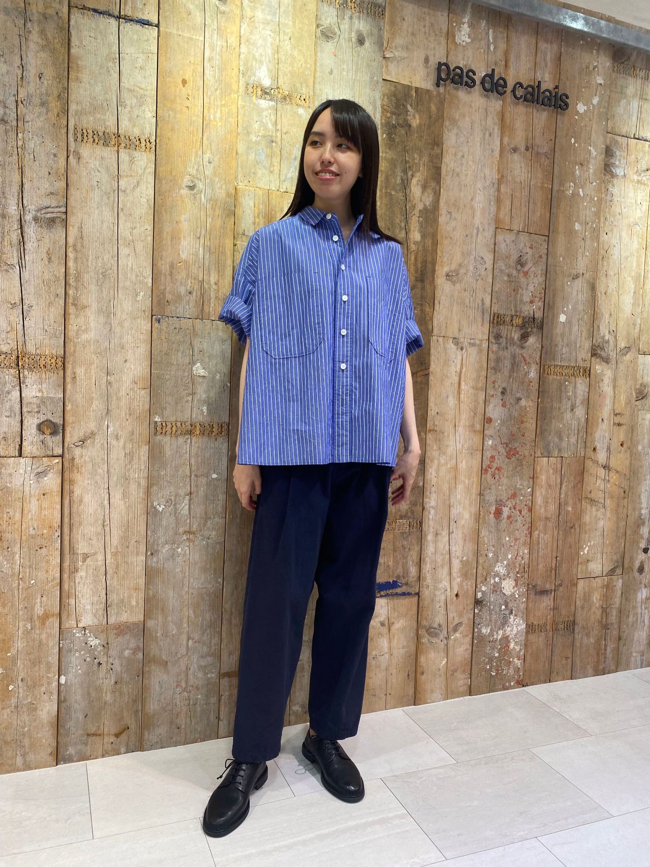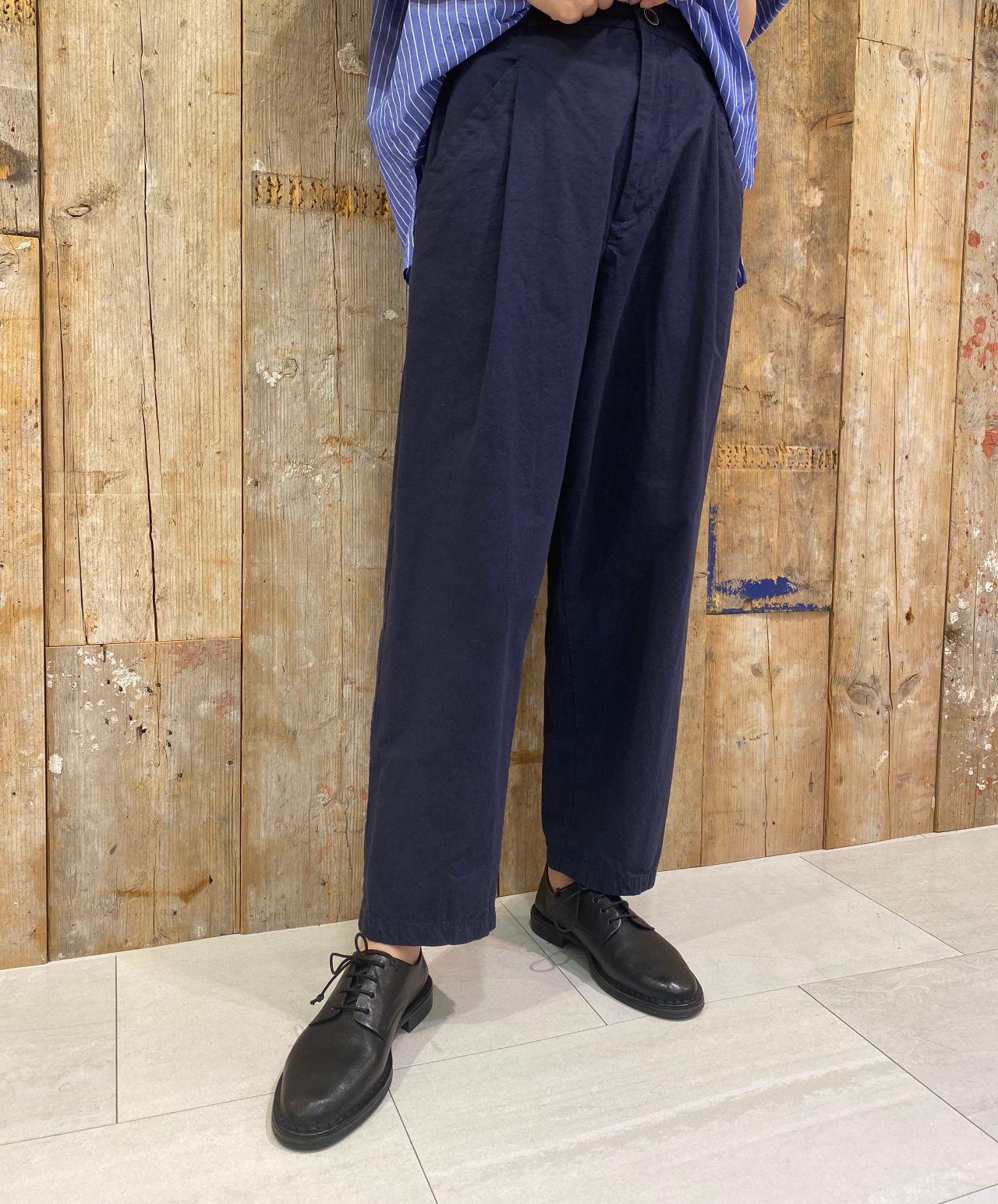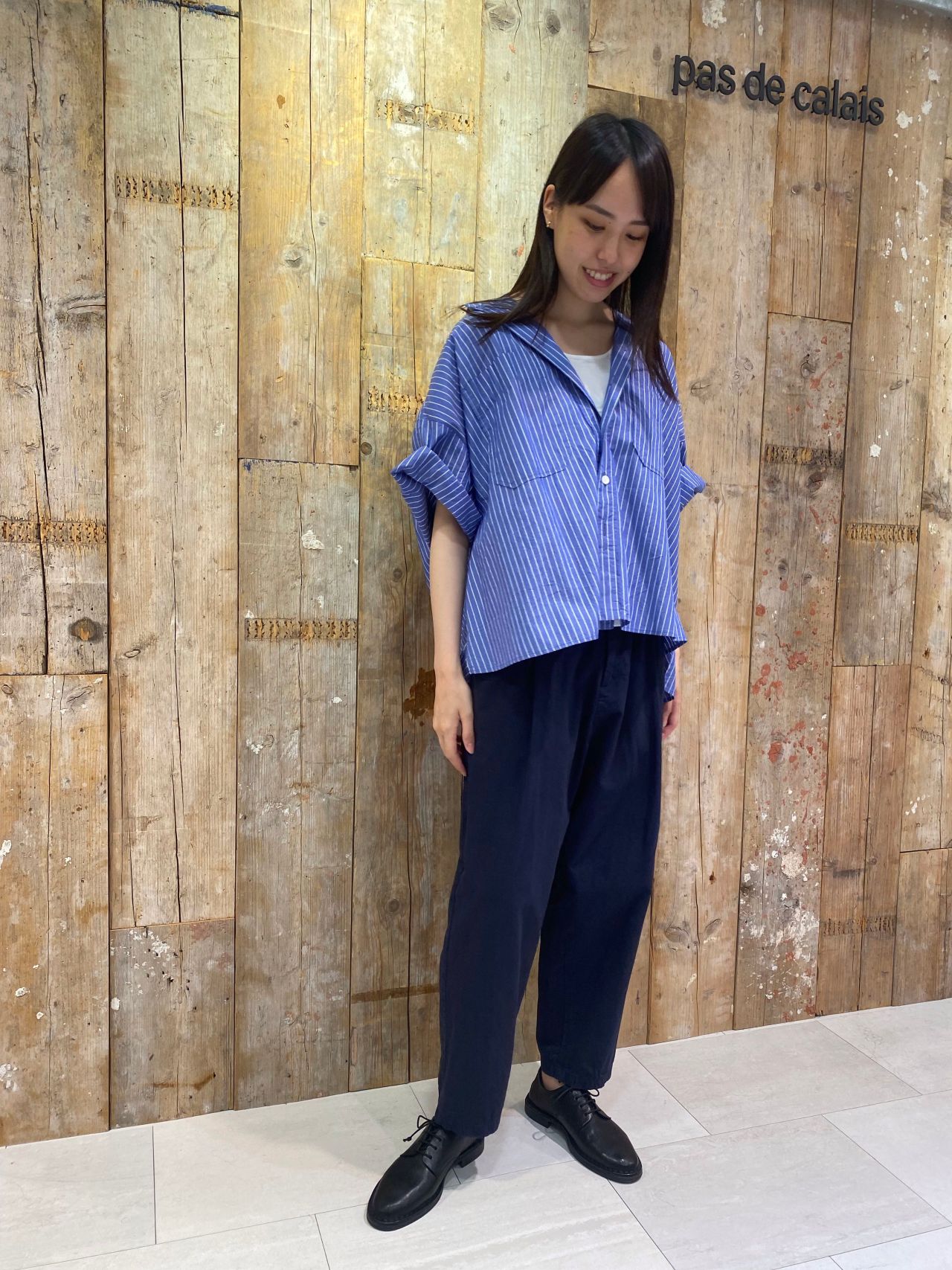 ネイビーのパンツとも相性が良く、今の時期にぴったりなコーディネートに。