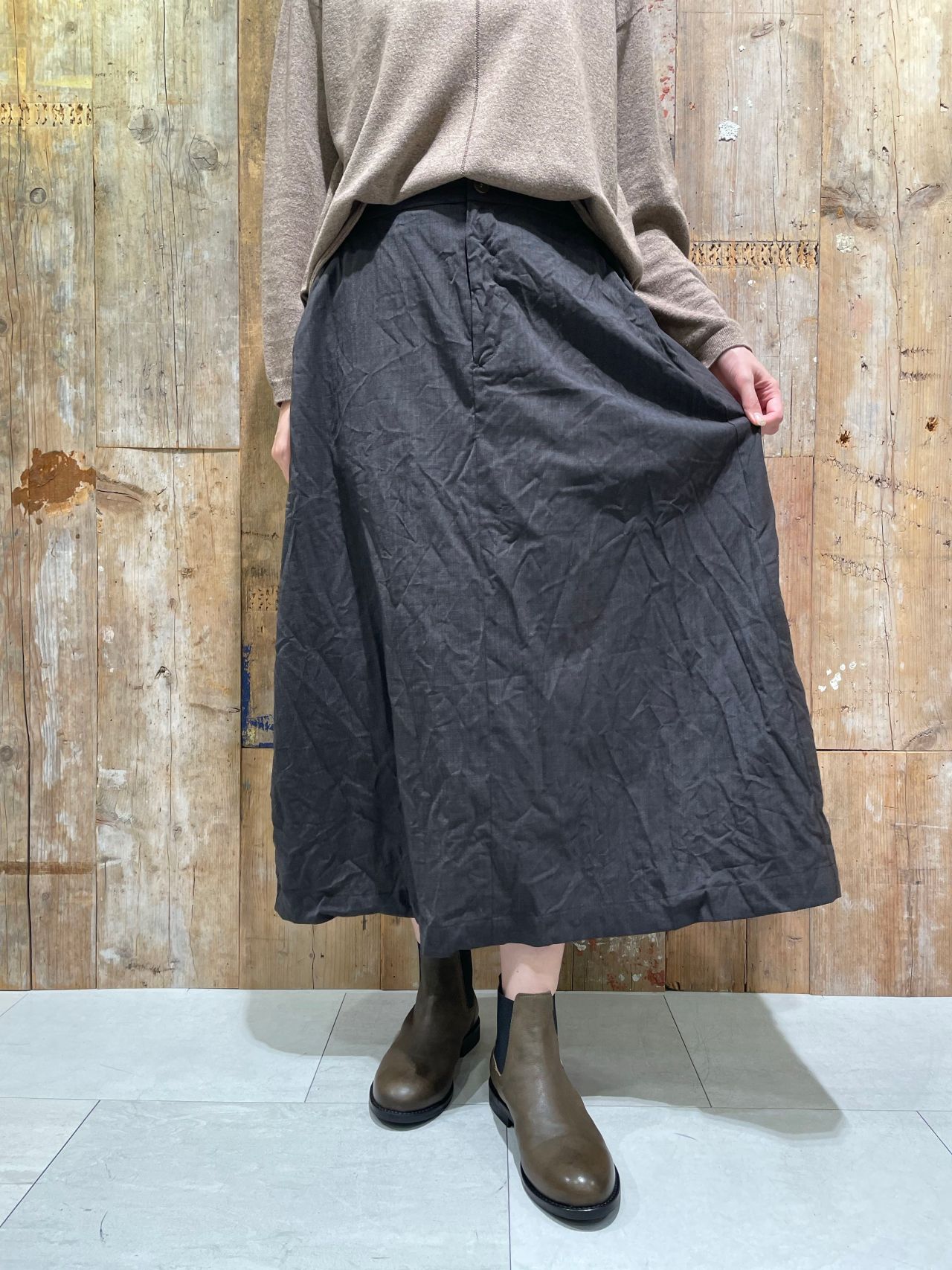 スカートはセミフレアシルエットで、広がりすぎずどんなトップスとも合わせて頂きやすい一枚。