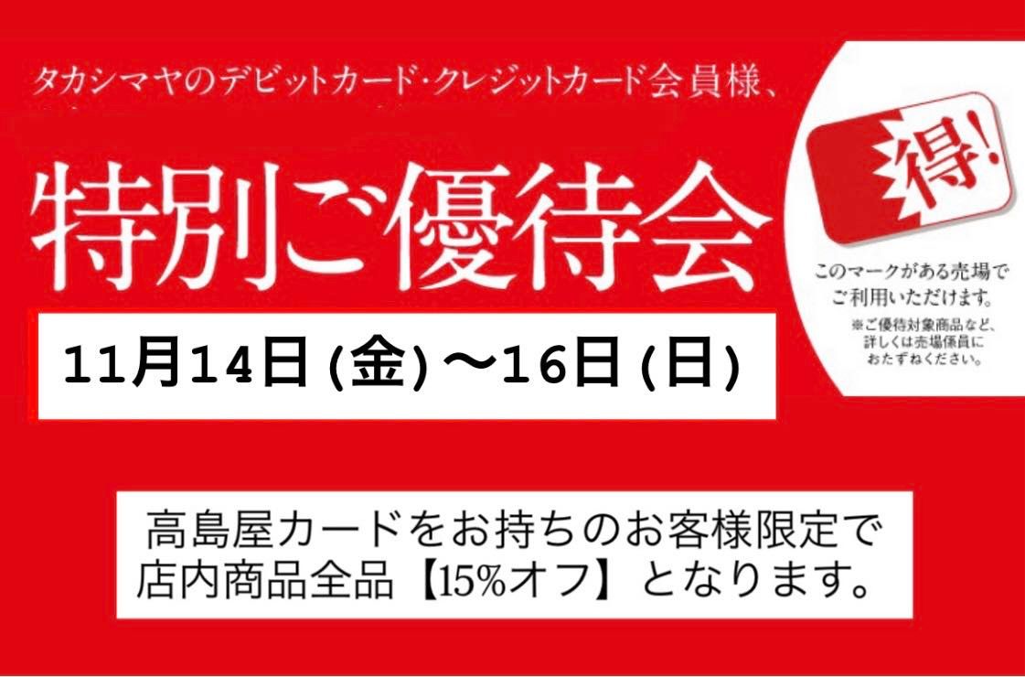 上記期間中、“髙島屋カード会員様“は、店内アイテム全品15%OFFでお求め頂けます。