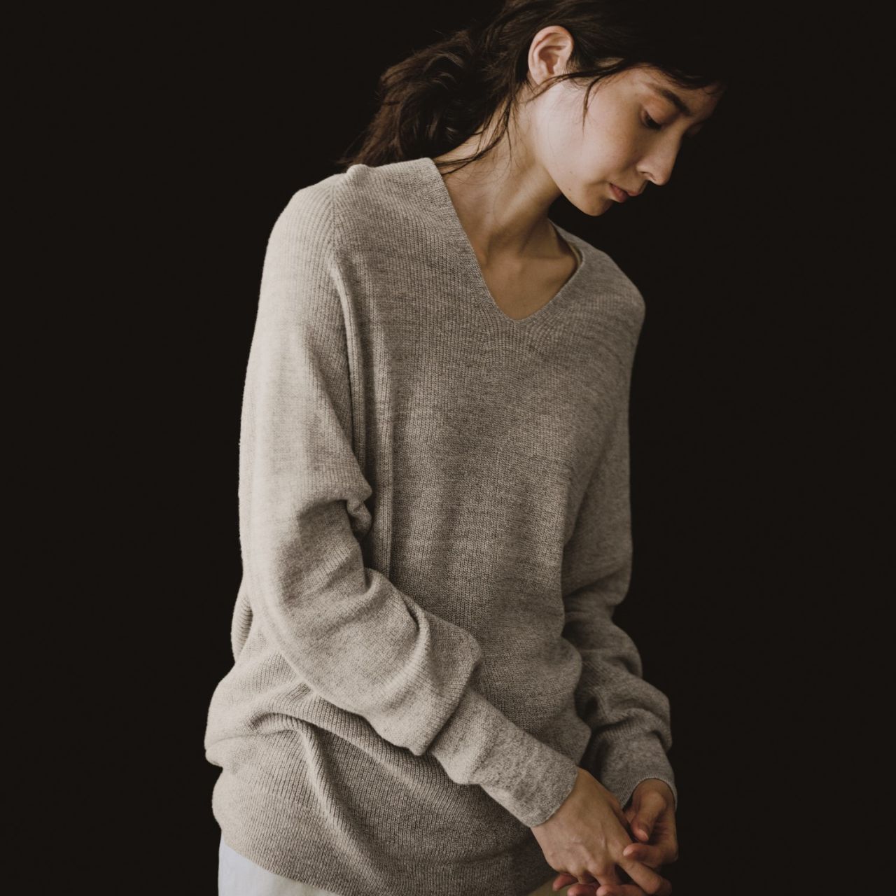浅めのVネックなので、上品でほどよくすっきりした印象に。