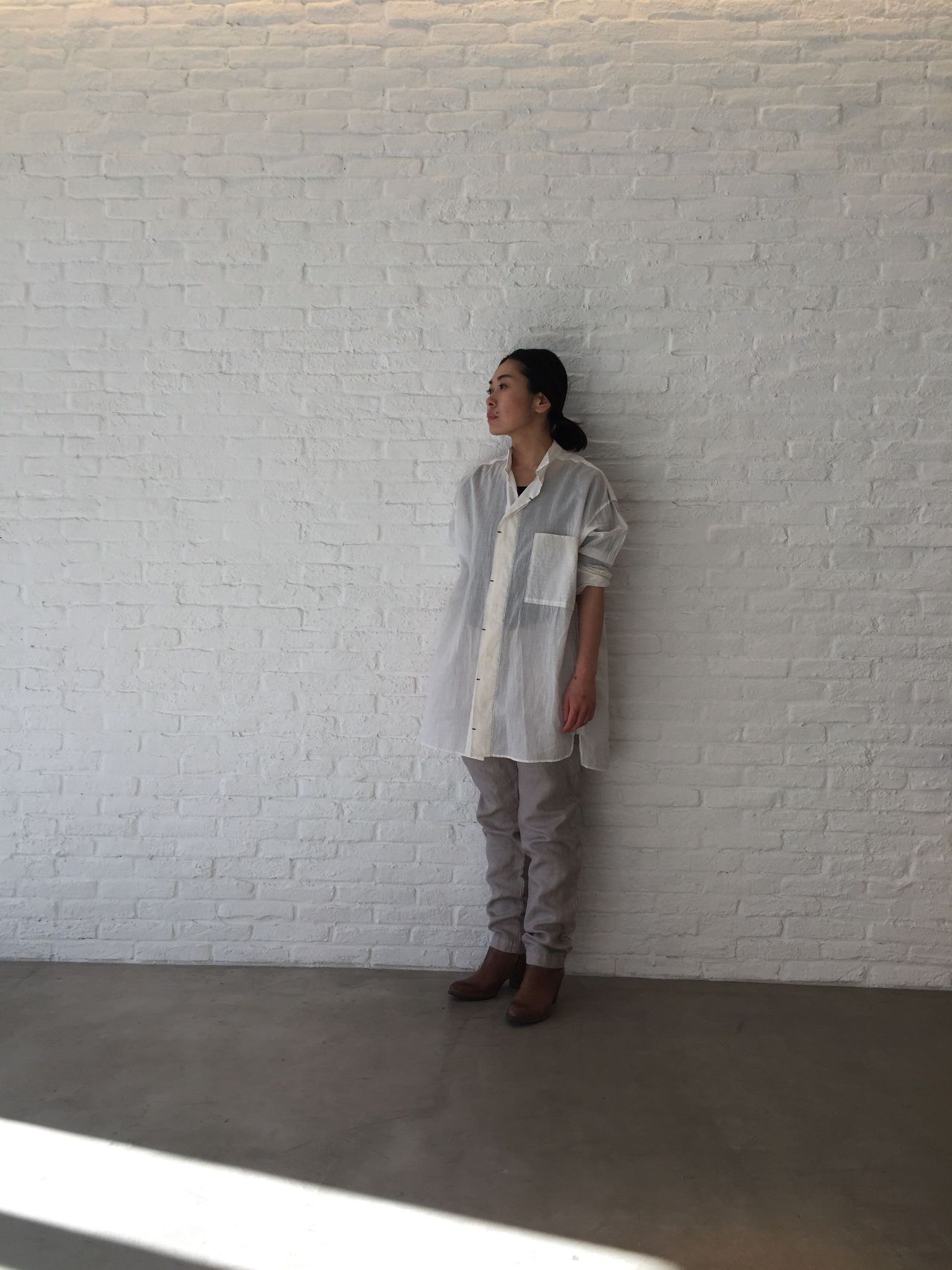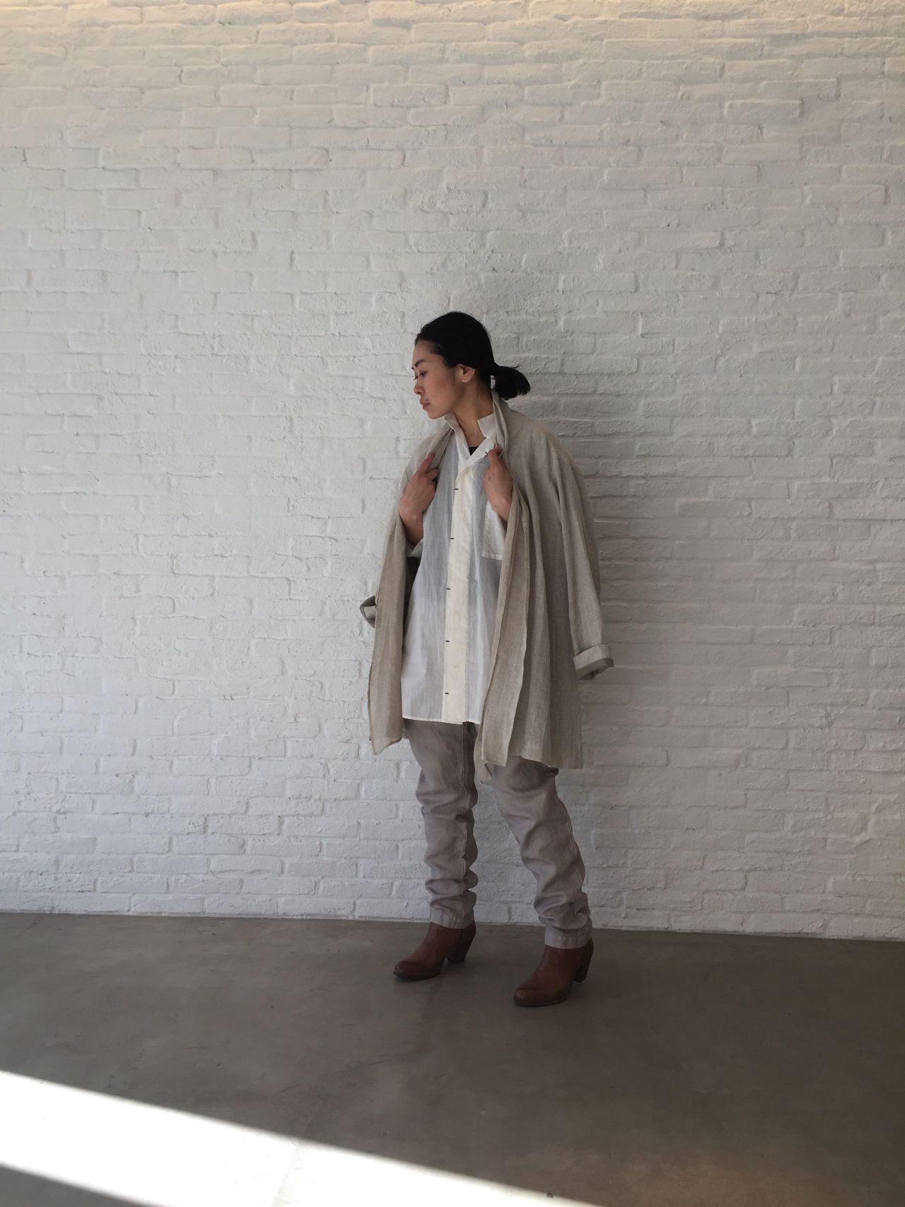 リラックス感あるシルエット、長めの丈、襟元、、、まだまだ空気の冷たい今の時期ははおりものを合わせて。