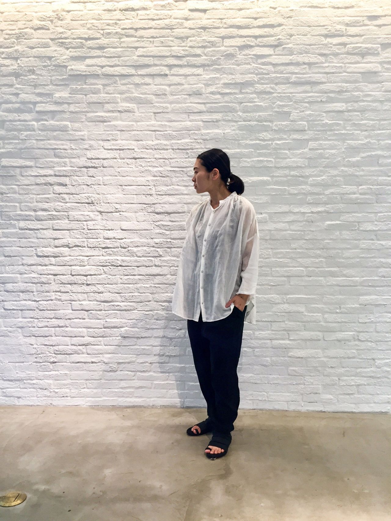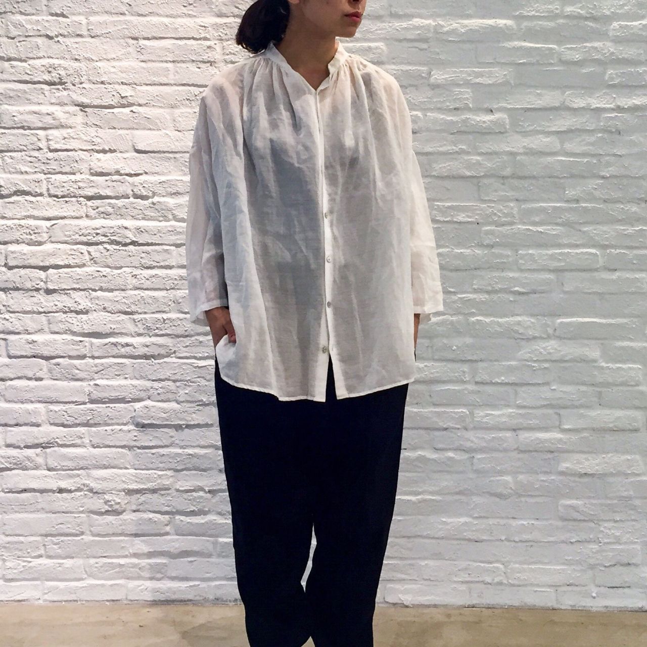 ベーシックなギャザーブラウスなのですが、素材に清涼感があり肌触りがとても良い1着です。1枚でさらりと着ていただいても、羽織としてもお使いいただけそうなブラウス・・・。