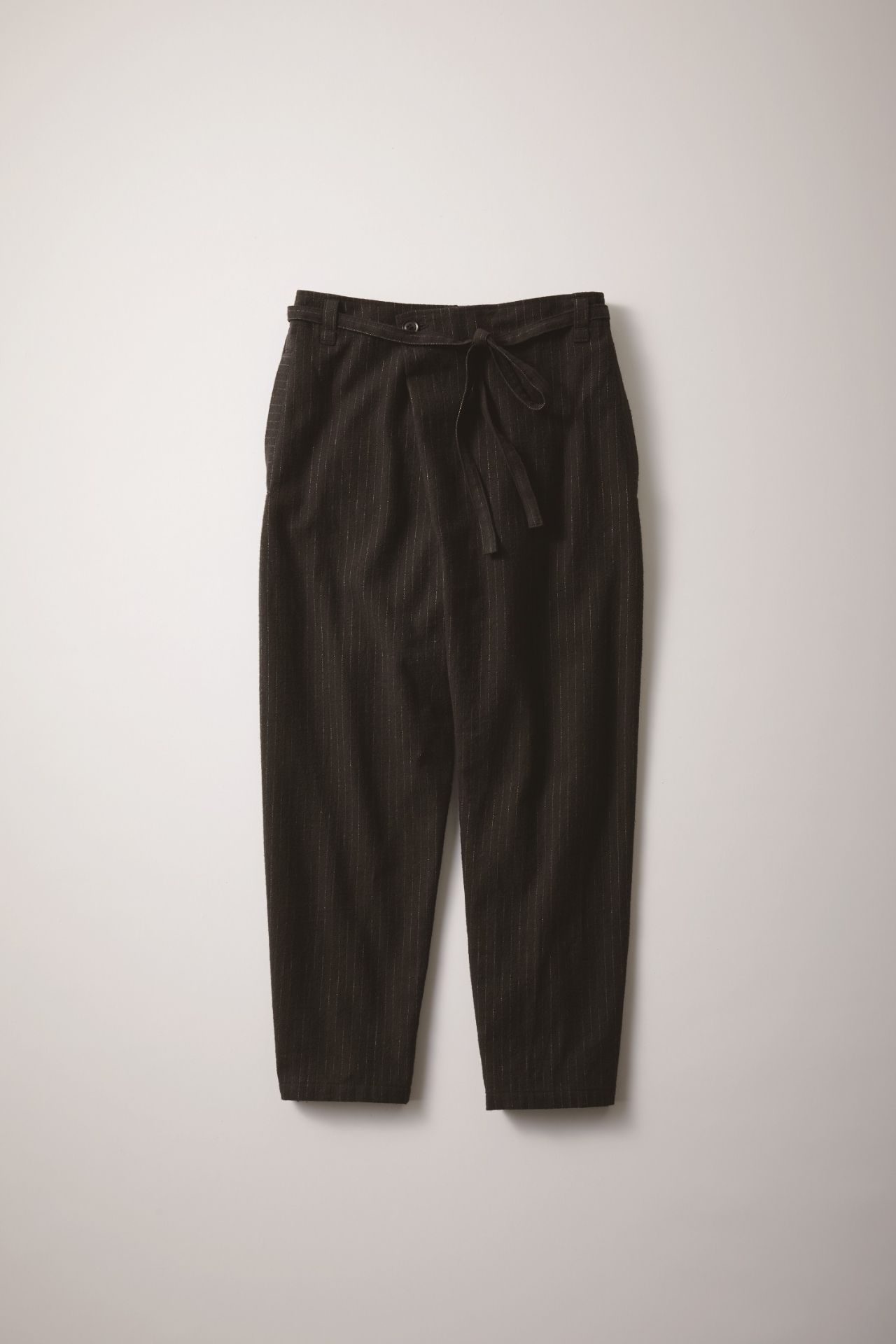 柔らかく、暖かみのあるストライプ テーパードパンツ。
