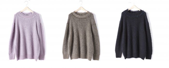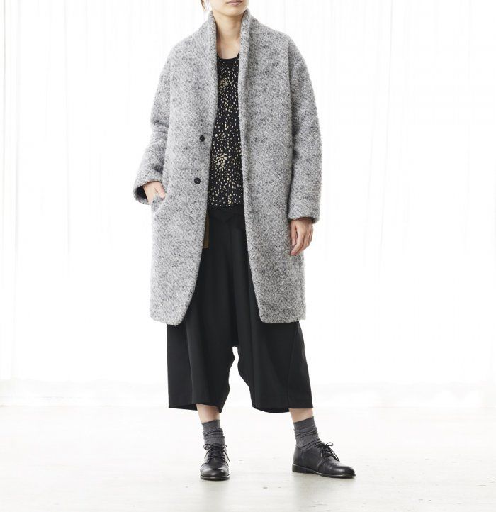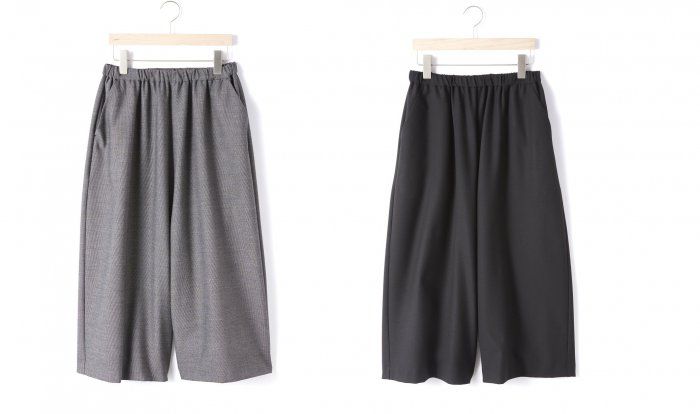 ふわりとした独特な表面感で、肌触りが非常にいい素材感。パンツはシアバター配合の保湿効果のある素材を使ったワイドパンツ。とろみのある素材感でカジュアルになり過ぎない印象。