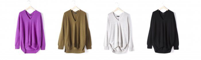 華やかなVネックのニットに合わせたのはシアバター配合の保湿効果のある素材を使ったワイドパンツ。