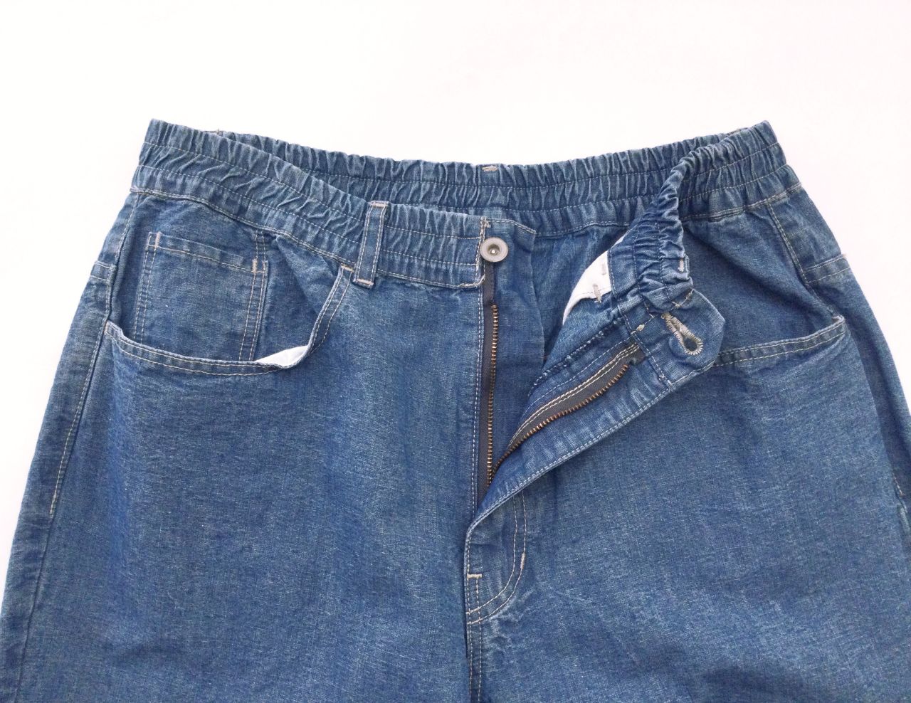 Gパンのポケットを流用したデザインが特徴で、ウエストはゴムが入り伸縮性があります。