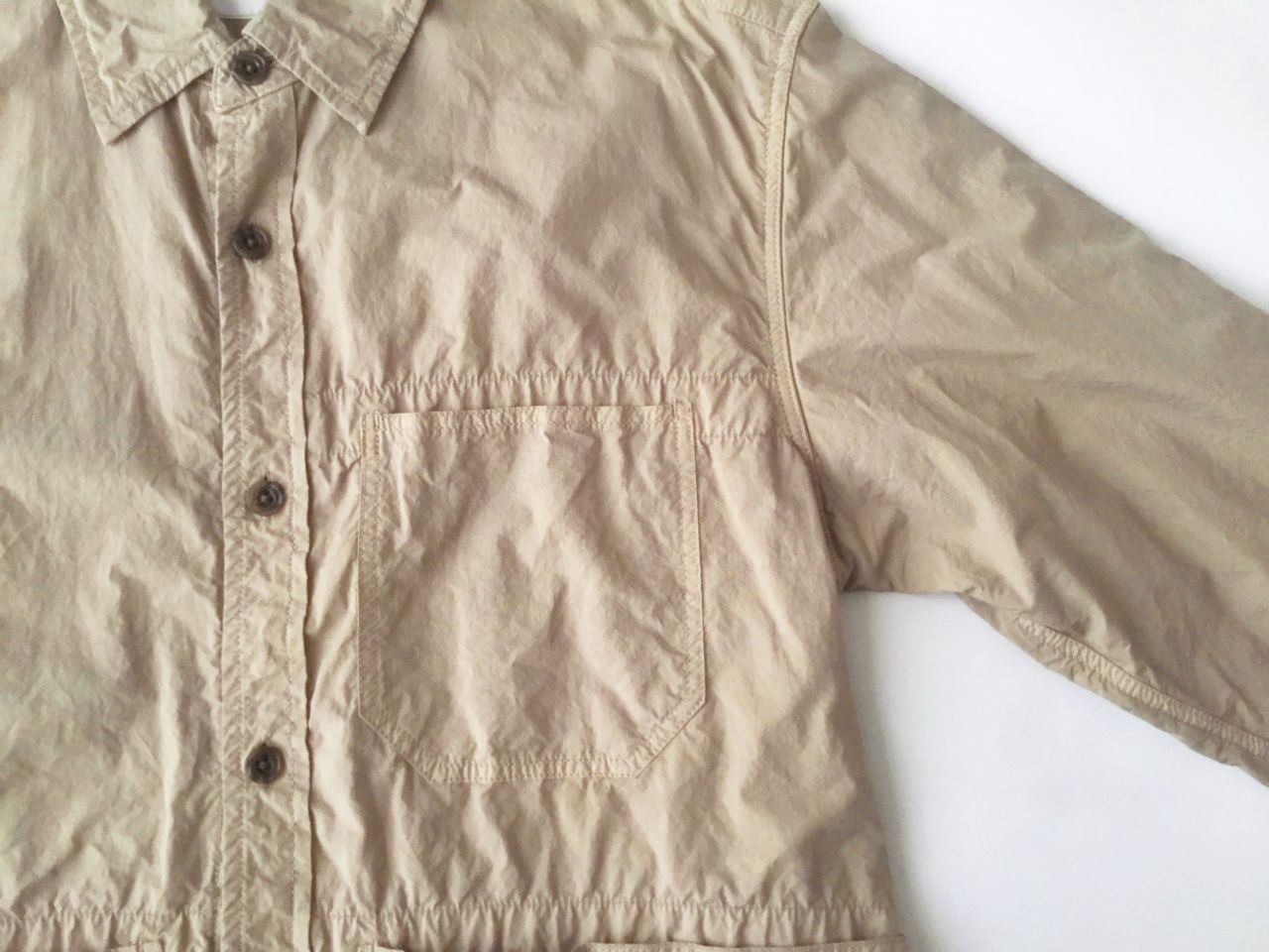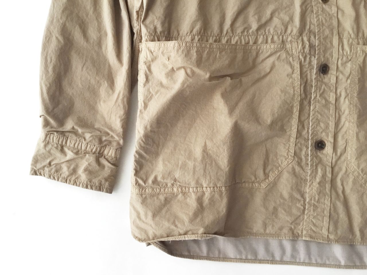 シャツジャケットの形にしてから染める、製品染めを施しています。
