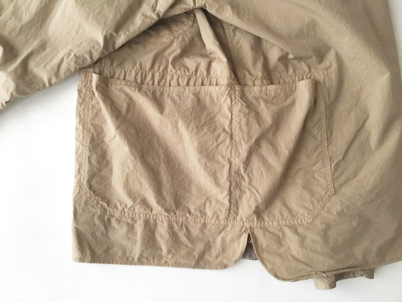 ワークテイストのパッチポケットが特徴ですが、特に腰ポケットは後身頃に掛かるダブルポケット仕様で個性的。