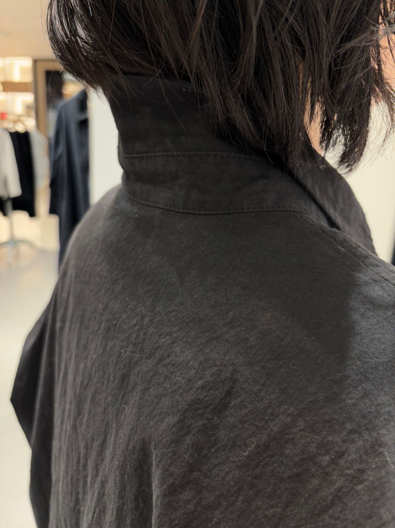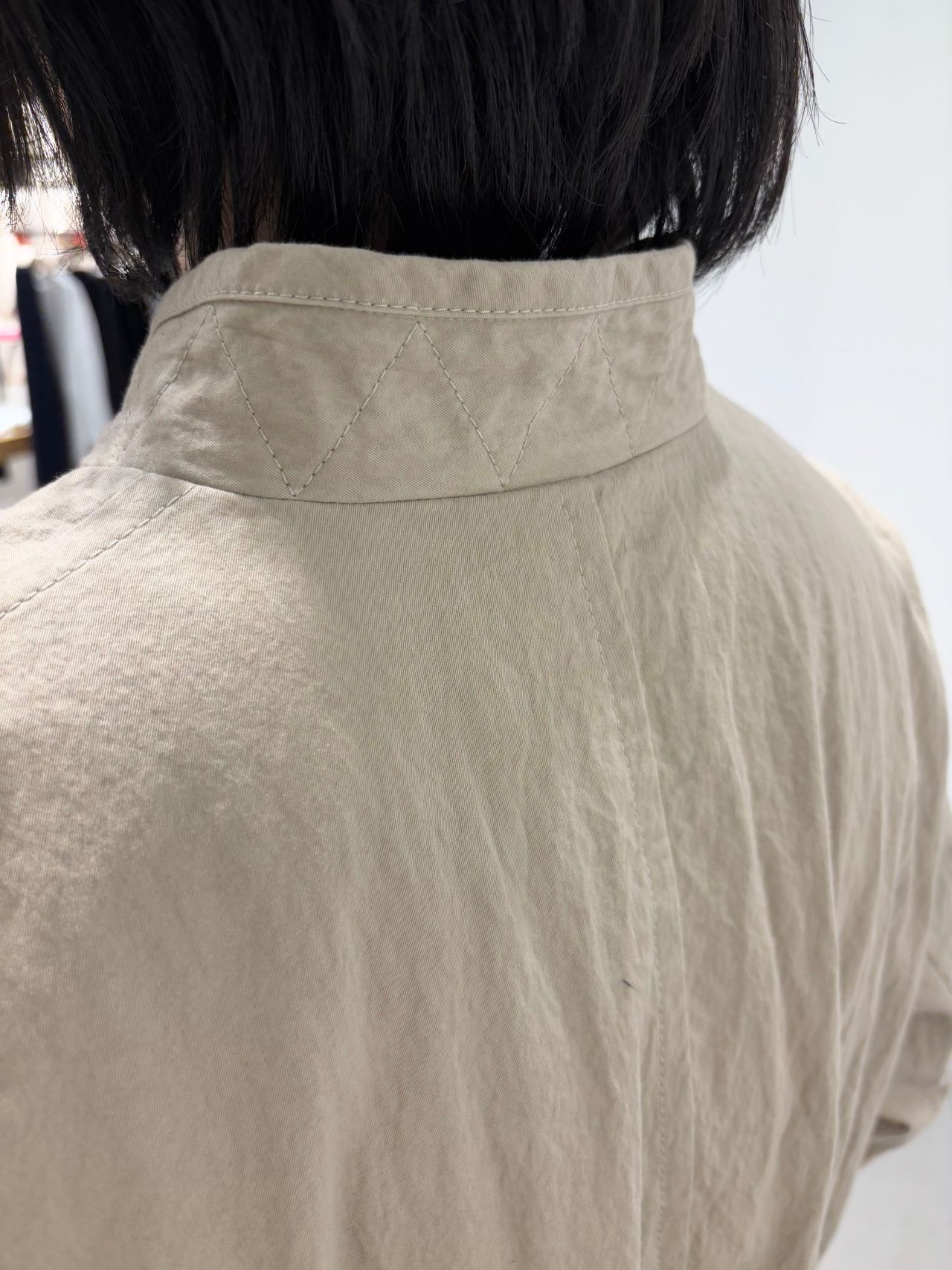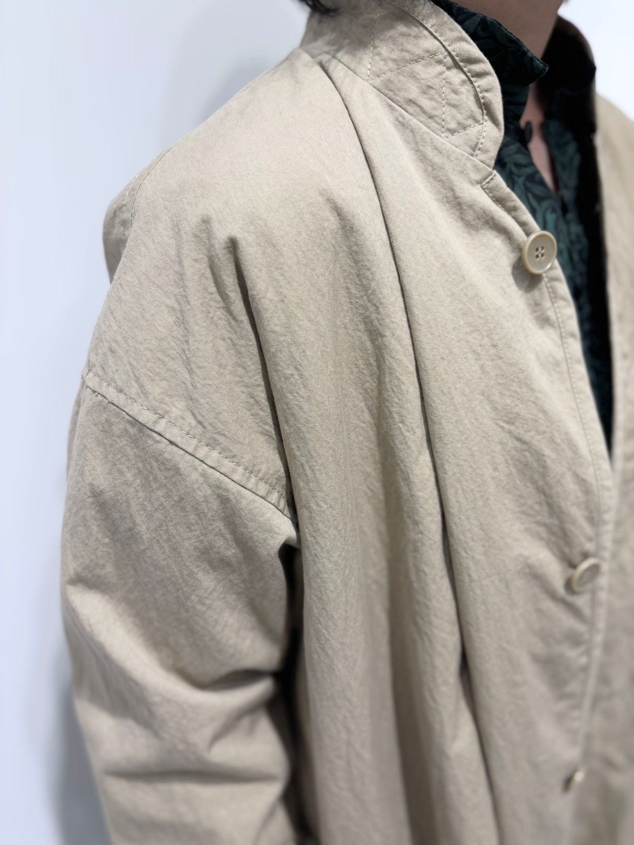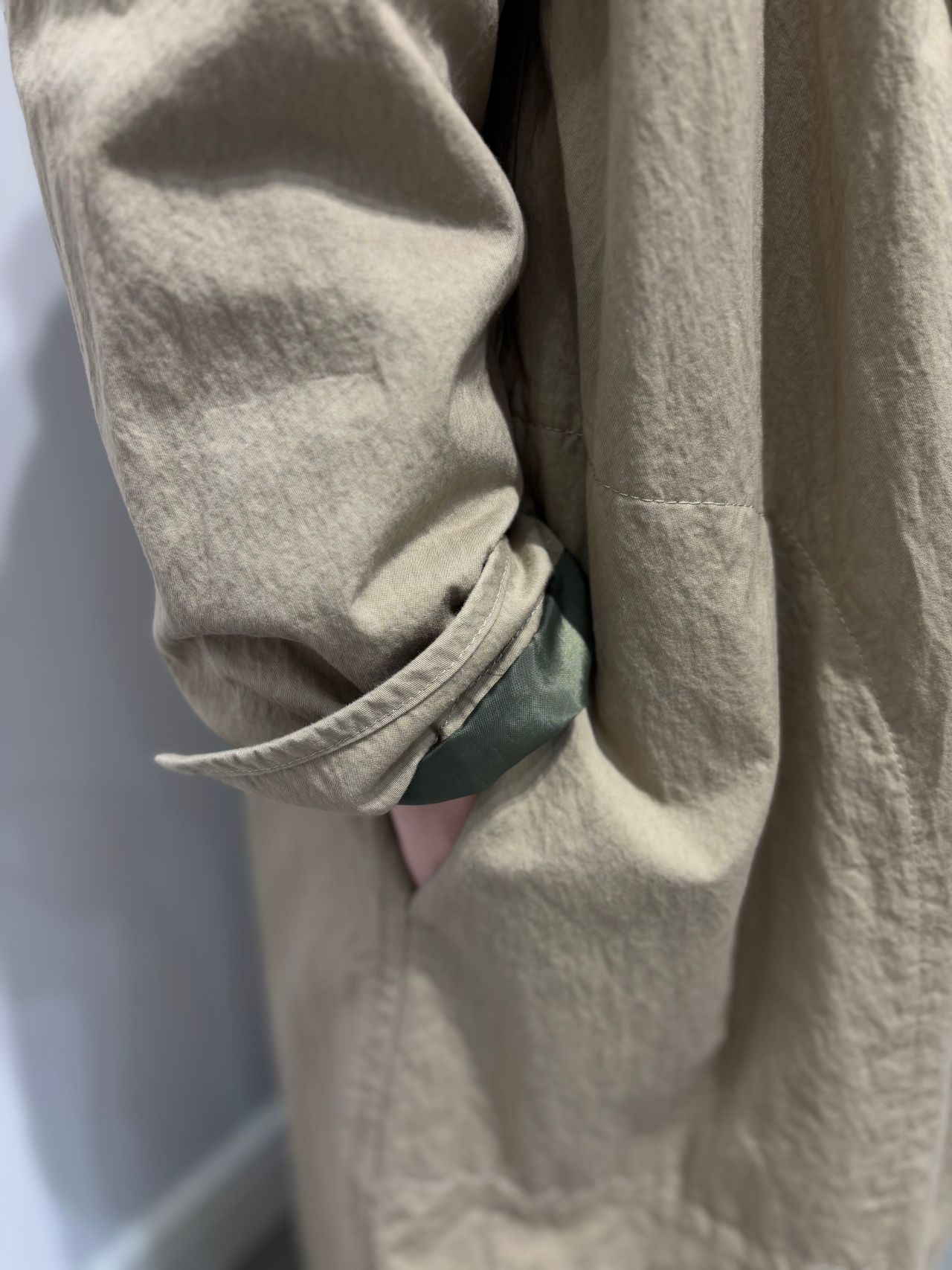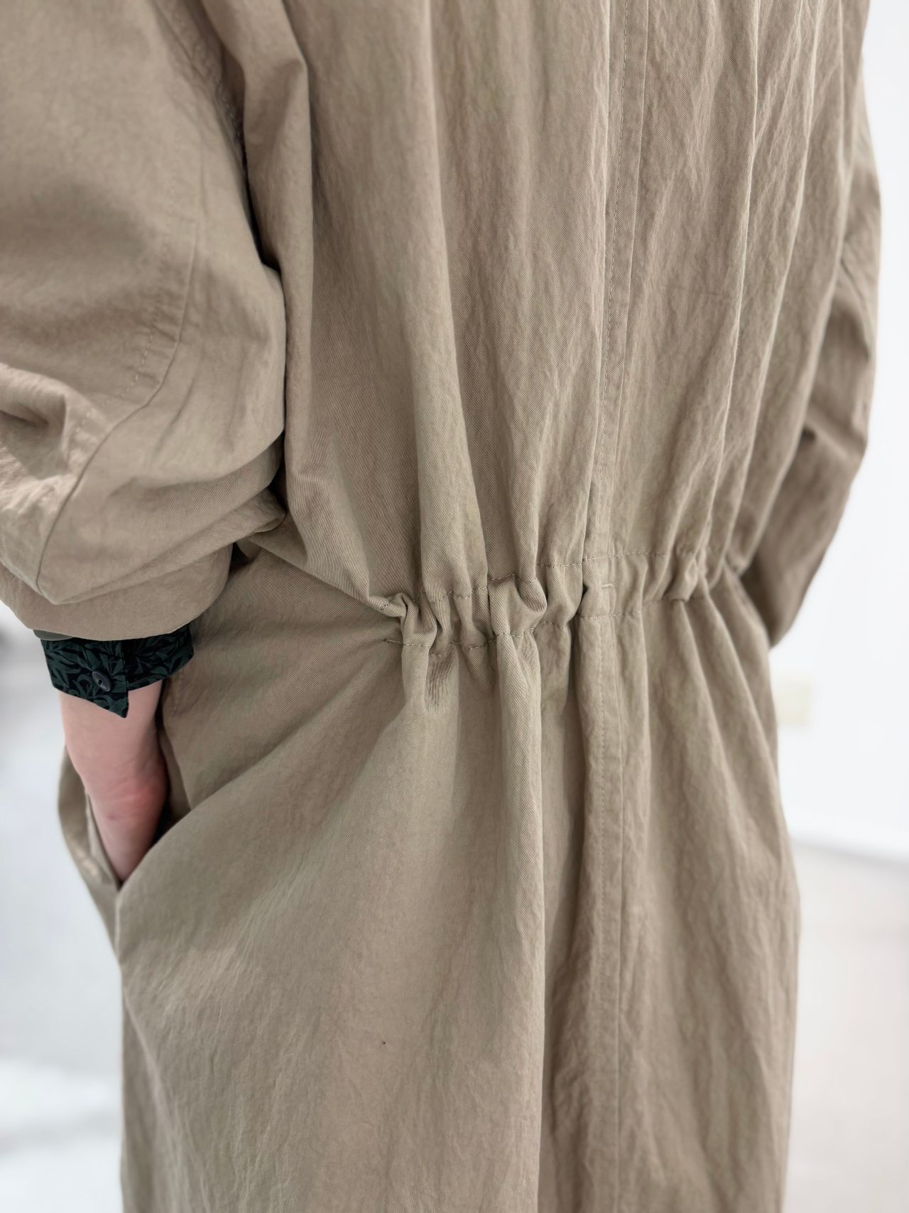 Style:スタンドカラーロングコート。コットンライクの軽い素材感。両脇スラッシュポケット付き。バッグウエストにはテープが通り絞れば、シルエットの変化が楽しめる。