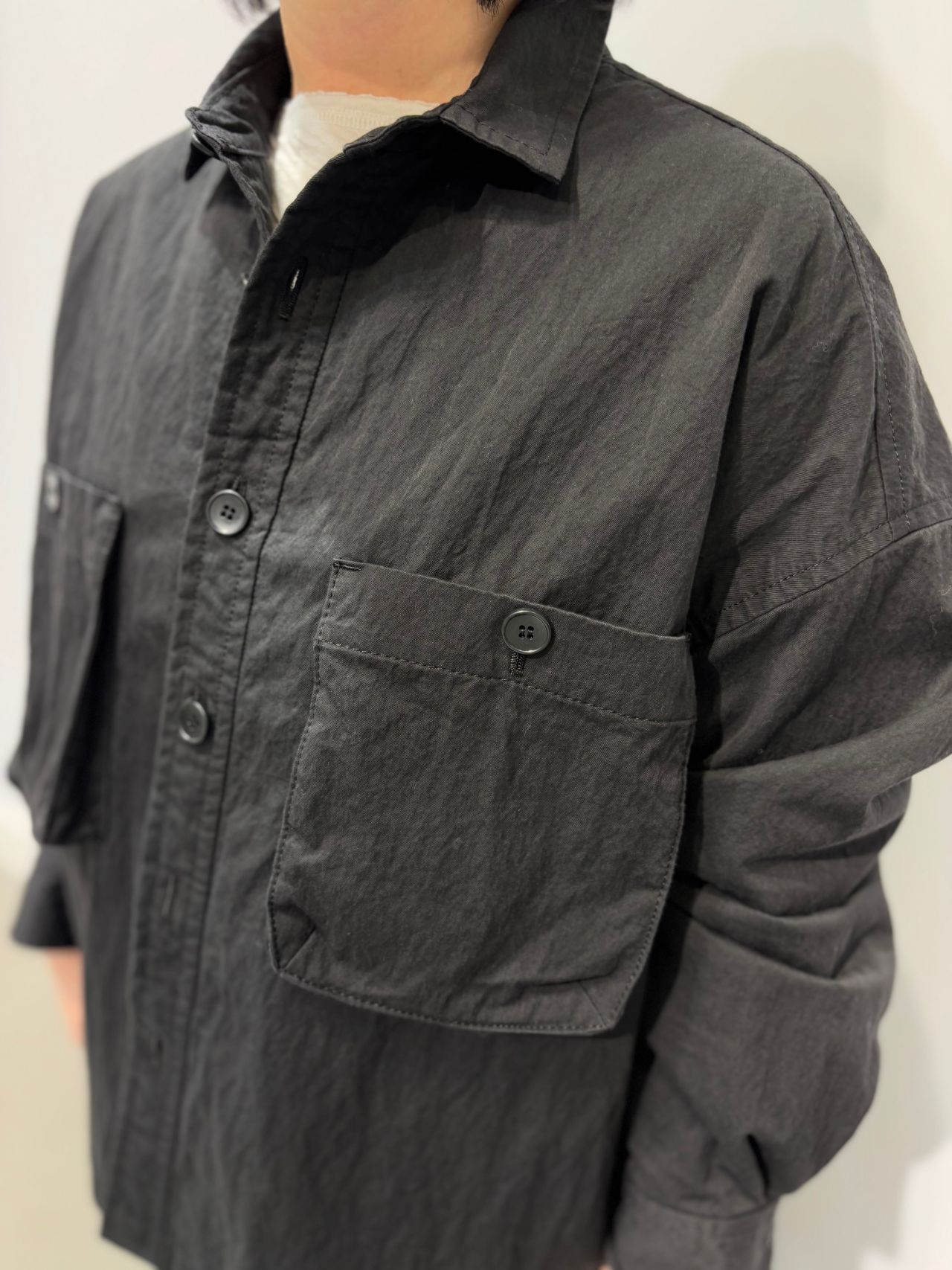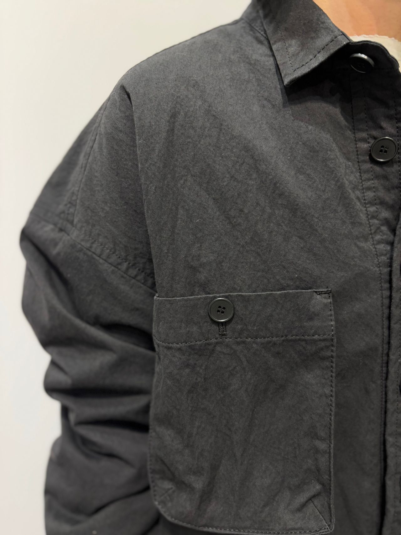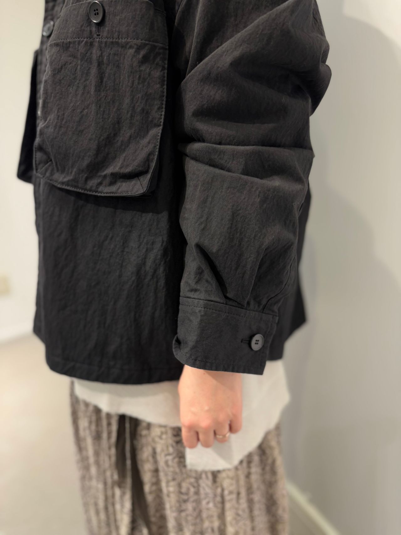 Style:キルティング裏付のシャツジャケット。オーパーサイズのゆとりのあるサイズ感と、胸元にあるマチ付のポケットが印象的。