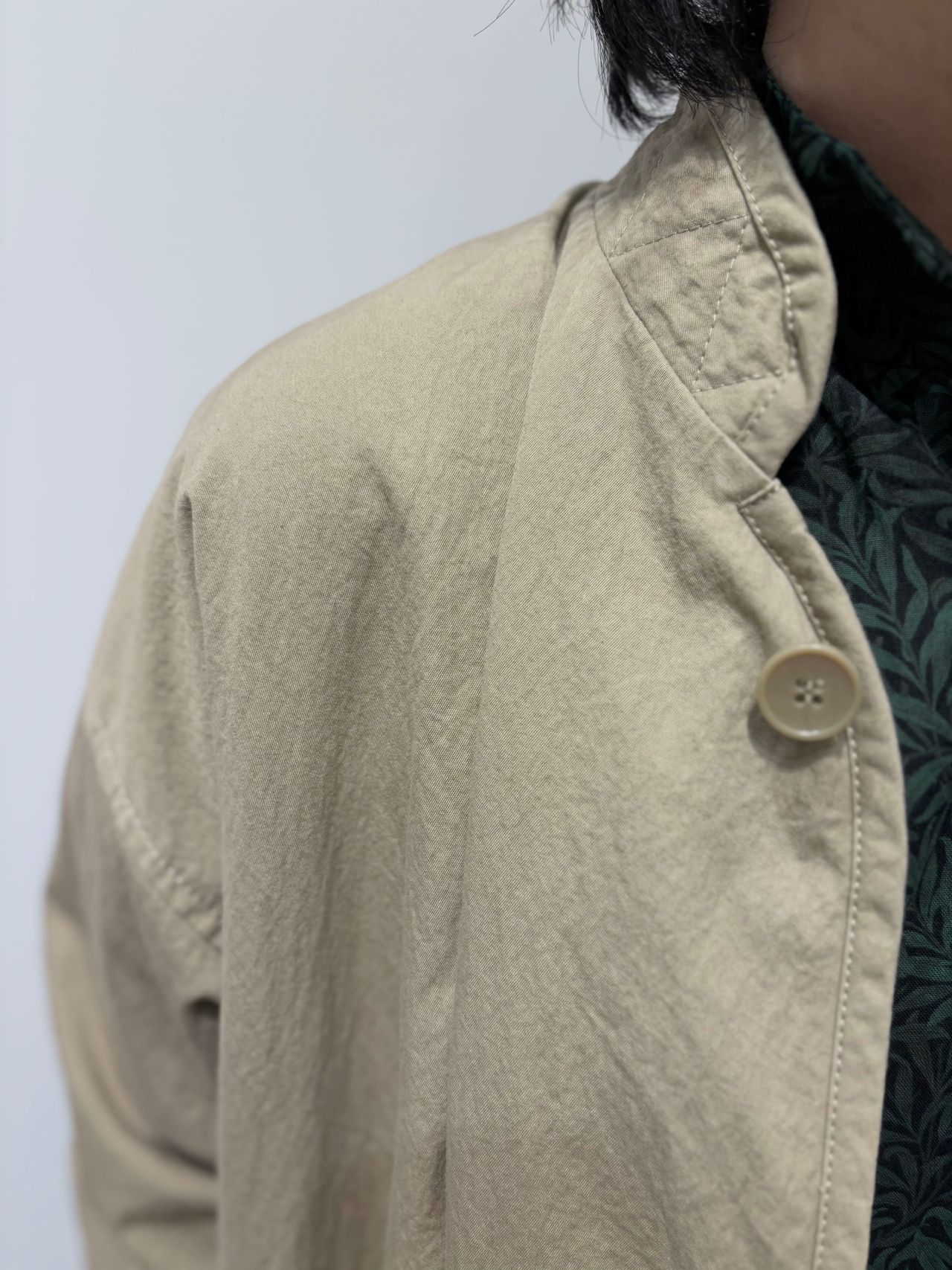 Fabric:綿ナイロンを一つ一つ手作業で染めて、天日干し乾燥を施したツイル素材。自然なシワ感・ナチュラルな染め感が特徴で、ドライタッチな風合いも魅力。製品洗いを施している。