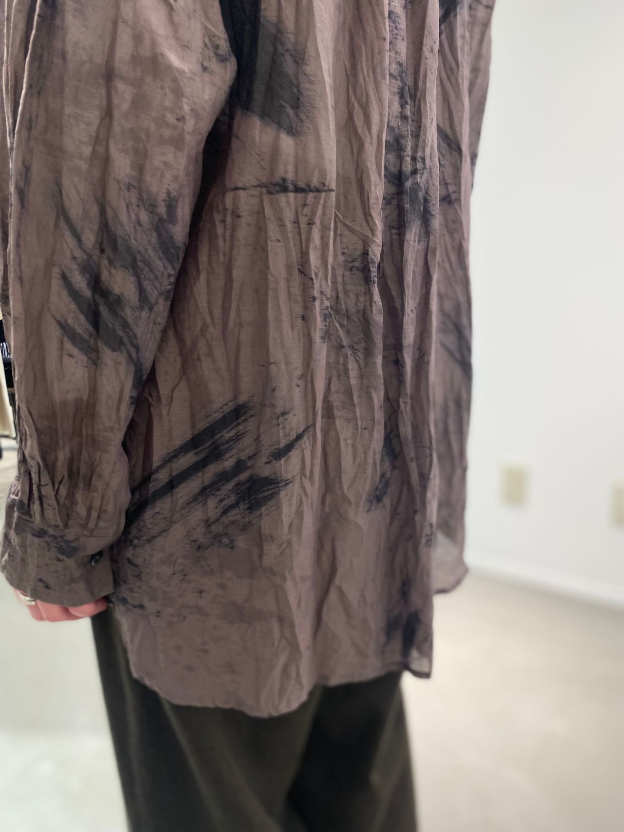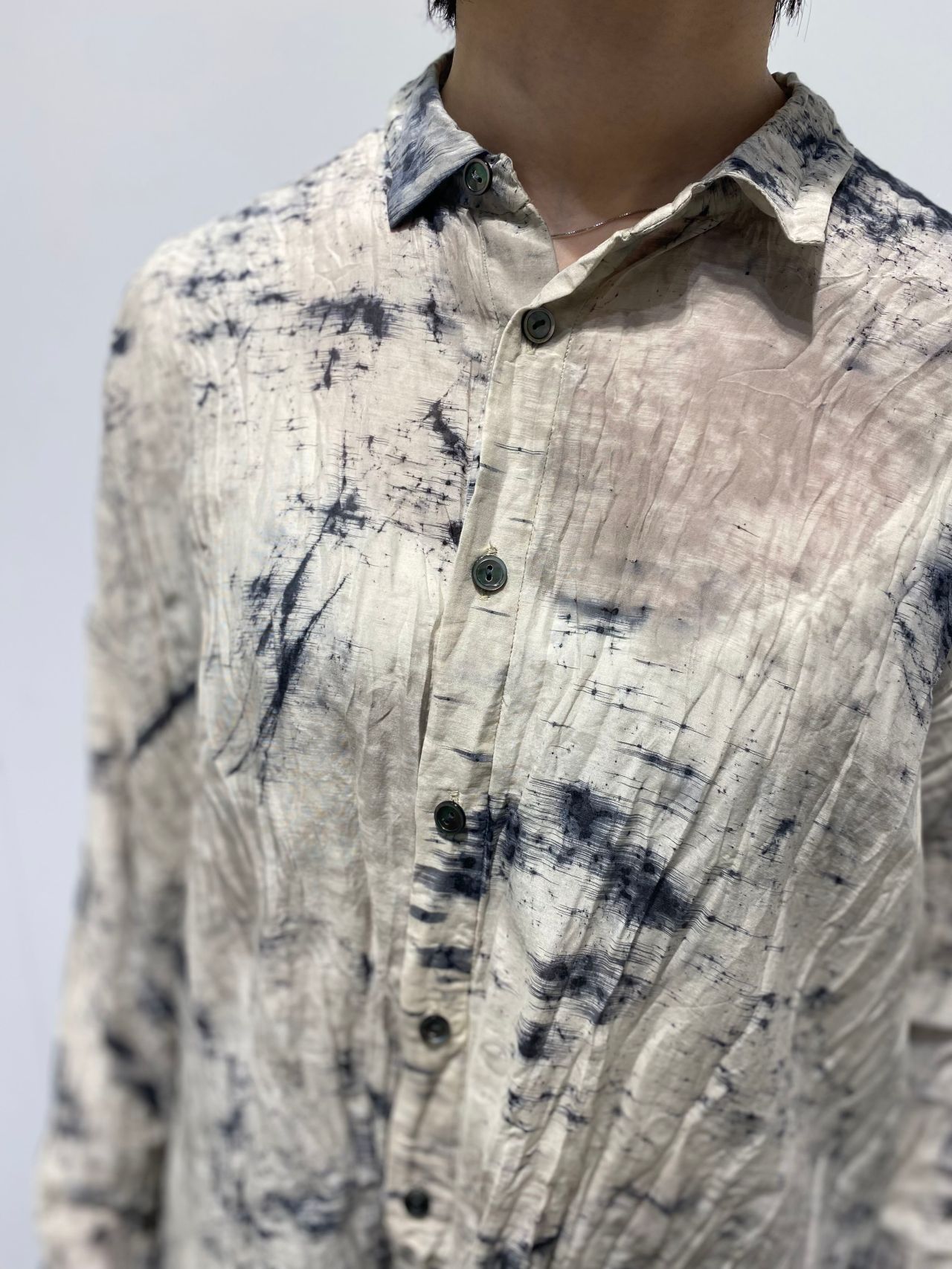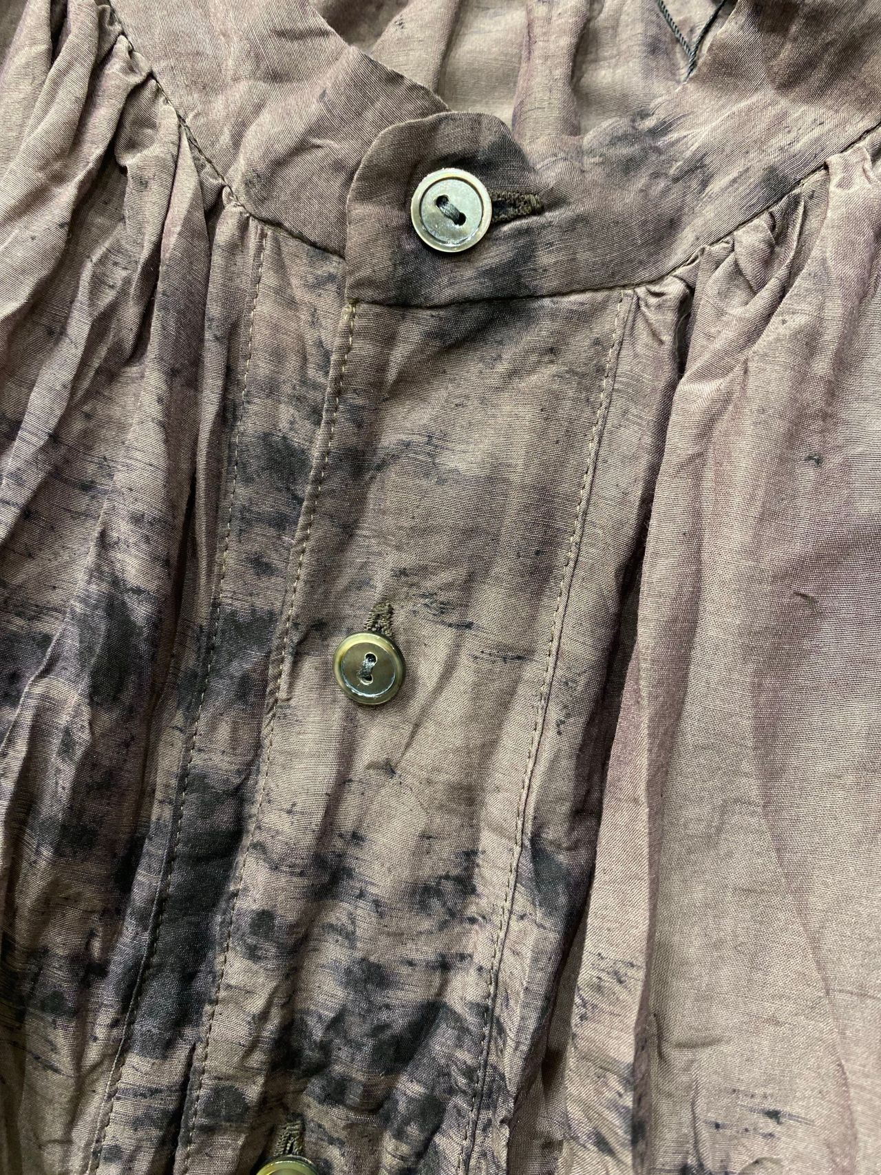 Fabric:コットンの爽やかな肌触りと、シルク特有のしっとりとした肌触り、控えめな光沢感が美しいローン素材。製品で染料をランダムに飛ばし線のように引く、垂らして揉み込むなどで柄付け。その後媒染し、ソービング工程を施すスパッタリングという加工をしている。
