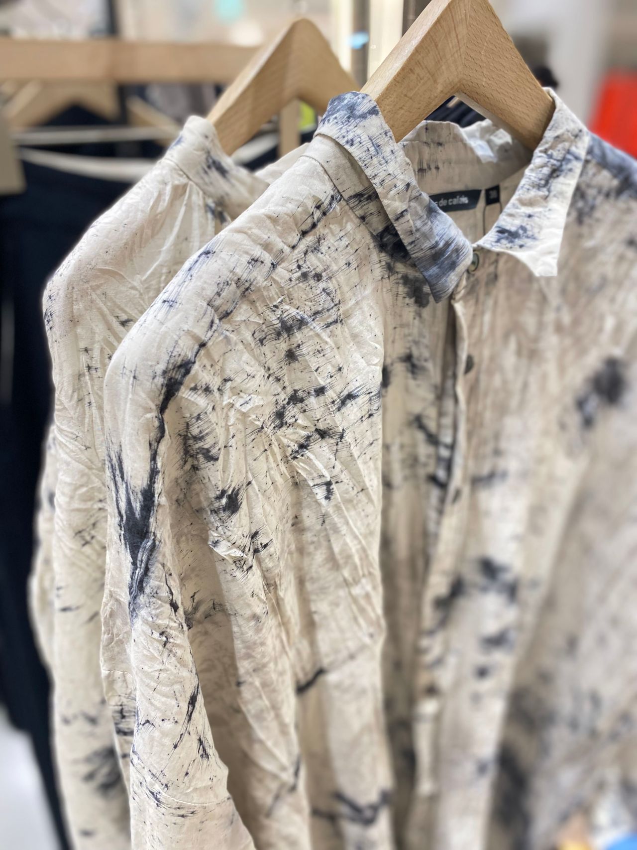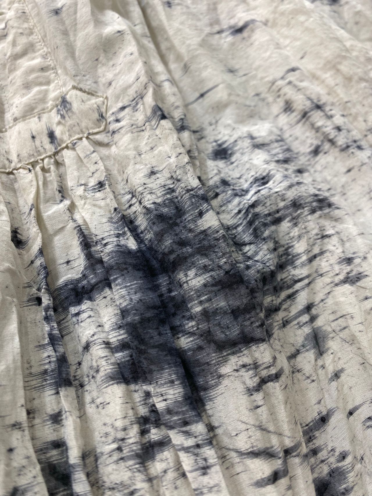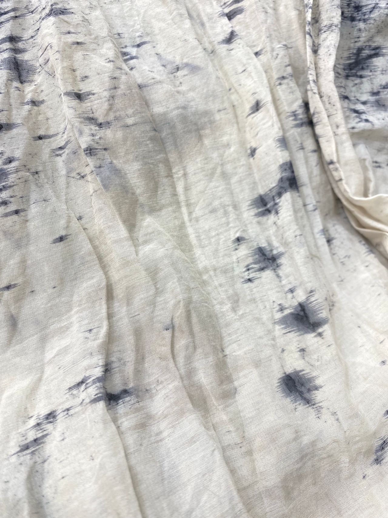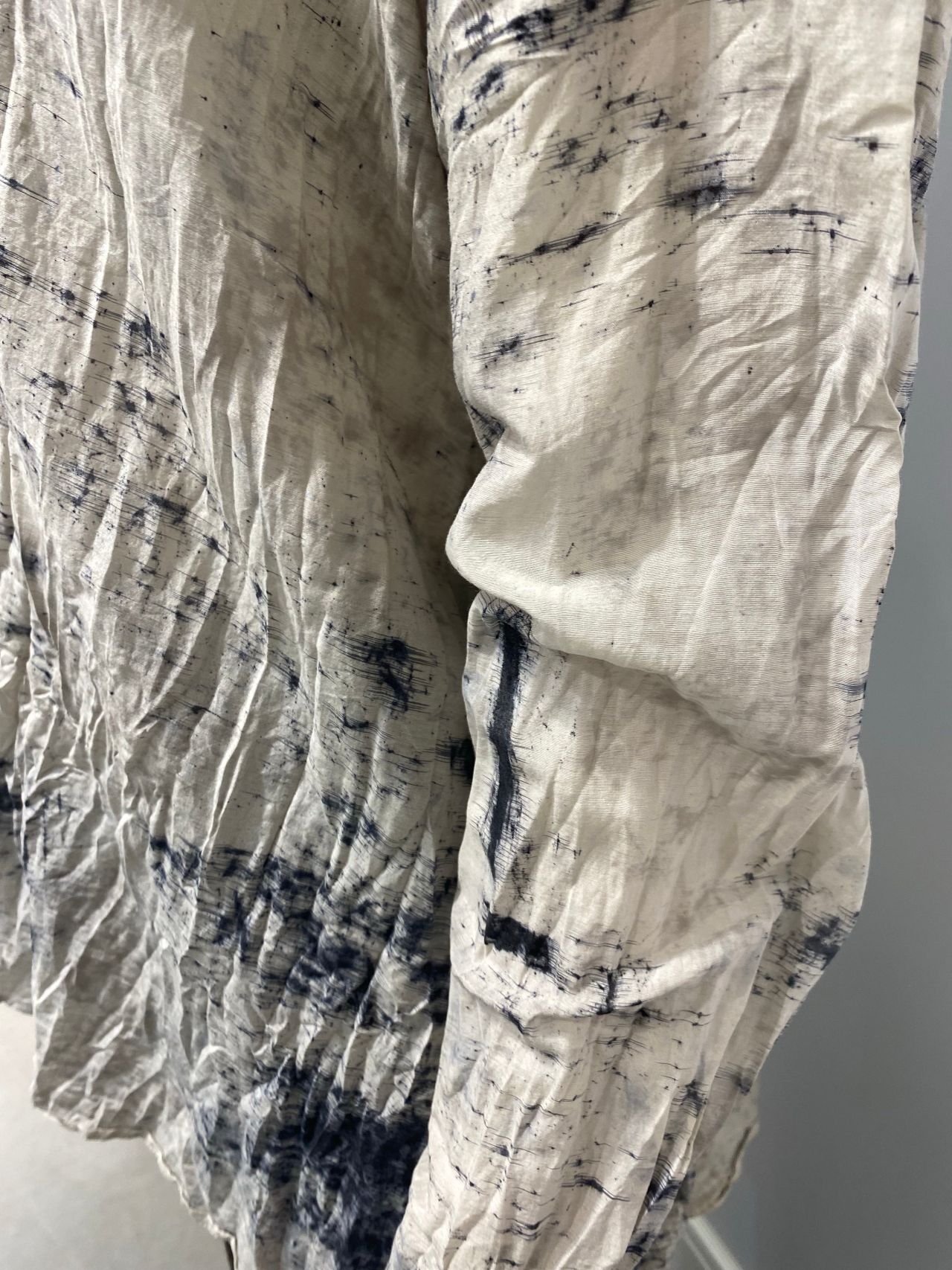 Fabric:コットンの爽やかな肌触りと、シルク特有のしっとりとした肌触り、控えめな光沢感が美しいローン素材。製品で染料をランダムに飛ばし線のように引く、垂らして揉み込むなどで柄付け。その後媒染し、ソービング工程を施すスパッタリングという加工をしている。