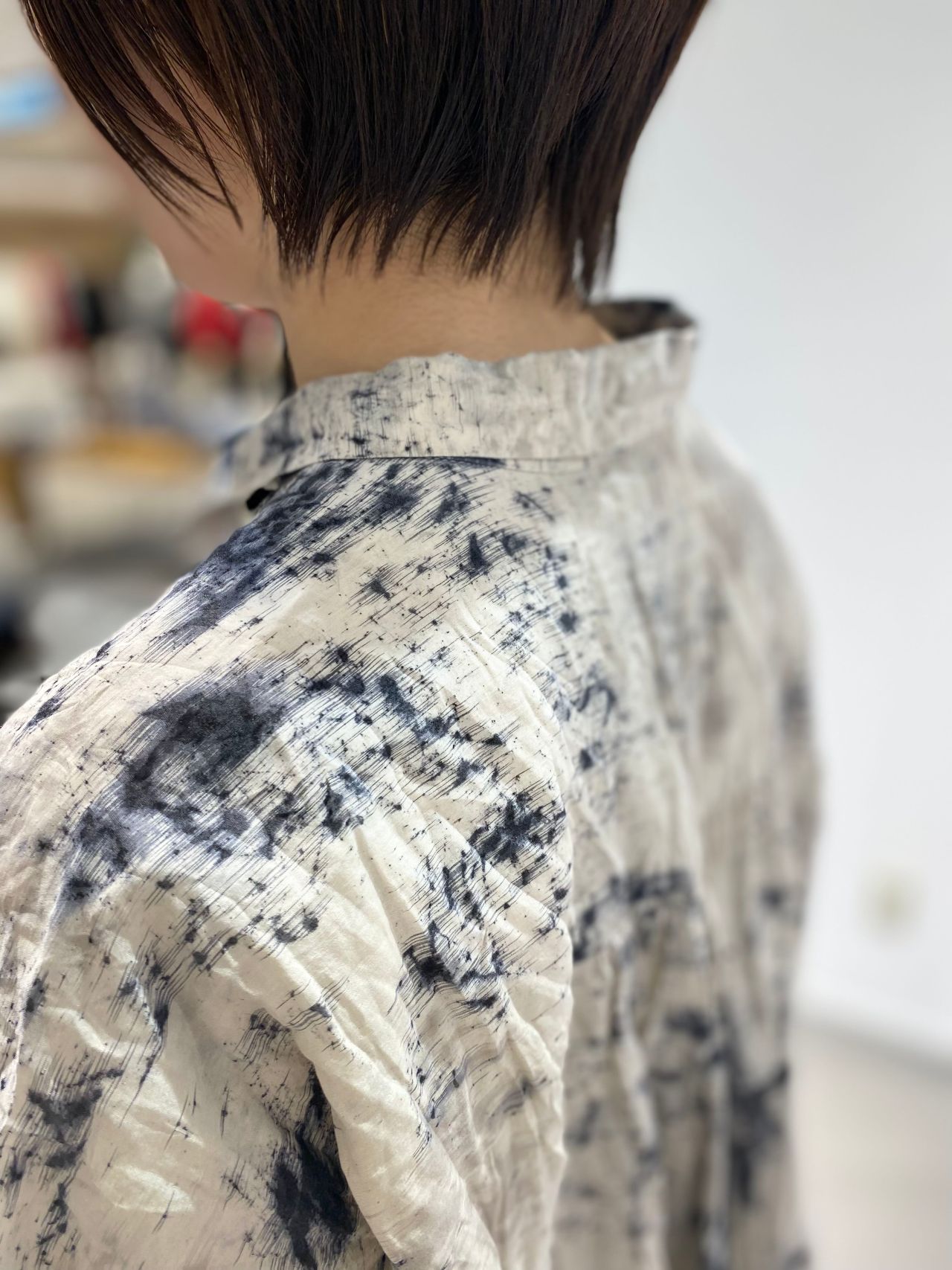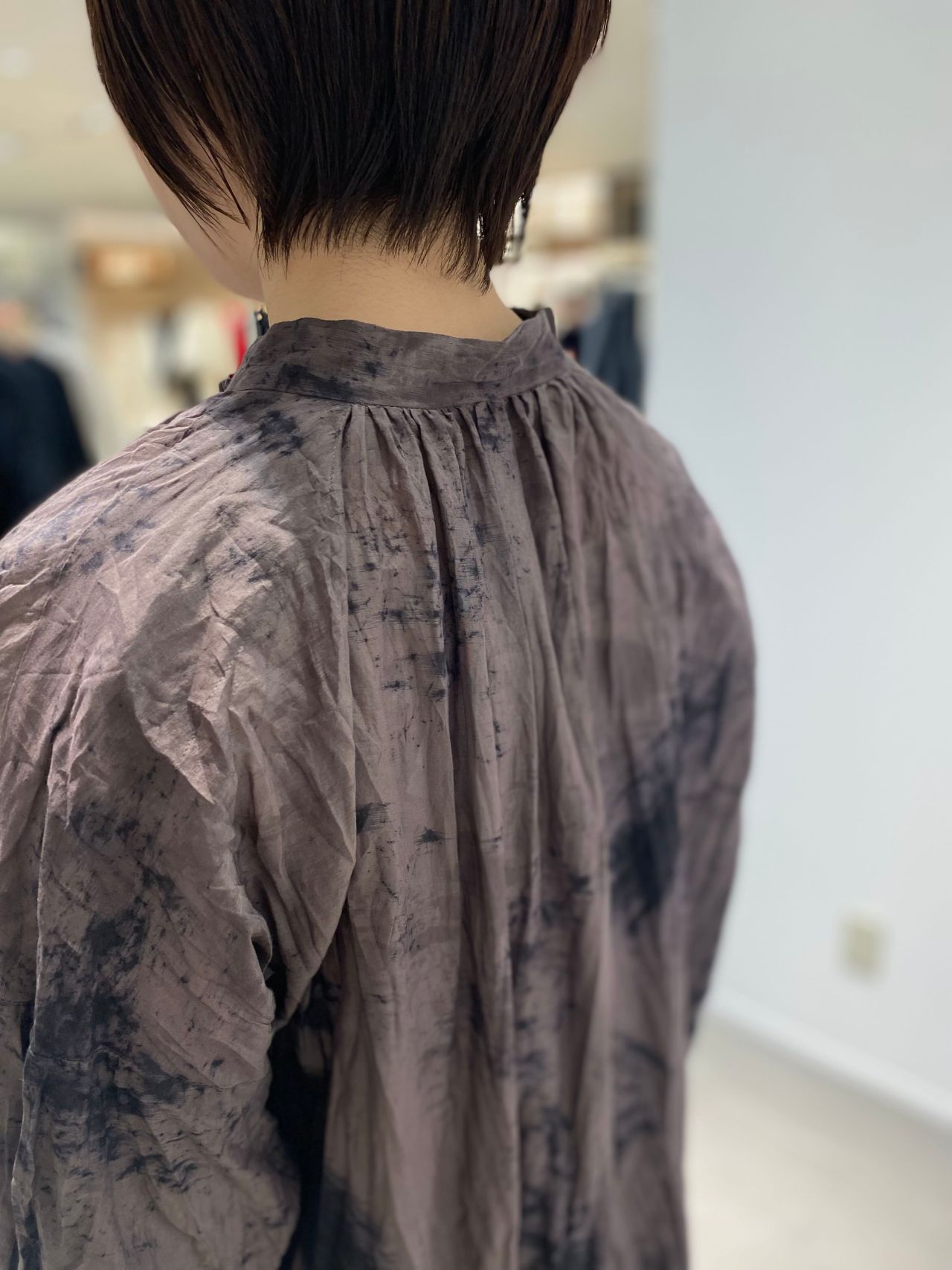 style:スパッタリングシャツプラウス。シャツカラー。バックヨーク下にはギャザーが施されゆったりとしたフォルム感。