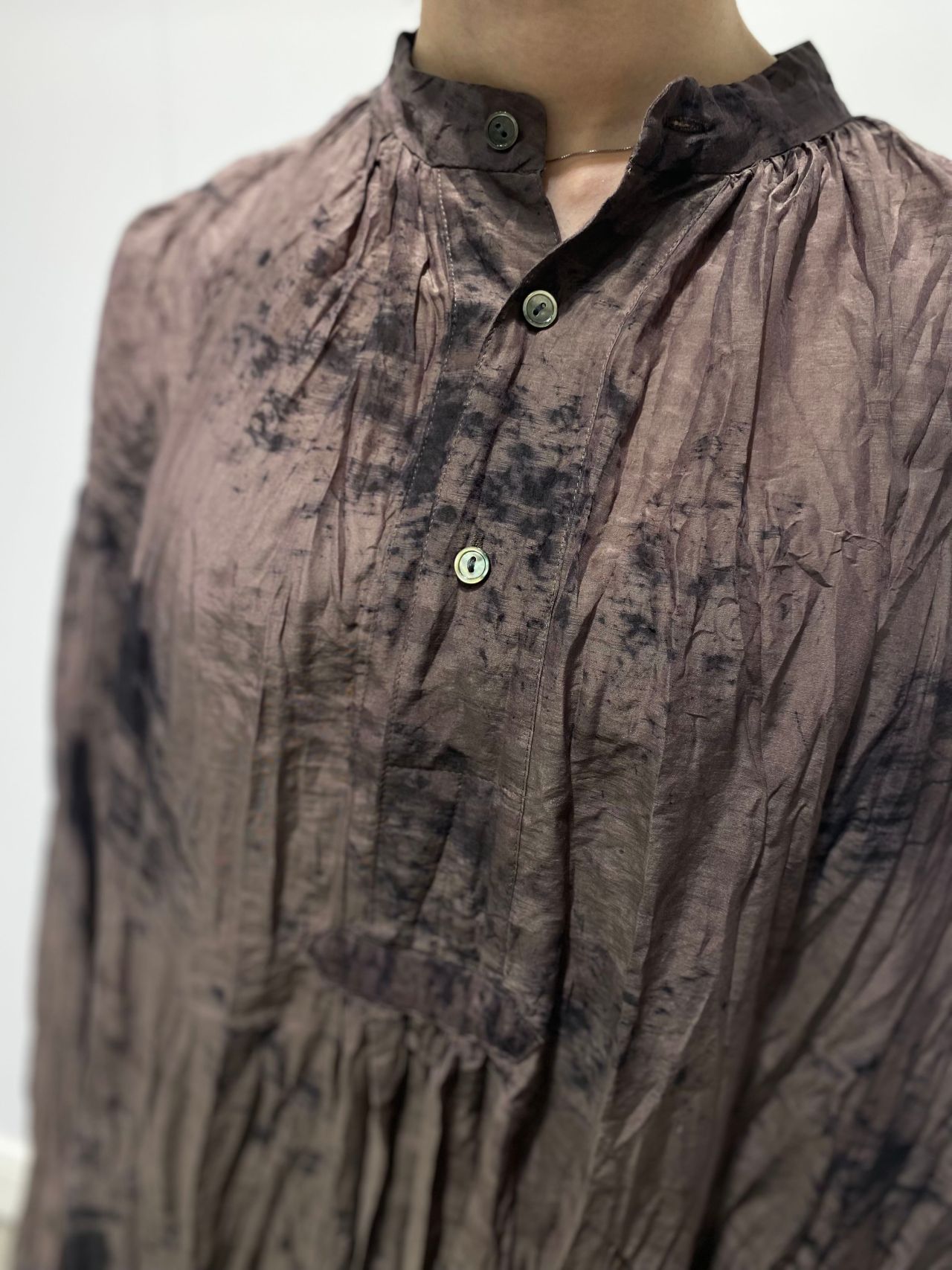 style:スパッタリングポリュームブラウス。スタンドカラーのプルオーバーデザイン。フロント襟下ギャザー・センターバックギャザー入り。ドロップショルダーの抽山にはタックが入りたっぷりとしたフォルムの袖デザイン。