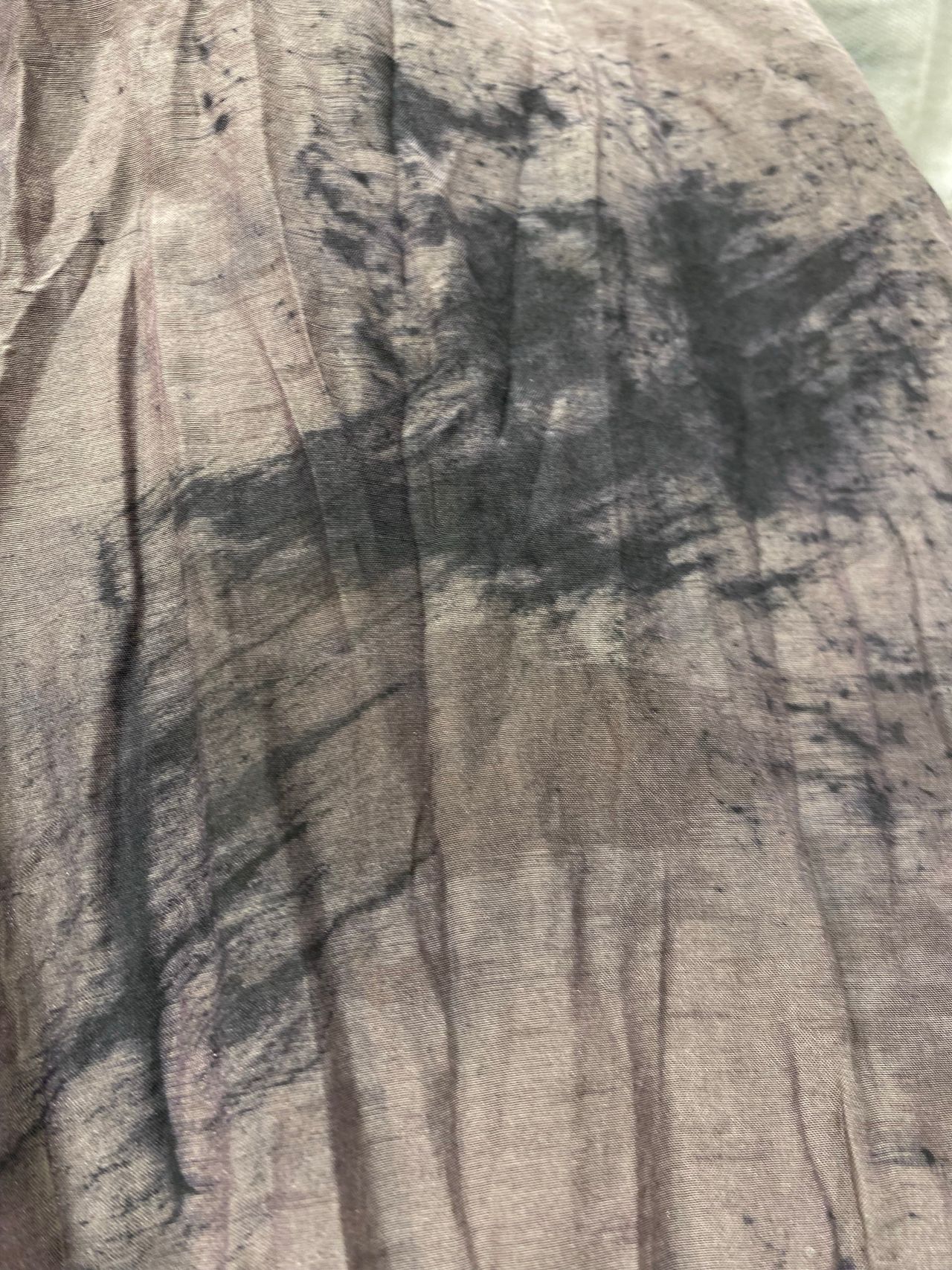 60:ブラウン→黒の柄部分:墨、ログウッド、ひよこ豆の粉などの粘度ある物を使用。水しみ柄部分:カテキュー、ひよこ豆の粉を柔らかく溶いた物を使用して表現している。