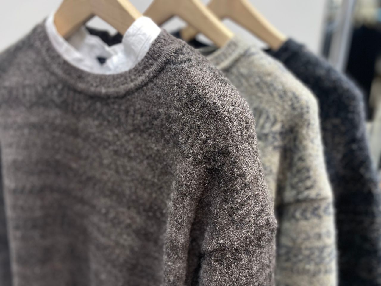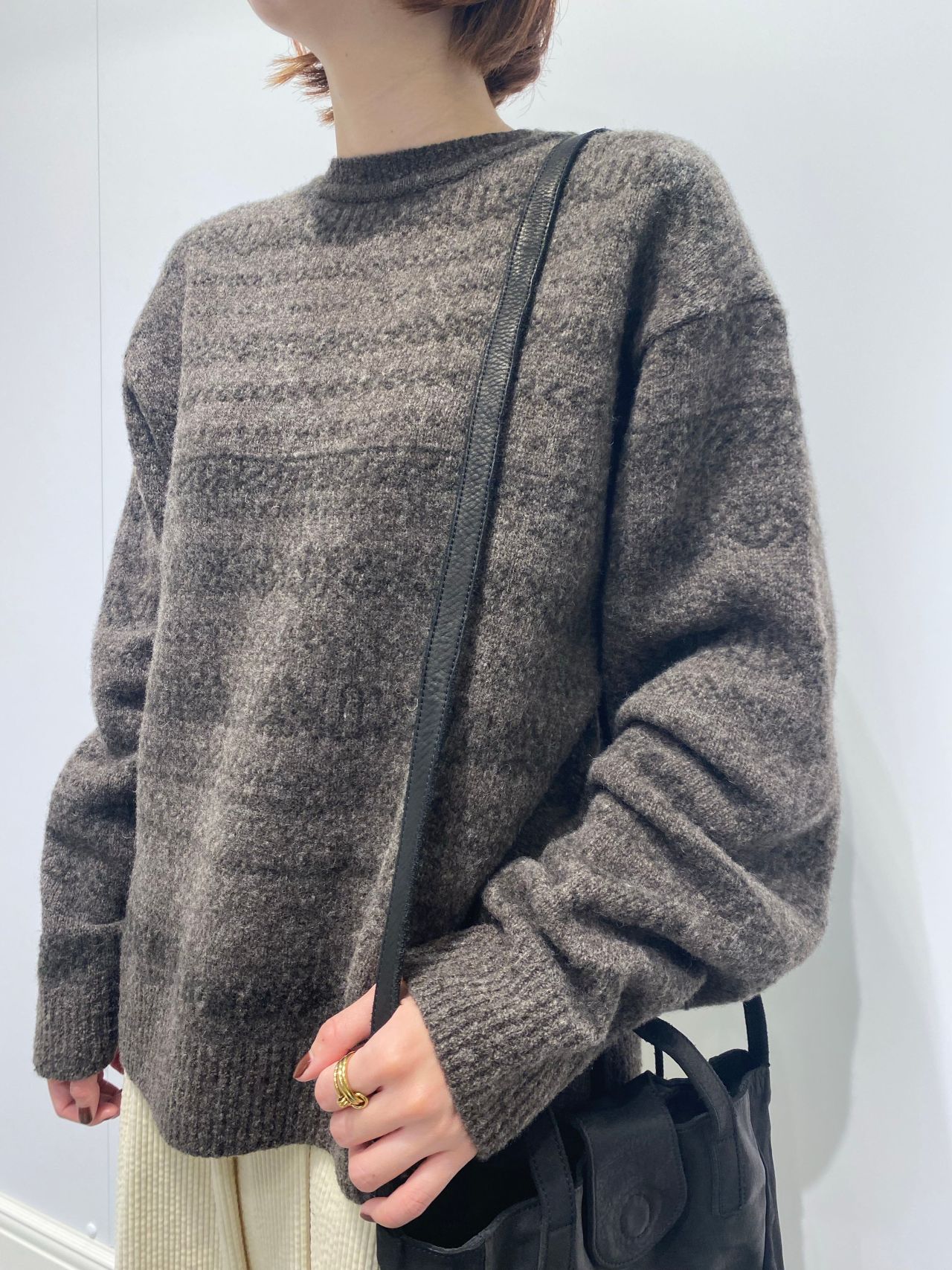 style:少し懐かしさのあるフェアアイル柄を形状の異なる、ストレート糸とブークレー糸でジャカード編みで表現したアイテム。ニュアンスのある同系色で掛け合わせている為、色馴染みも良く、シンプルなクルーP/Oも、コーディネートのポイントにオススメ。