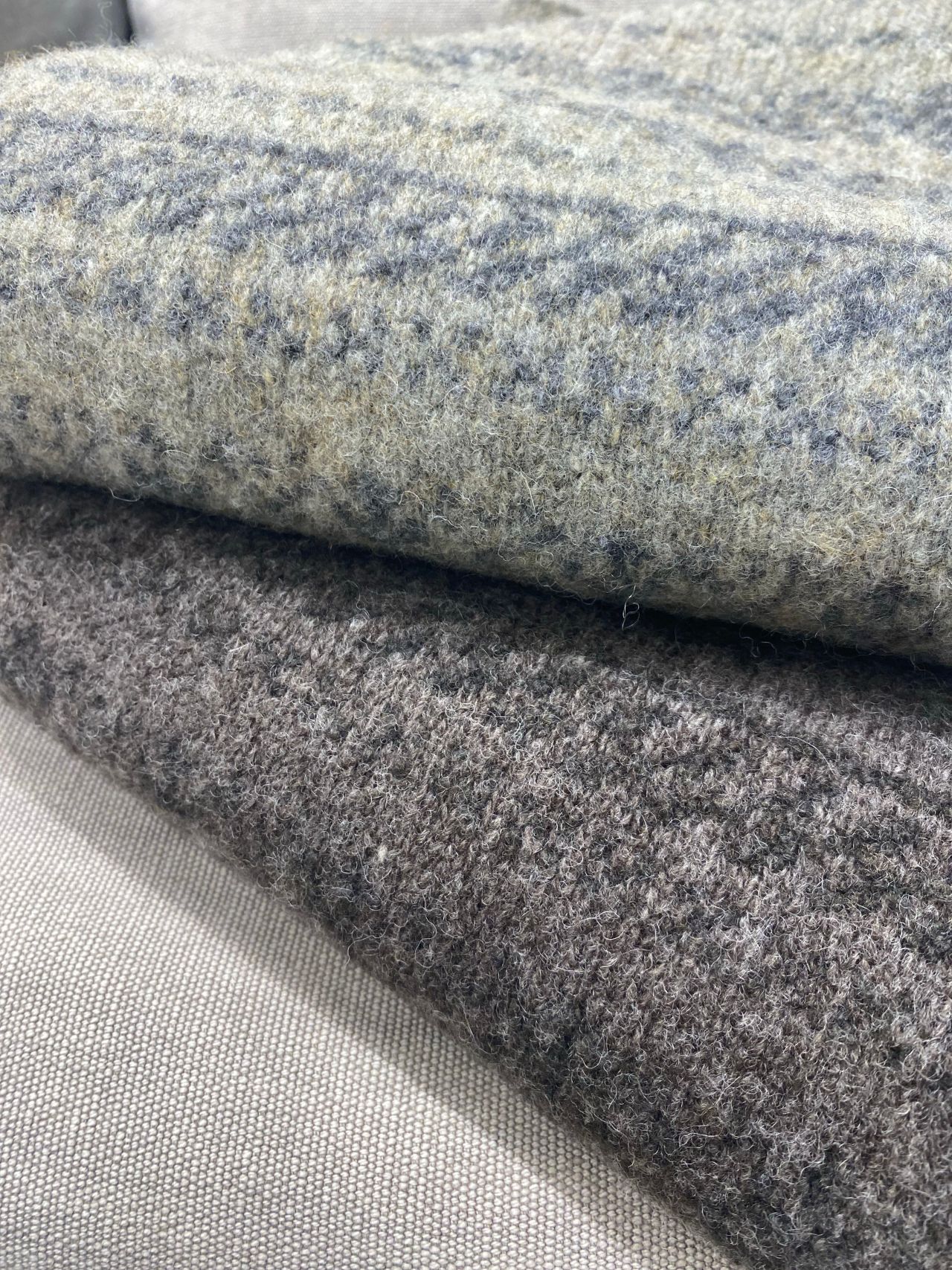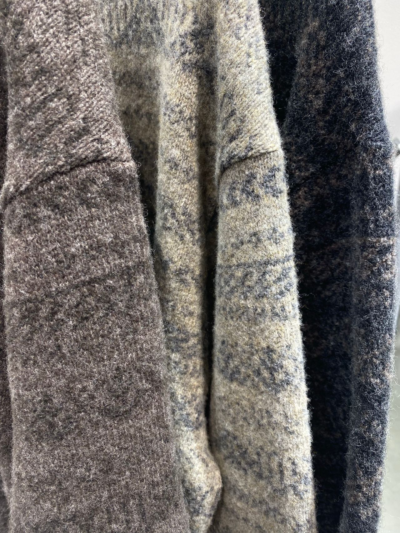 Fabric:非常に細番手のウールを使用した、スポンジッシュな紡毛糸と、同素材のウールをブークレー加工した撚糸ブークレー。オールウールで深みのあるメランジ・カラーも特徴の一つ。