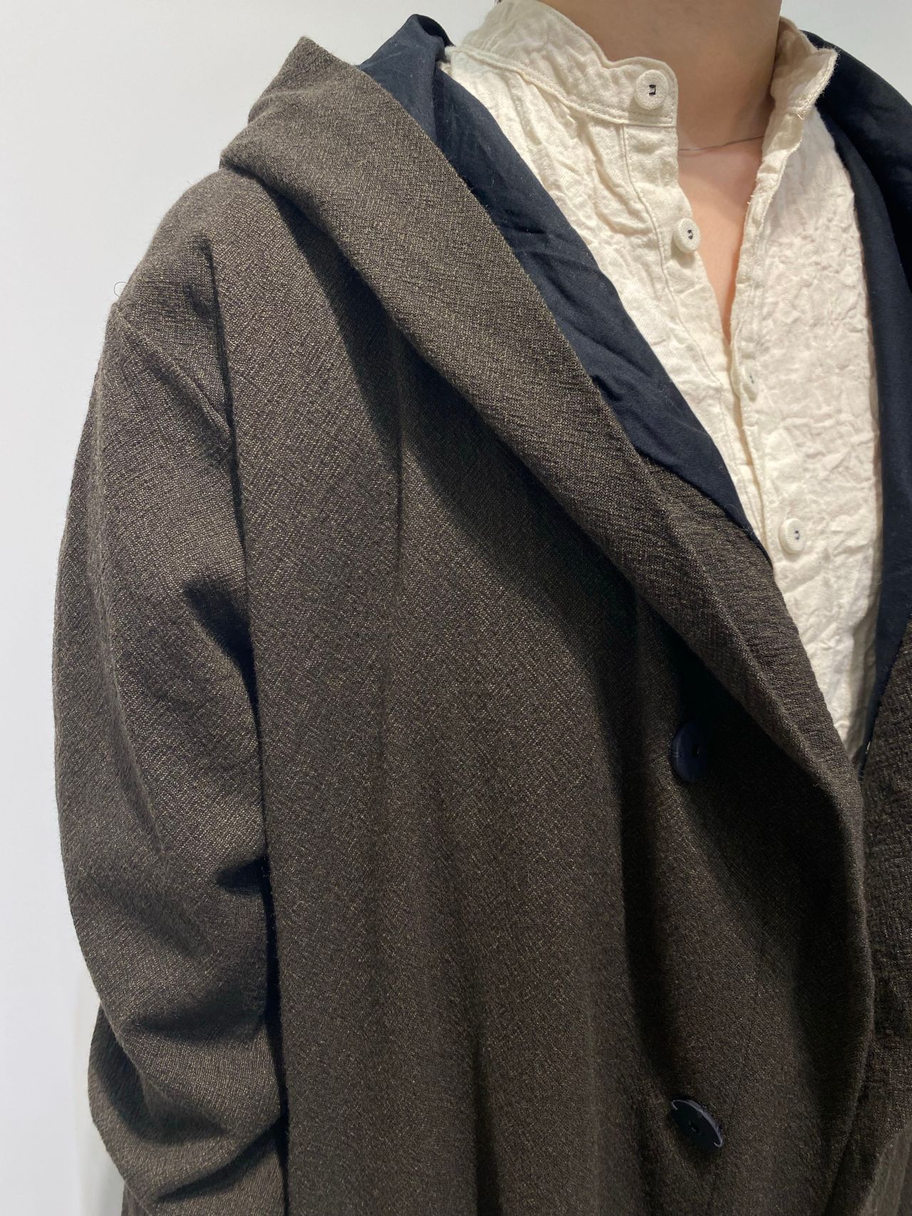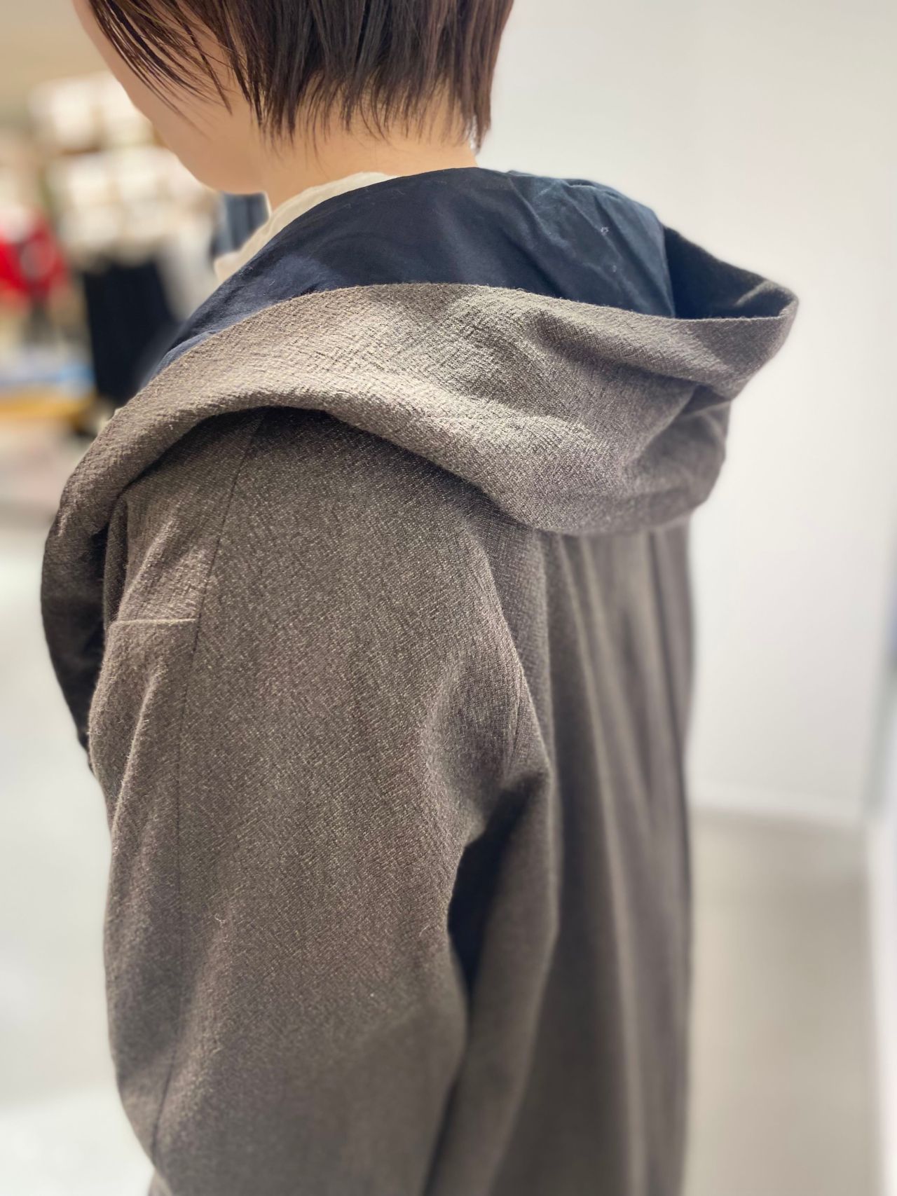 style: フーデッドコート。前の抽ぐりはセットイン、後ろはラグランスリーブのスプリットラグランスリーブ。背面のゆとりで、うでの動かしやすさを維持しながらも前面のシルエットはすっきりしたライン。スナップ釦がポイント。裏地付き。