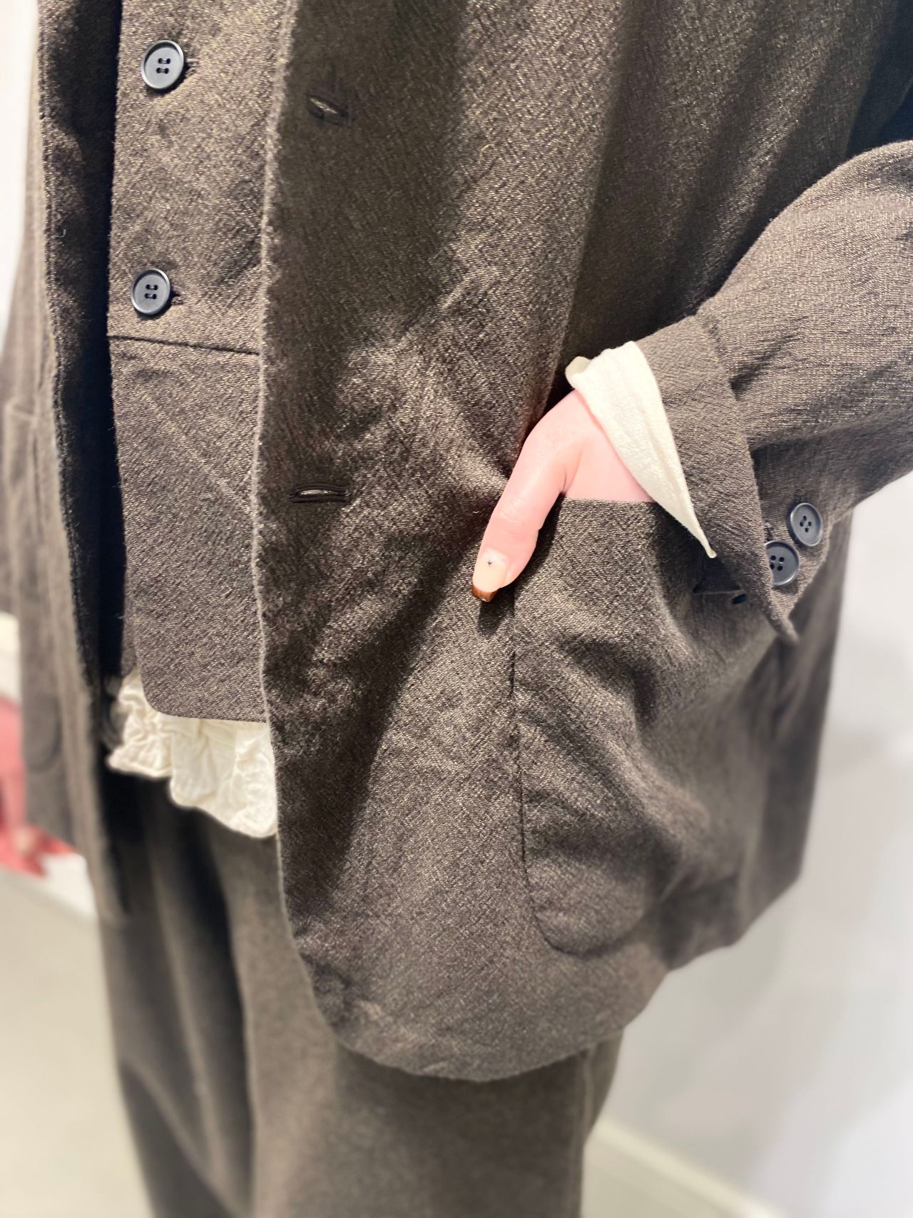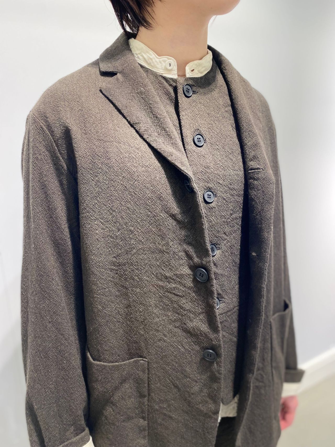 style: 3つポタンのテーラードジャケット。スタンダードなメンズライクなシルエット。中縫いのパッチポケットがポイント。裏地付き。抽裏には滑りの良いベンベルグ素材を使用。センターバックべンツあき。