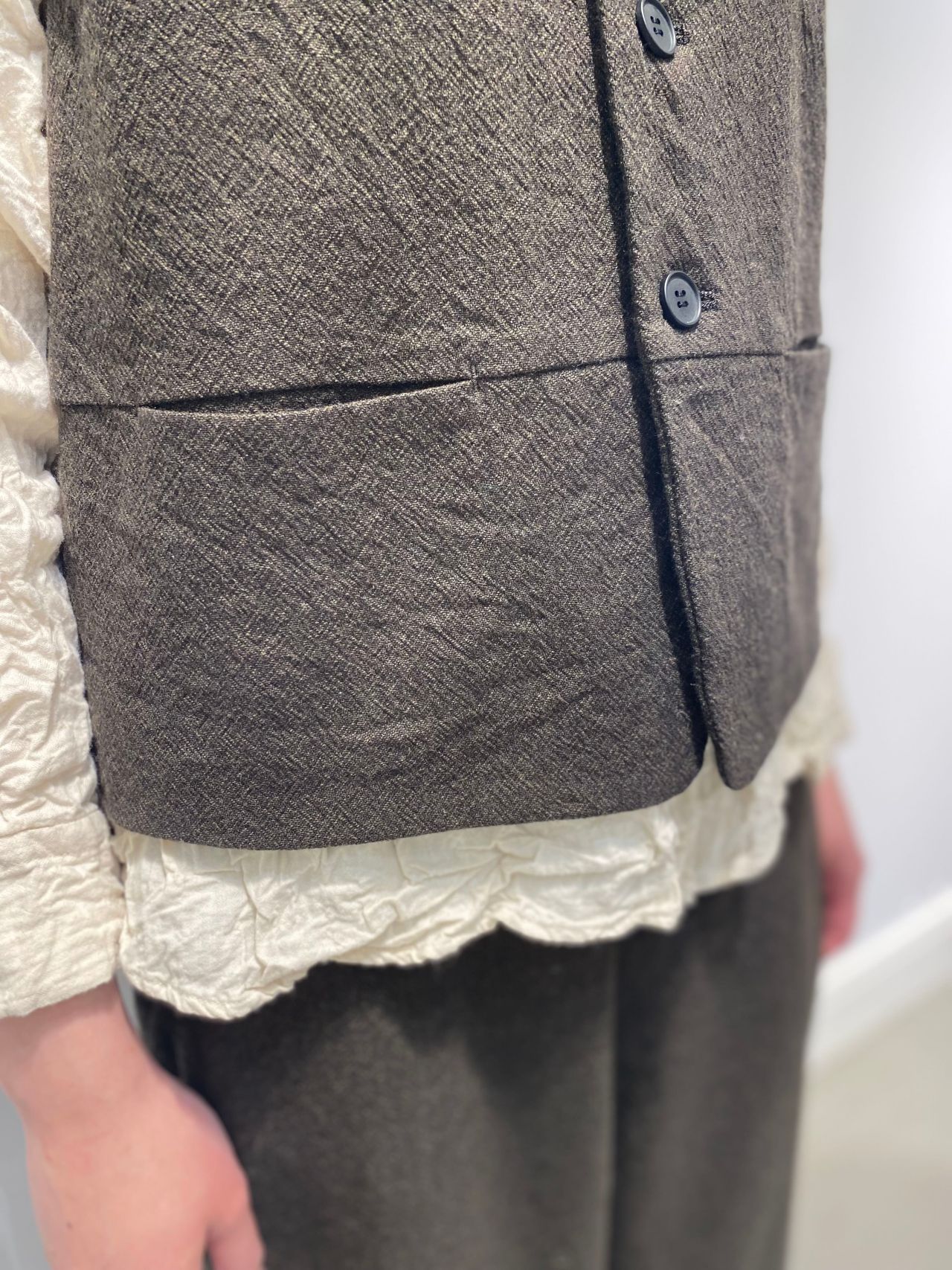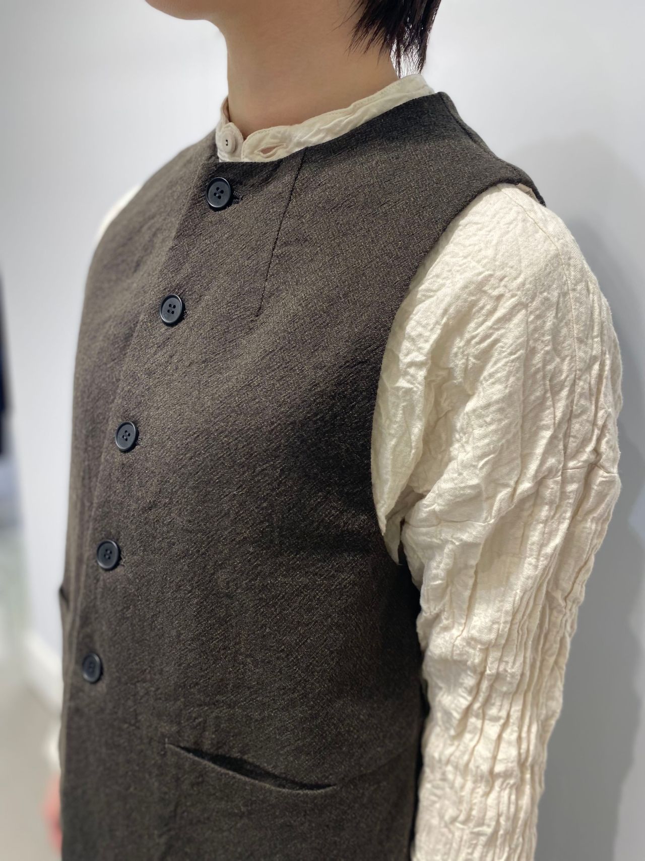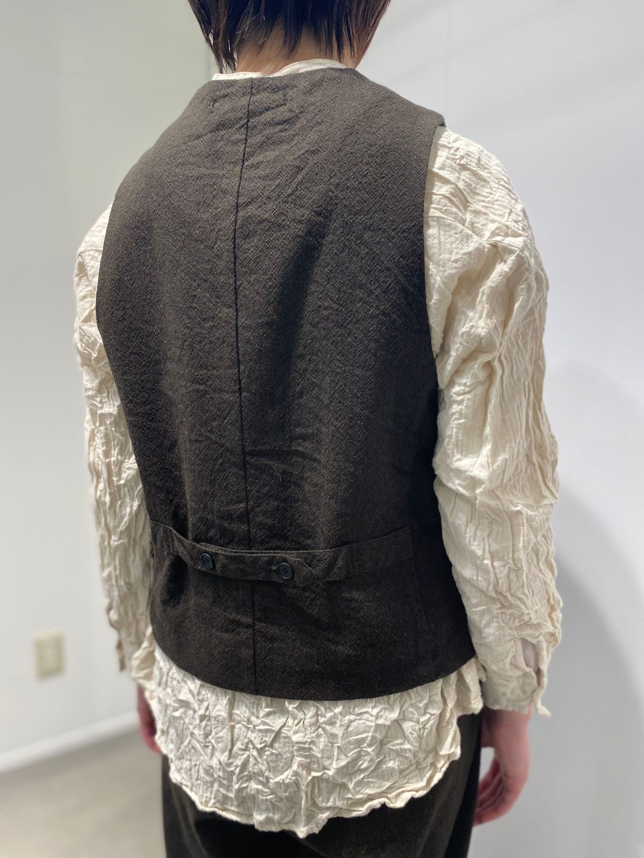 style:クルーネックのジレ。バックサイドにはタブが付き、シルエットの調節可能。襟もとのダーツがクラシックな印象。フロント切り替え利用のポケット付き。