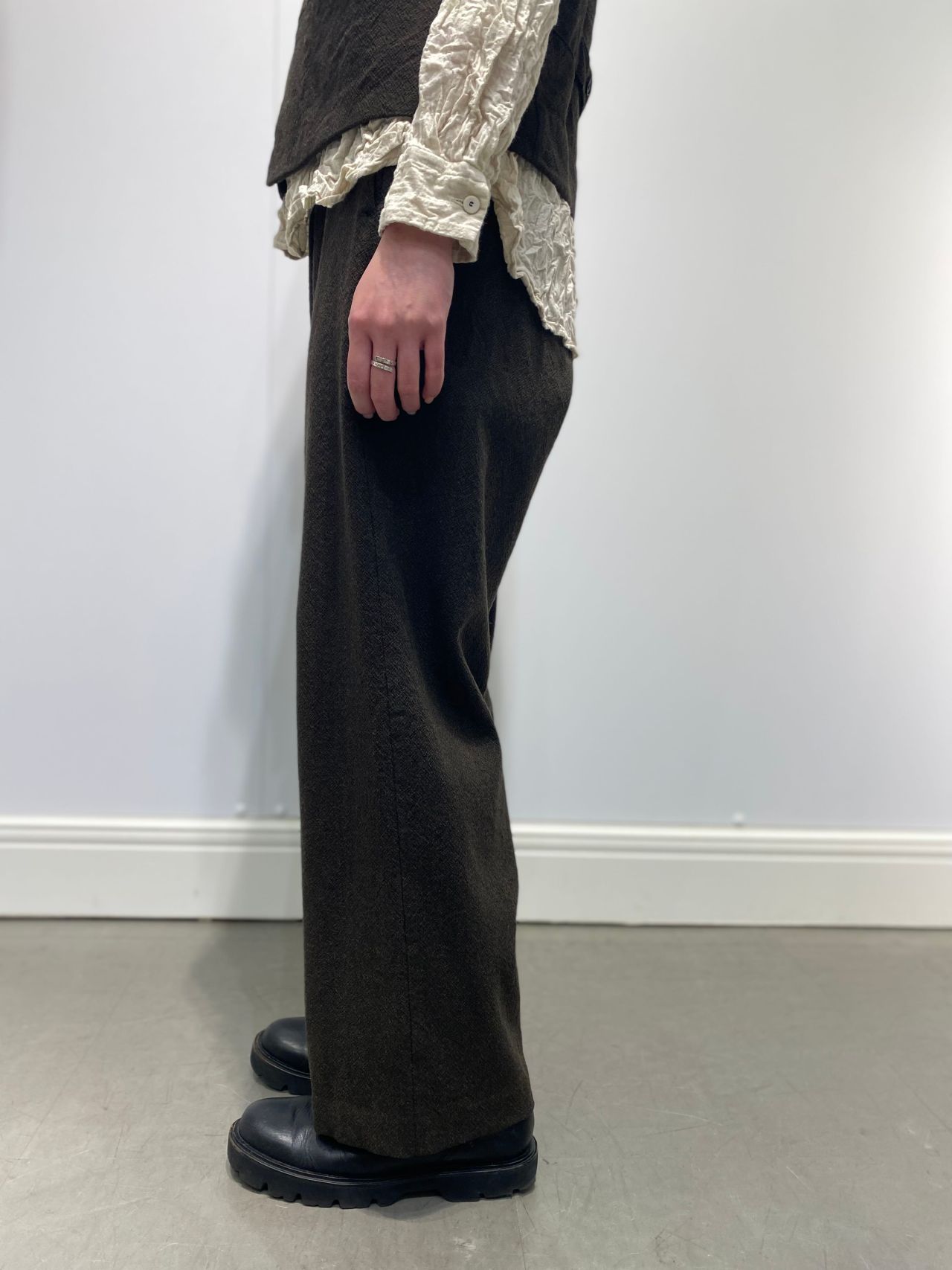 style:ワイドパンツ。リラックスしたシルエット。フロント釦とファスナーあき。べルト通し付き。ウエストべルトは、脇から後ろにかけてゴムが通リアジャスト可能。両サイドポケットあり。