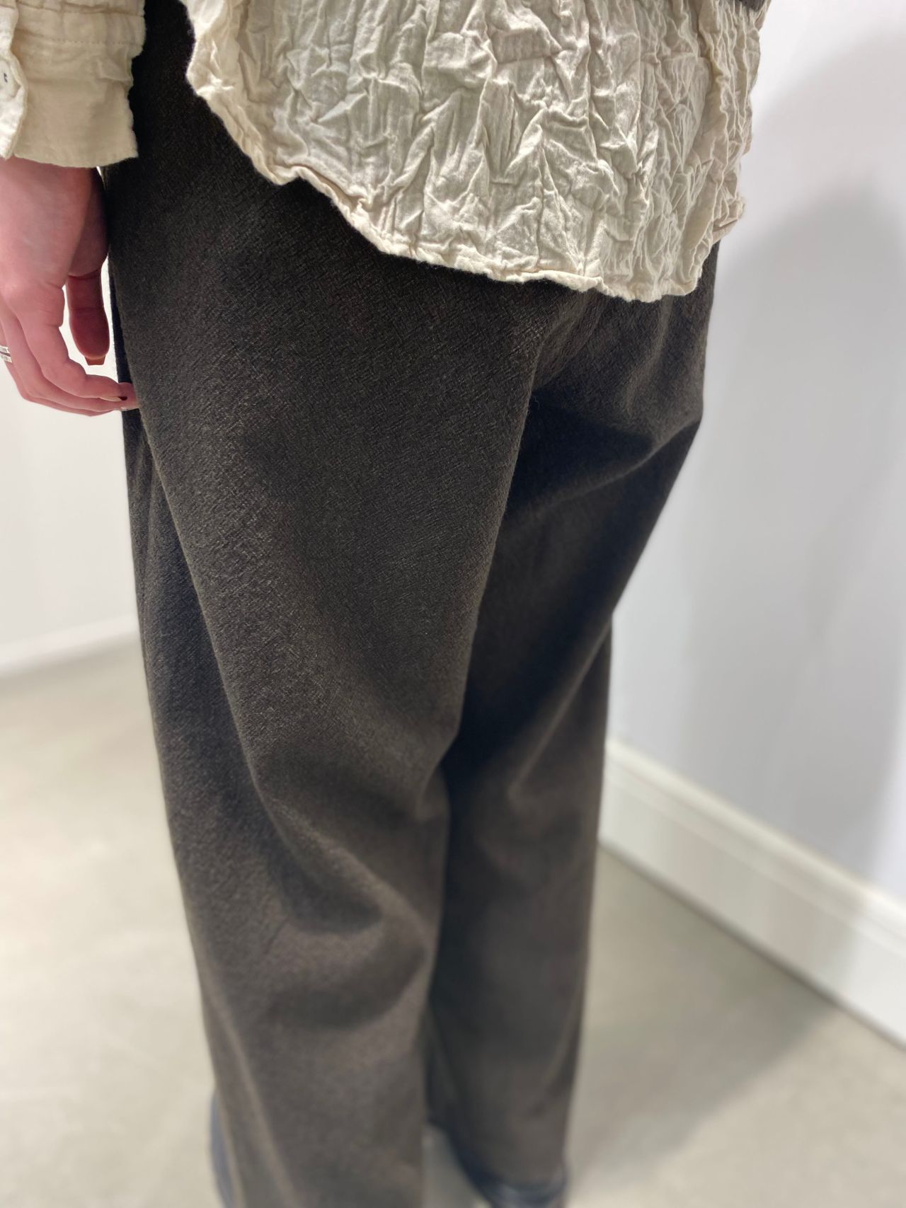 style:股上がやや深めのテーパードパンツ。ウエスト周りはすっきりとしたシルエット。フロントはボタンフライ仕様。ウエストベルトには内紐が通り調節可能。両サイドポケットあり。