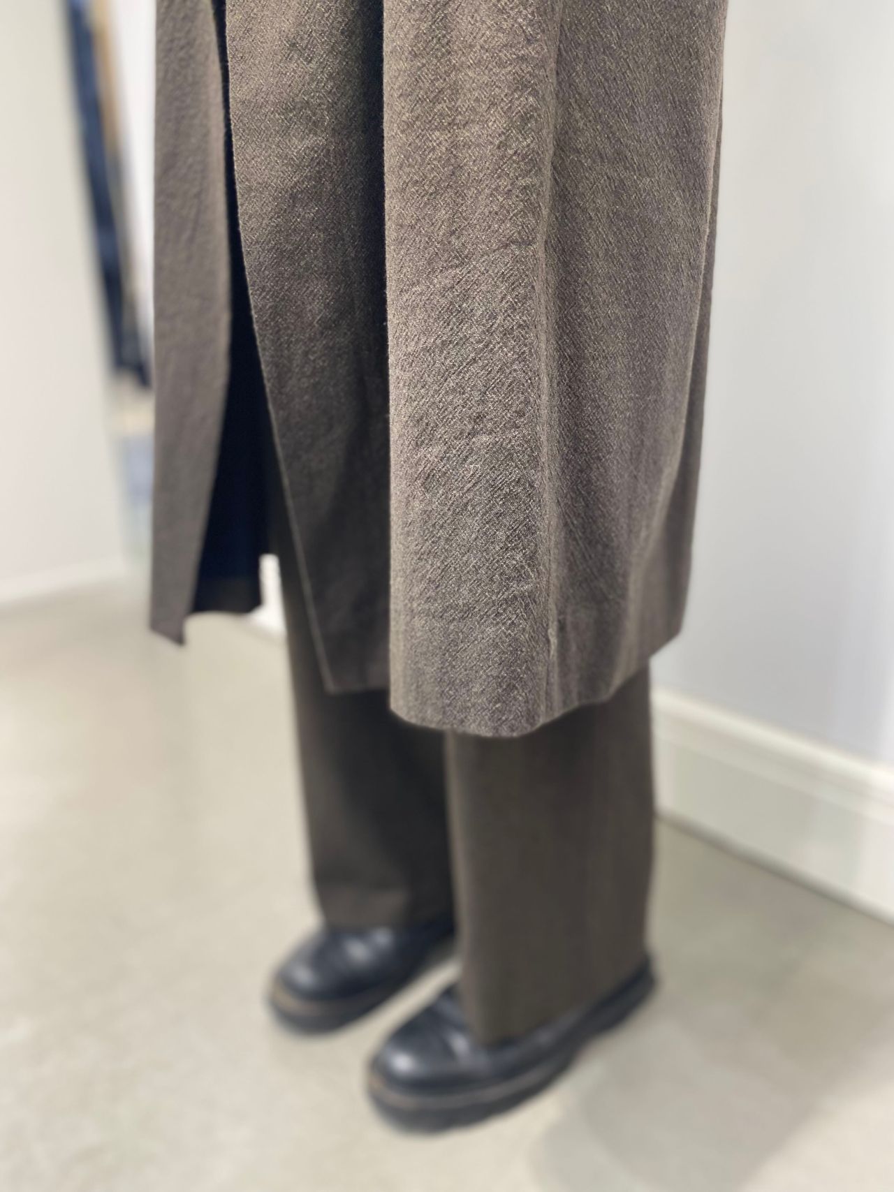 Fabric: ノンミュールジングウール原料をタテ系に使用。膨らみ・反発感が特徴。ヨコ糸には綿を使用しタンブラー仕上げにすることで、より一層の膨らみと柔らかさをもった独特な風合いに仕上げている。