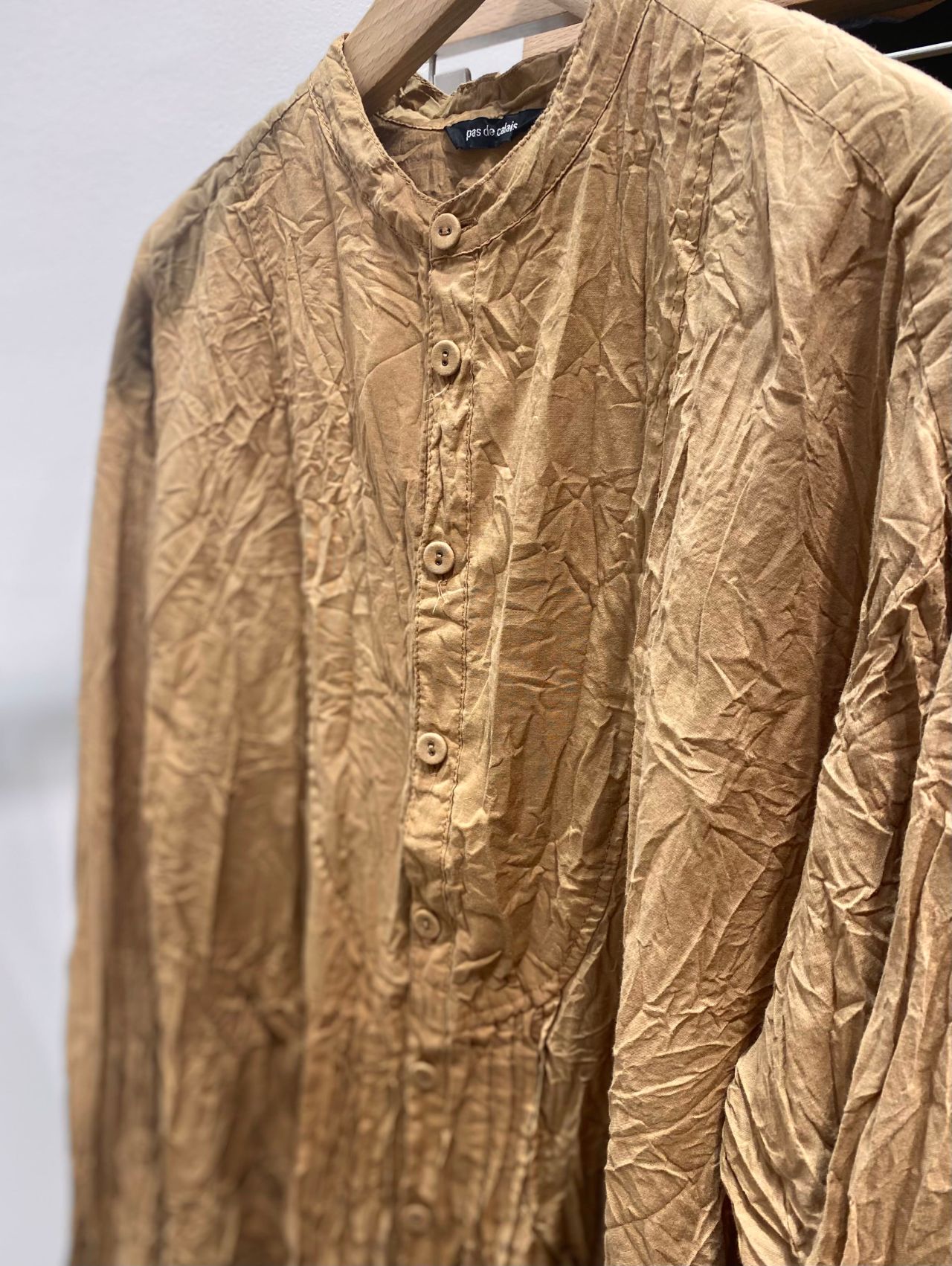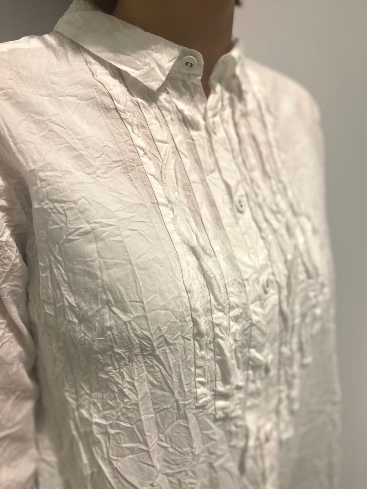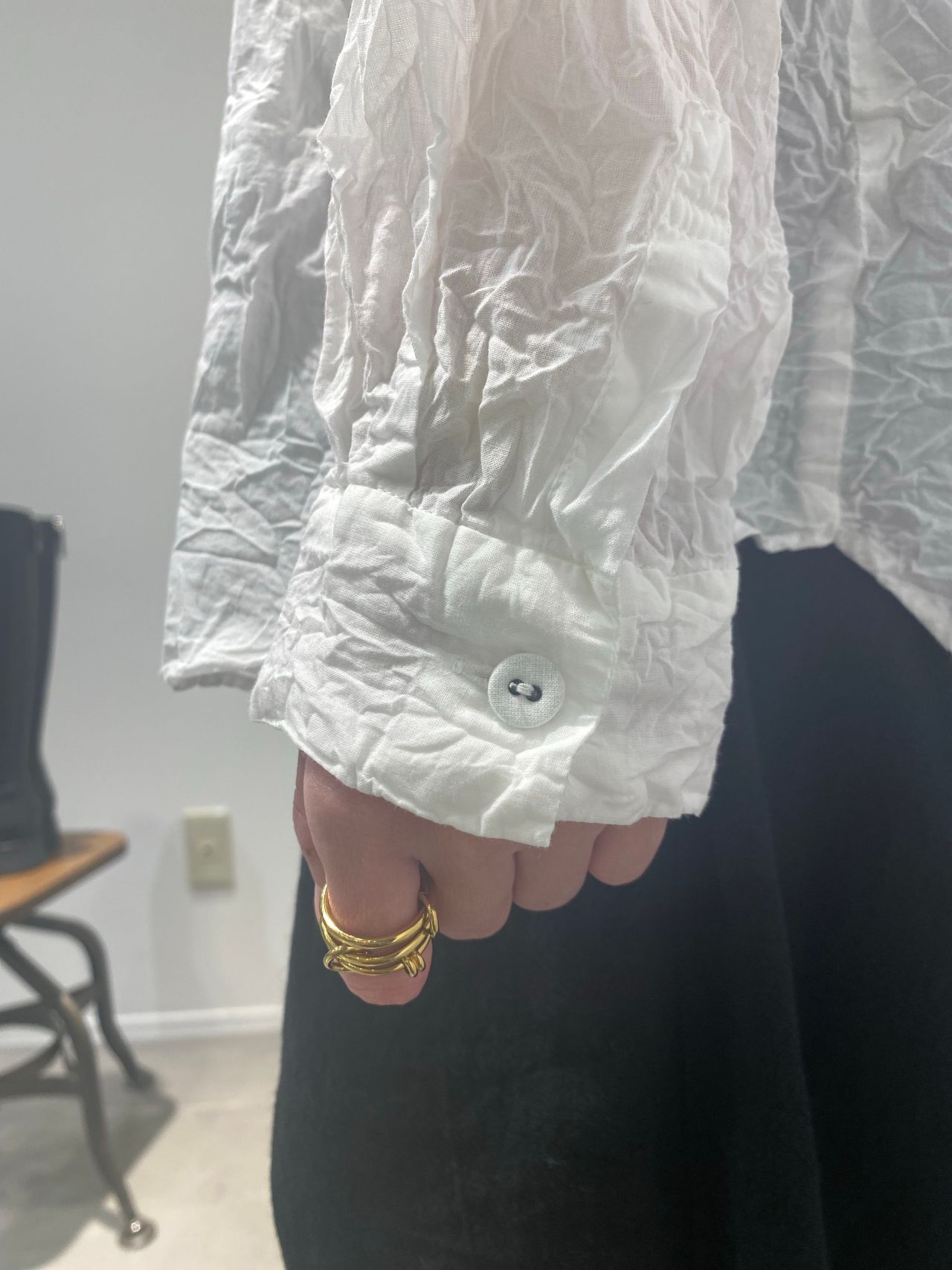バンドカラー: フロントの切り替えがクラシカルな印象のブラウス。ドロップショルダーで少しオーバーサイズのゆったりとしたサイズ感。スタンドカラーでマニッシュな印象に。