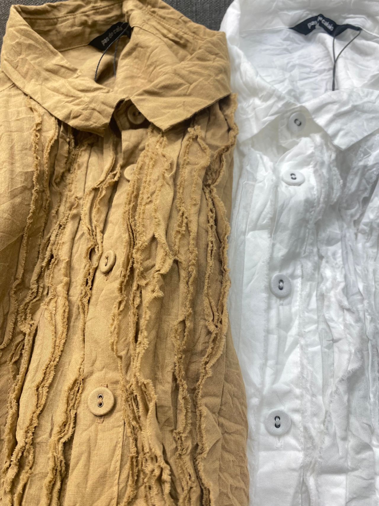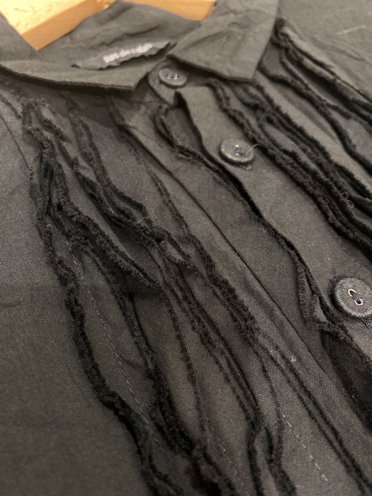 スタンダードカラー:断ち切りテープが印象的なフリル付ブラウス。2本の断ち切りのテープを上下で太さを変え、ずらしてたたきつけることで、不均一な動きと表情を出している。スタンダードなコンパクトシルエットでどんなアイテムとも合わせやすいブラウス。