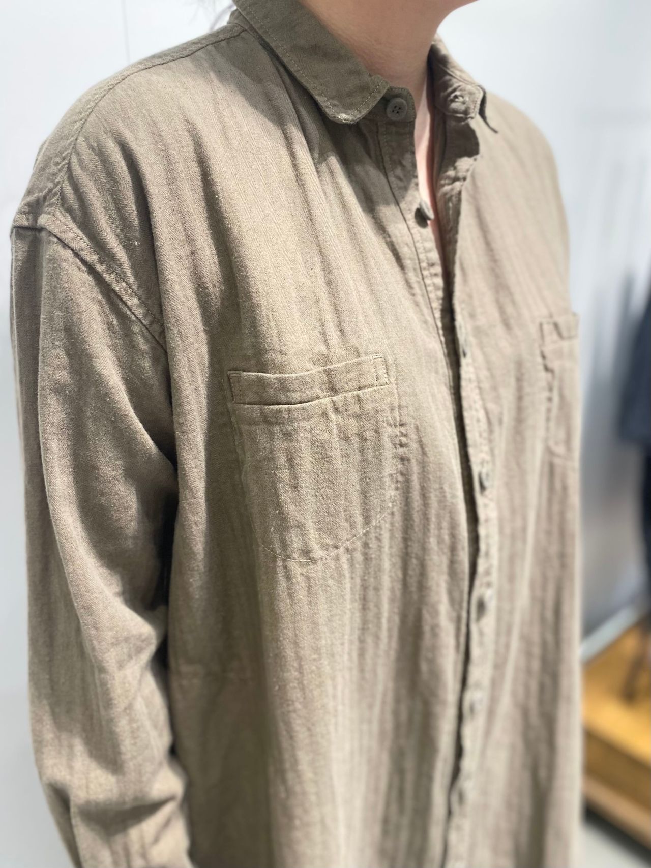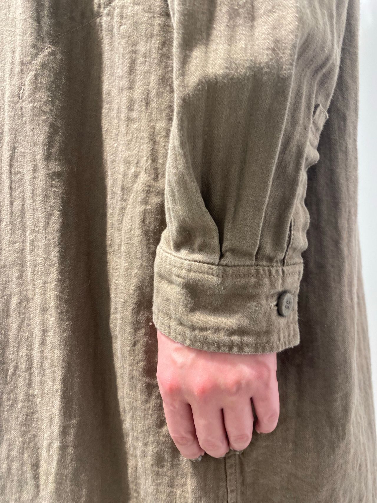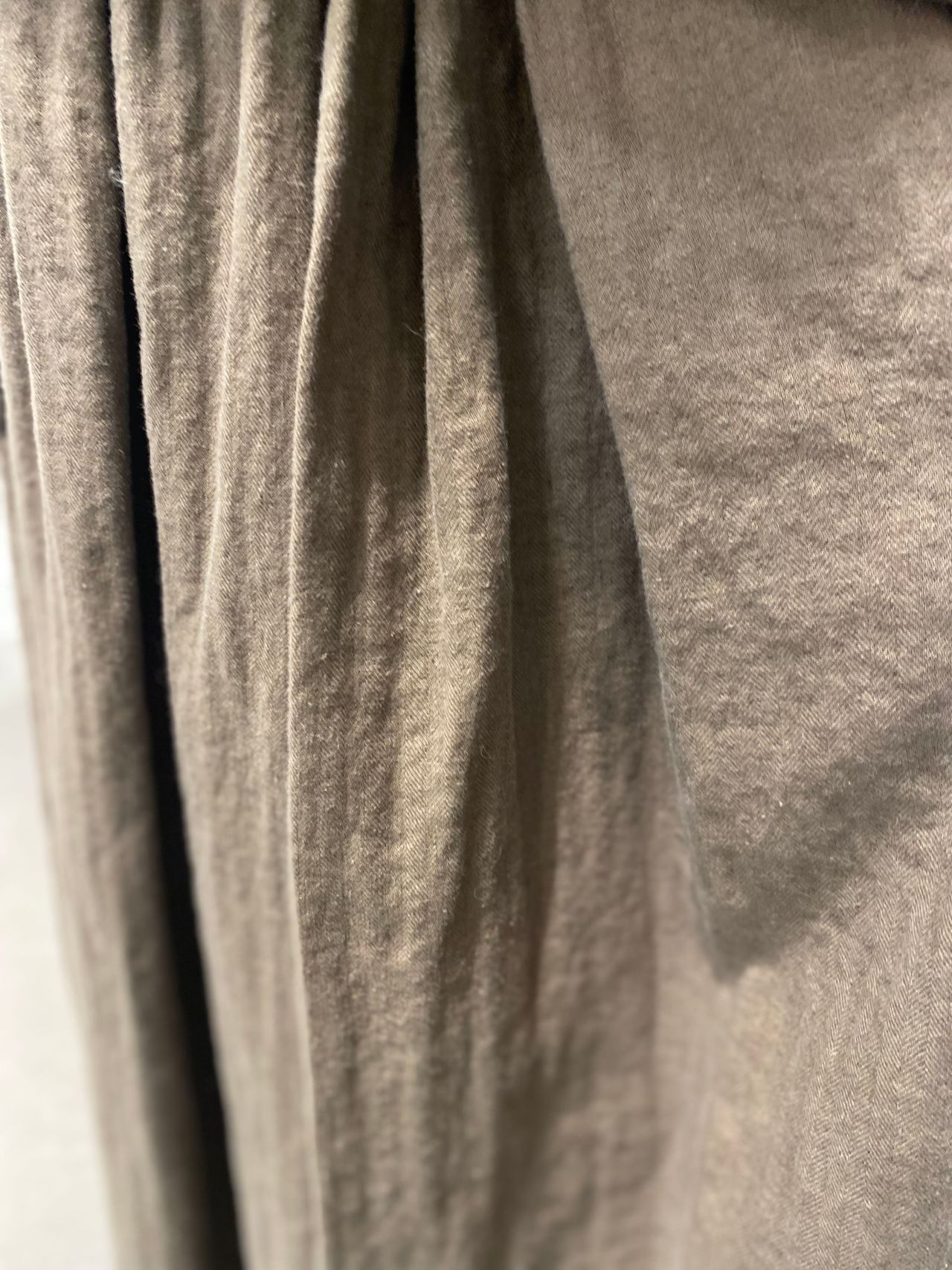 Fabric:綿麻の混紡糸で織ったヘリンボン素材。織りあがった後にワッシャー加工をすることで、ナチュラルな風合いを残している。製品染めを施し、柔らかさと膨らみを出している。
