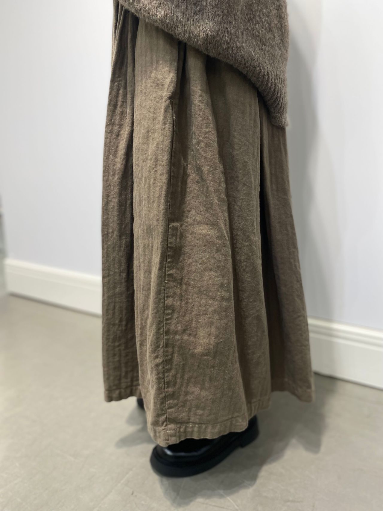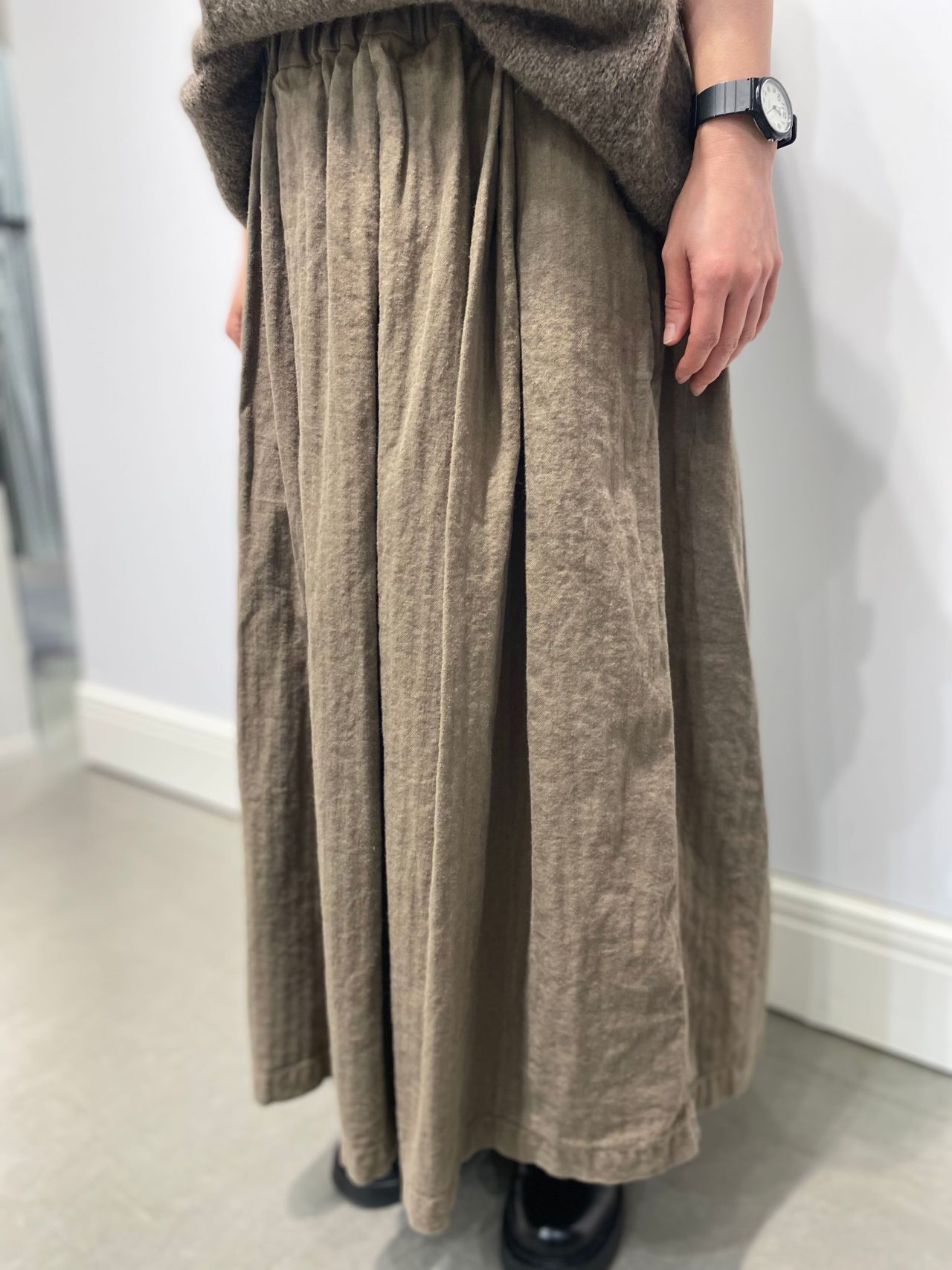 Style:タックフレアスカート。ランダムなタックで分量と動きを出した。ウエストはゴム仕様で楽な履き心地。ウエストベルト内側に紐を通し、安定感のある仕様になっている。