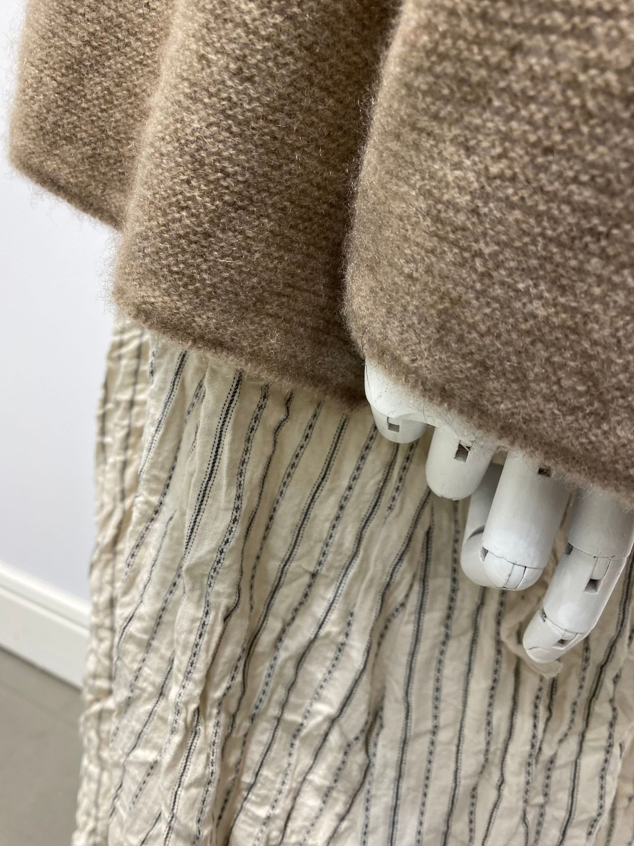 ウールよりも柔らかく繊細な質の為、一日着用したら、2~3日は休ませるのがおすすめ。また着用後に柔らかなブラシで軽く汚れを取り除いたり、メンテナンスすることで、ダメージも軽減され、永く楽しめる。