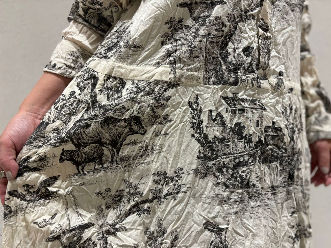 滑らかなコットンローンにtoil de jouyプリントをふんだんに使ったワンピース。