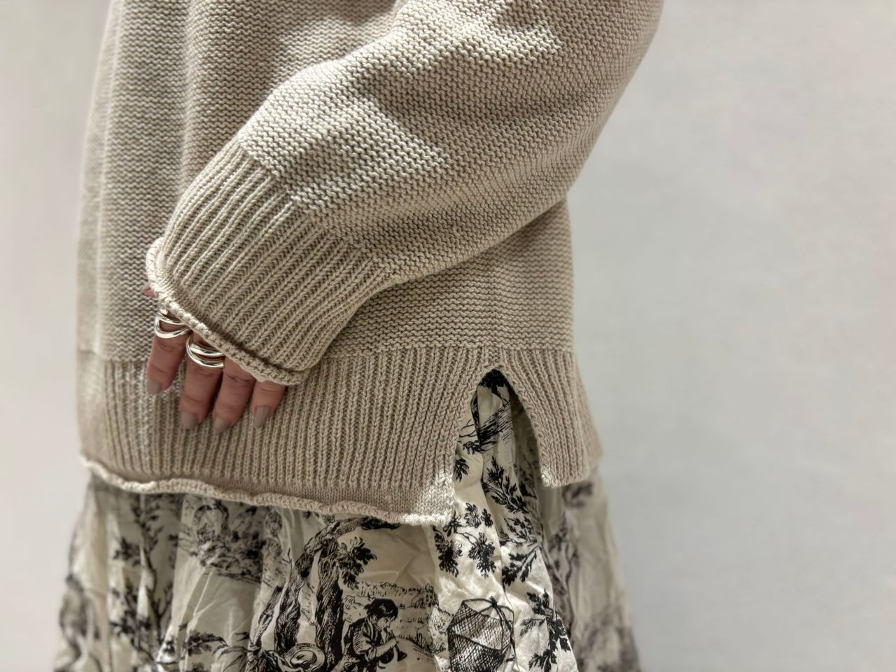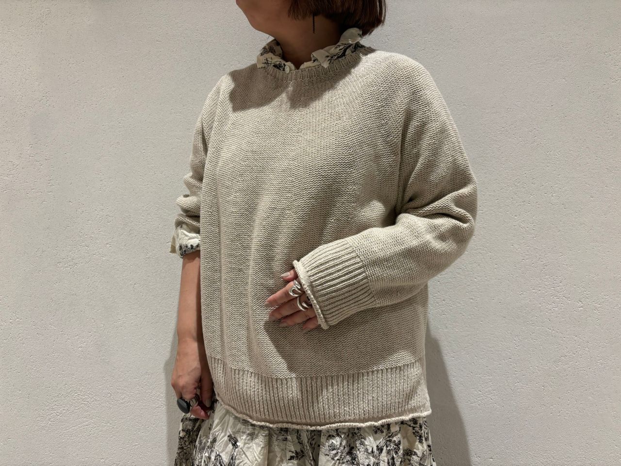 ワンピースと合わせたニットはリネン×ウールMIXにレーヨンを加えた素材。