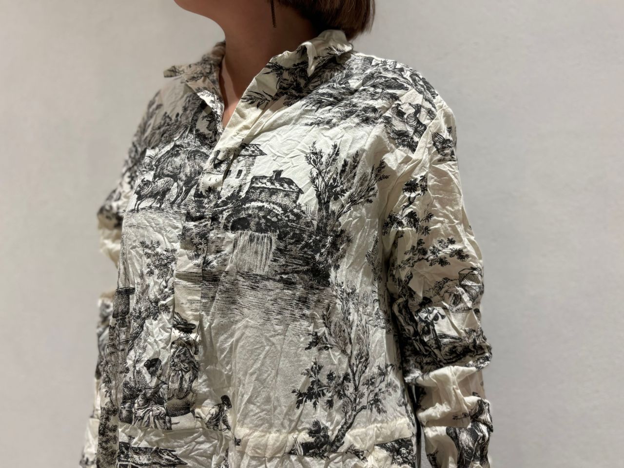 小ぶりな襟と、ワッシャー加工。プリントの存在感を出すため、シルエットはシンプルです。