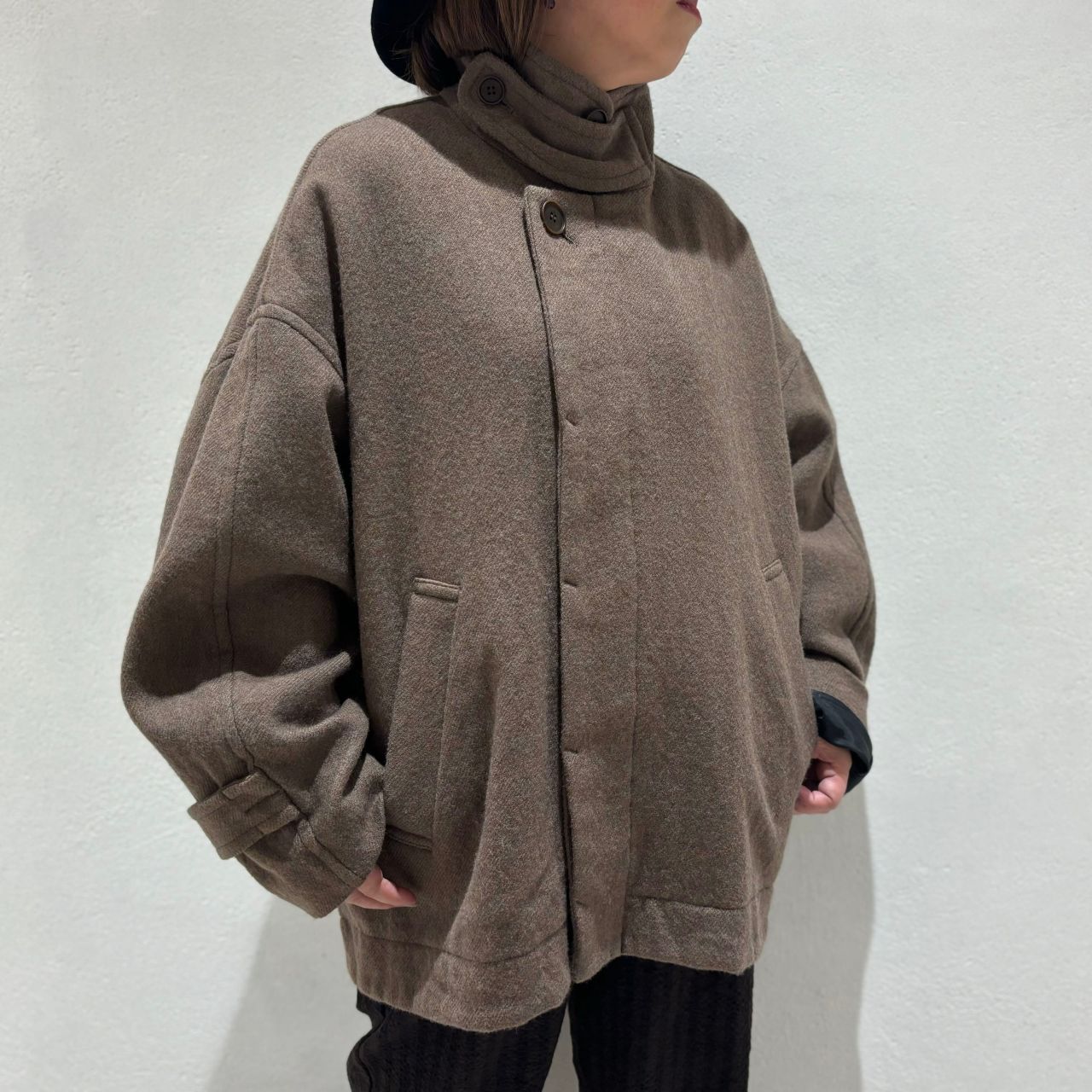 羊に負担をかけずに刈ったウール、ノンミュージングウールを使用したスタンドカラージャケット。