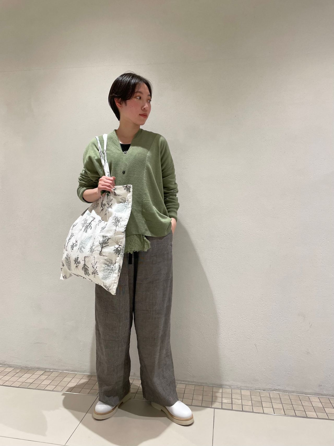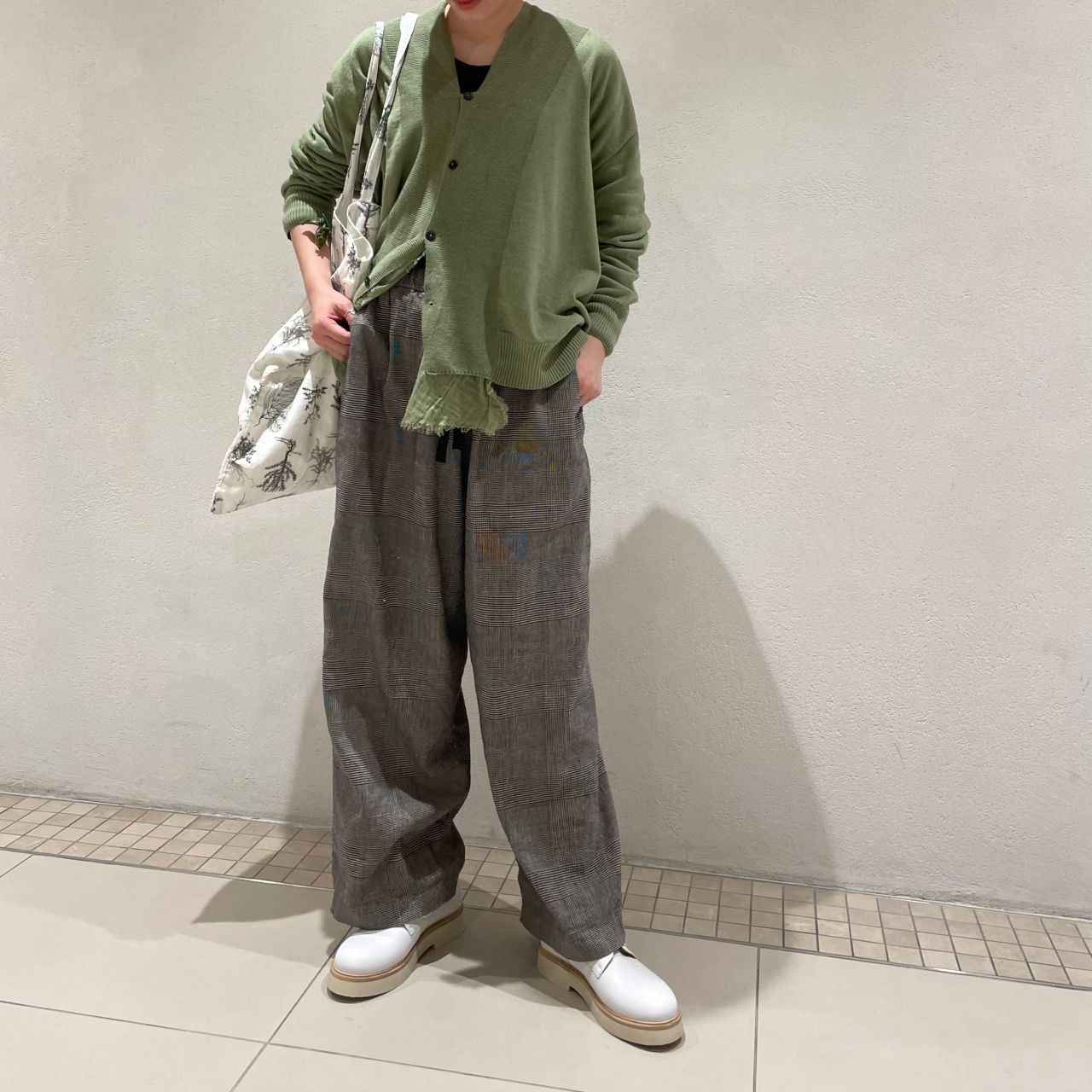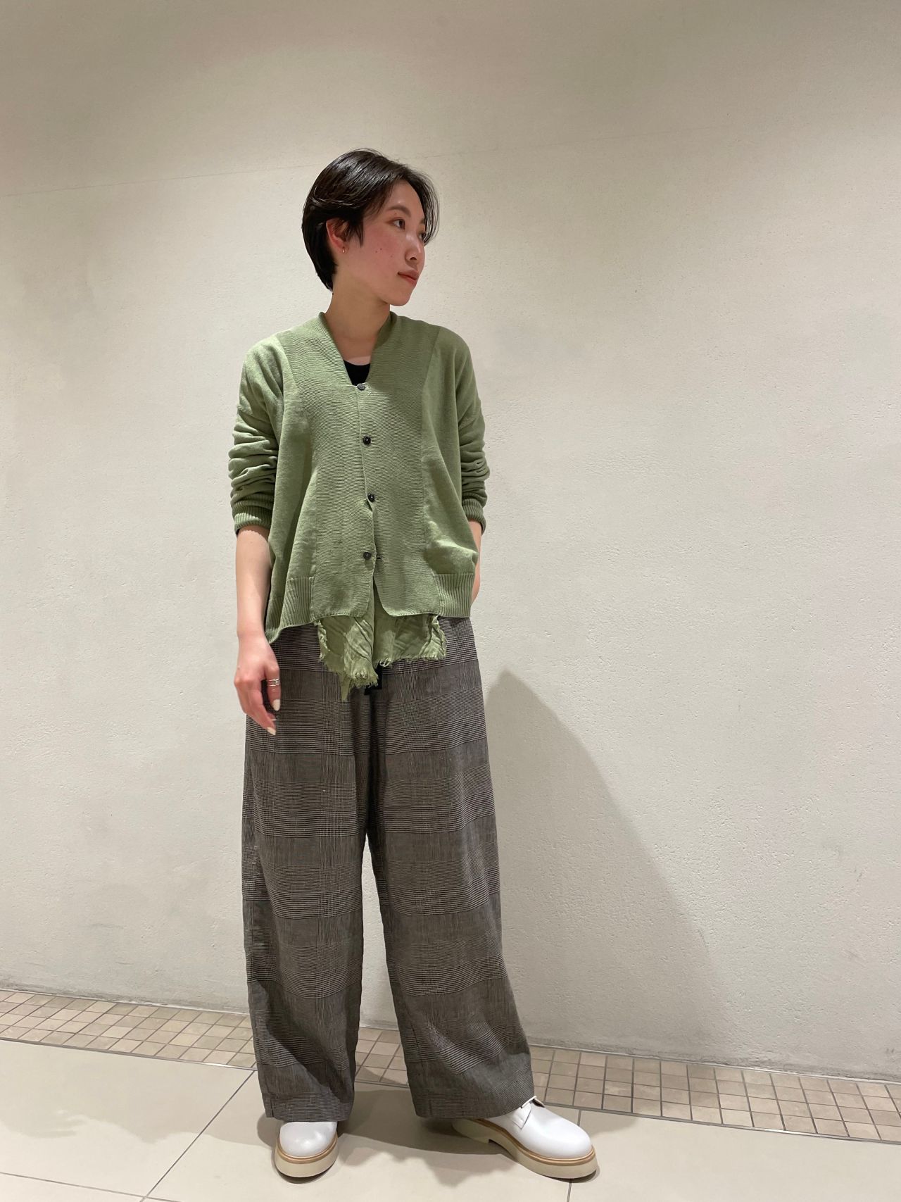 優しいグリーンとグレンチェックのパンツ、ホワイトのレザーシューズで春の軽やかなコーディネートに仕上げました。