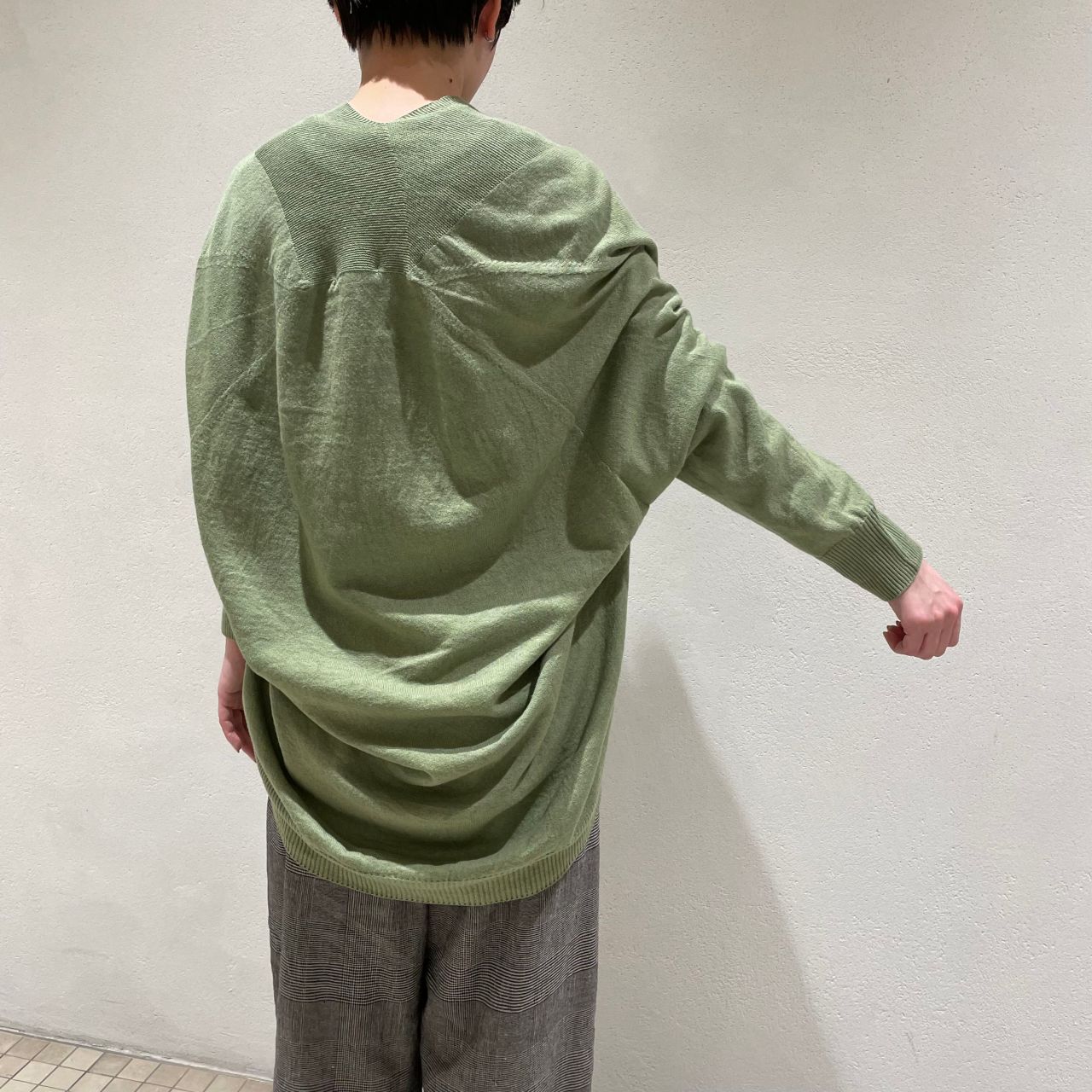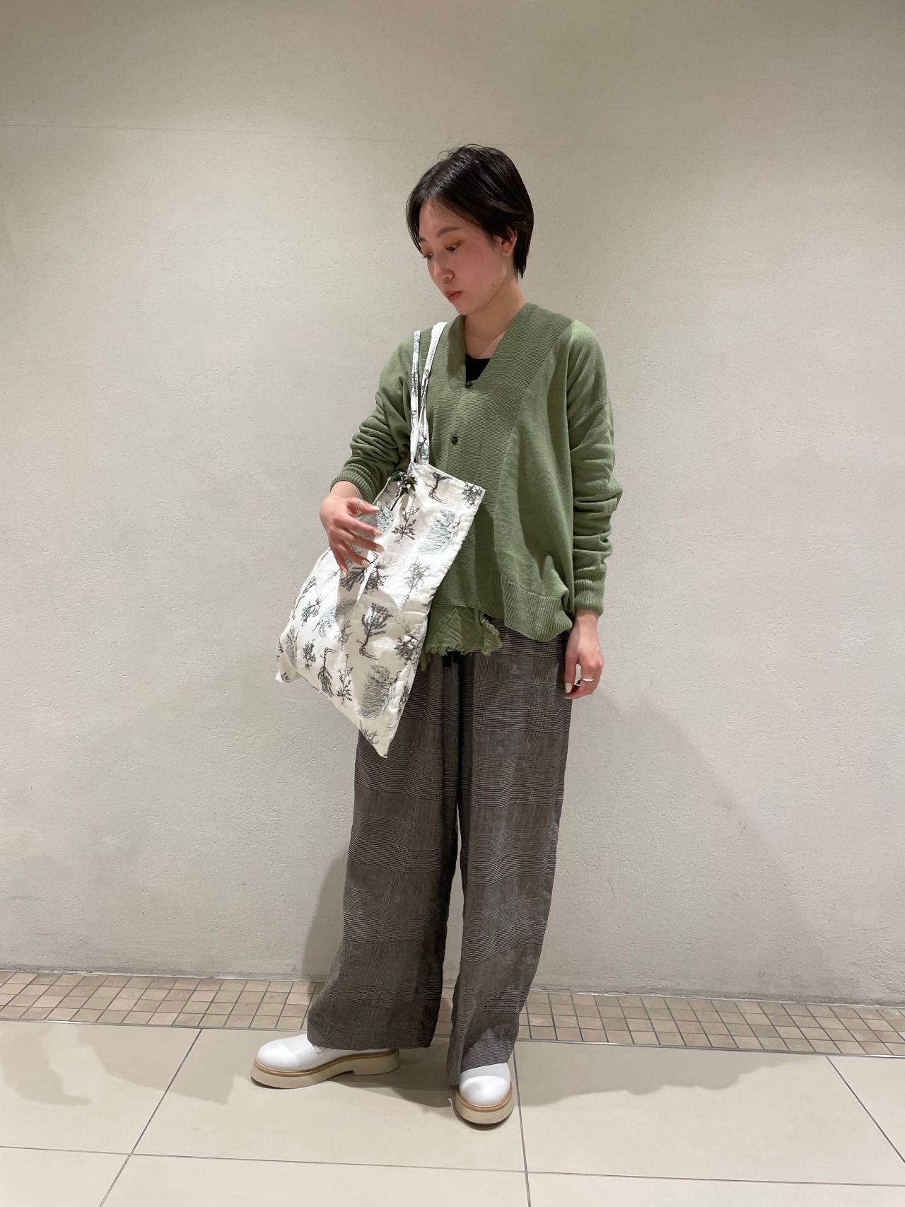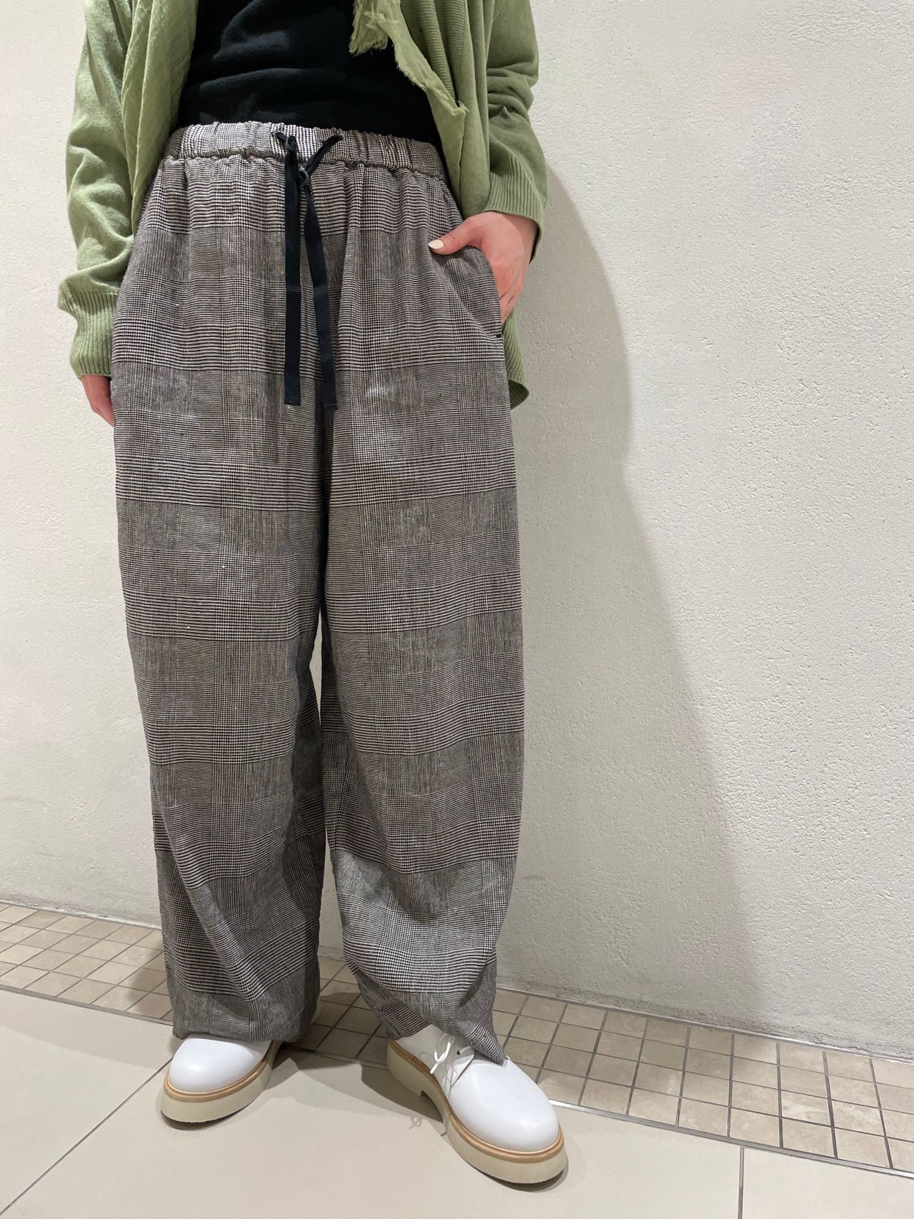 優しいグリーンとグレンチェックのパンツ、ホワイトのレザーシューズで春の軽やかなコーディネートに仕上げました。