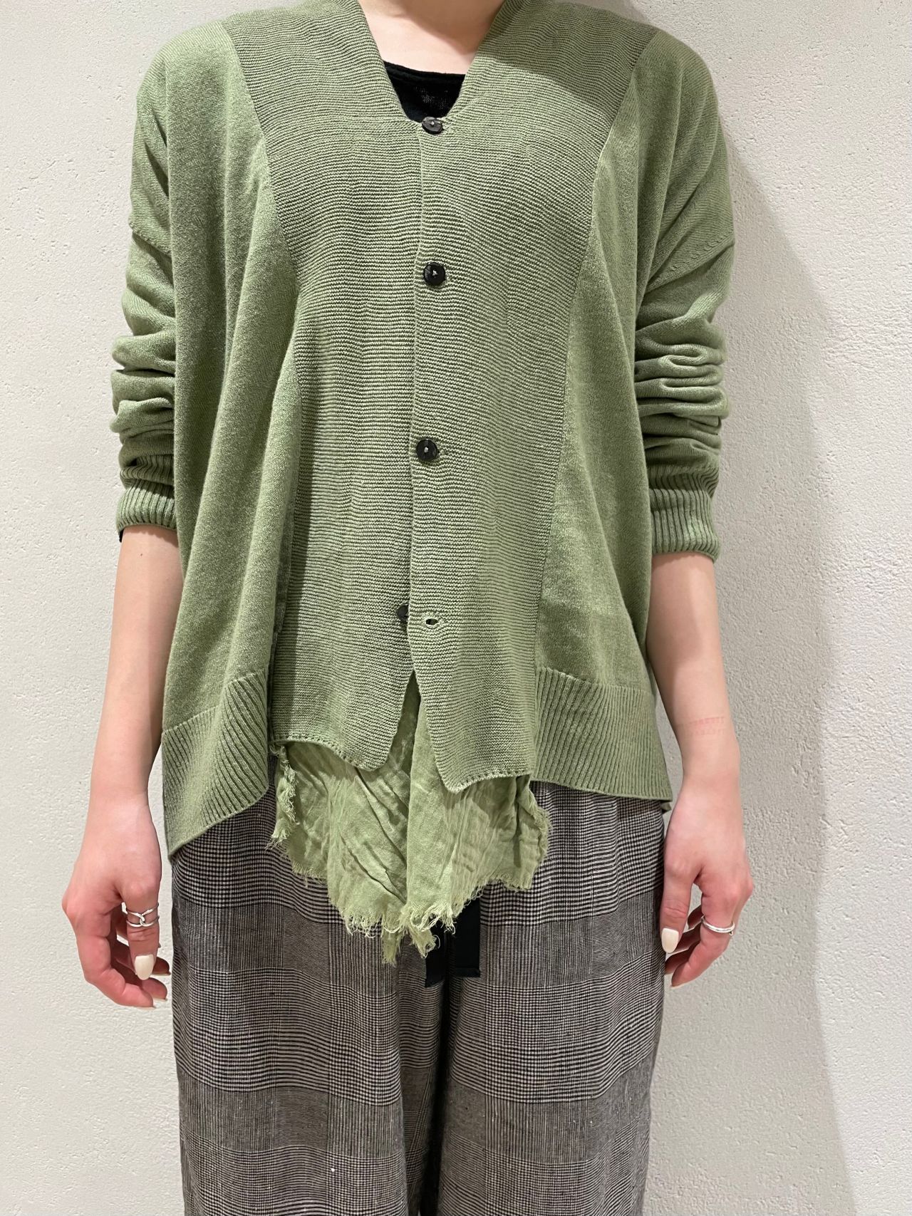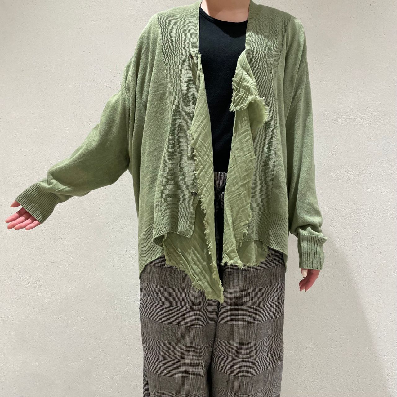 前立て裏に布帛素材のラッフルをあしらった、ニットカーディガン。