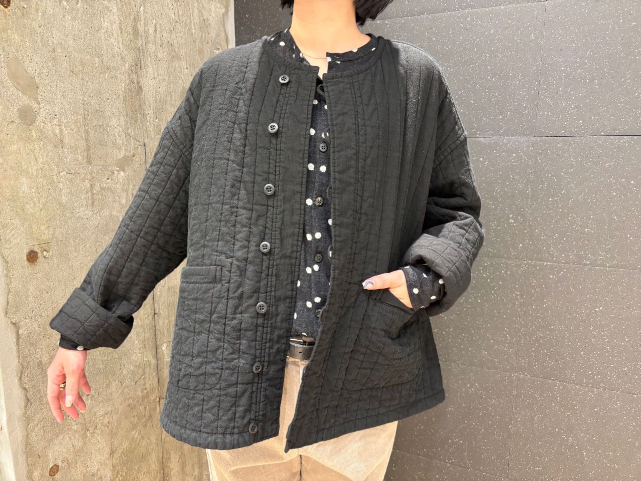 表地は麻50%綿50%で冬はニットと、春先はTシャツやブラウスと合わせて。季節問わずデイリー使いのしやすい一着です。