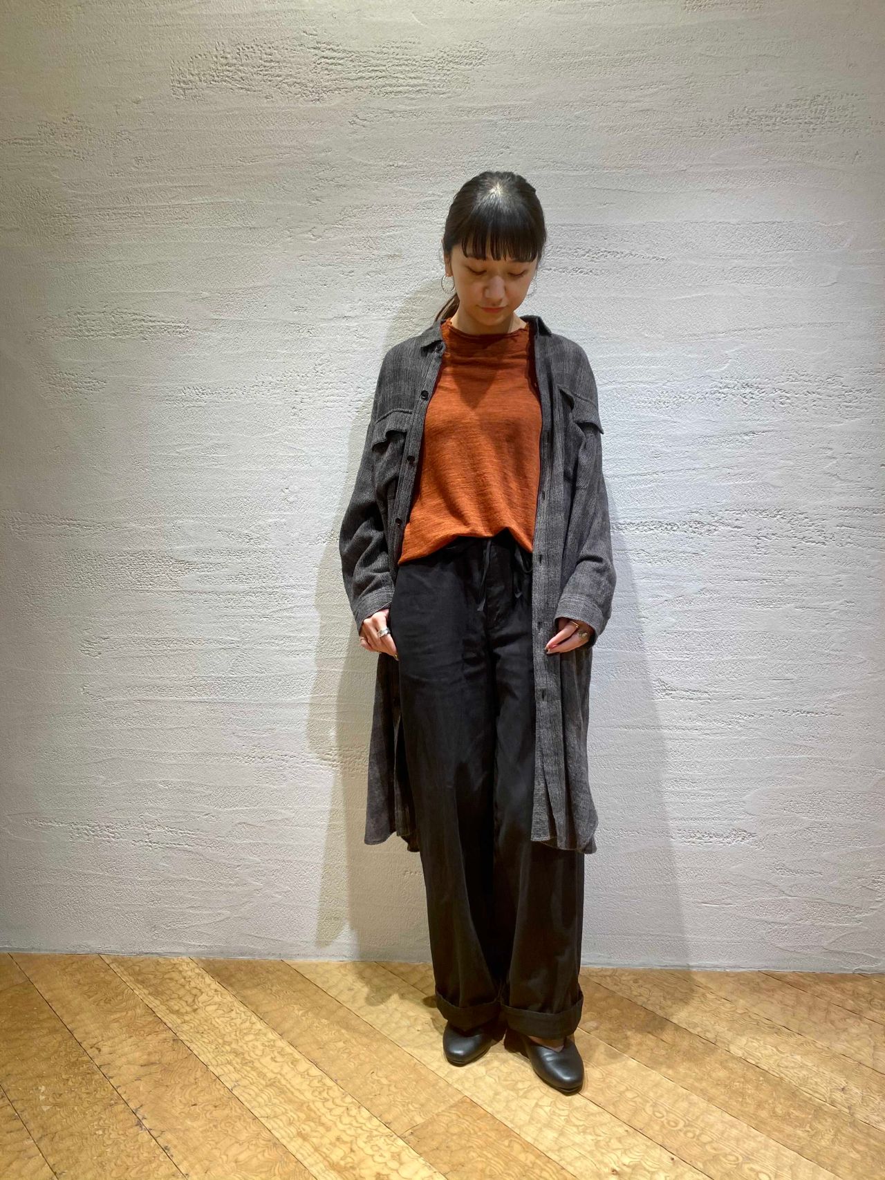 また、ワンピースの前を開けてオレンジメインのコーディネートを楽しんで頂くのもおすすめです。
